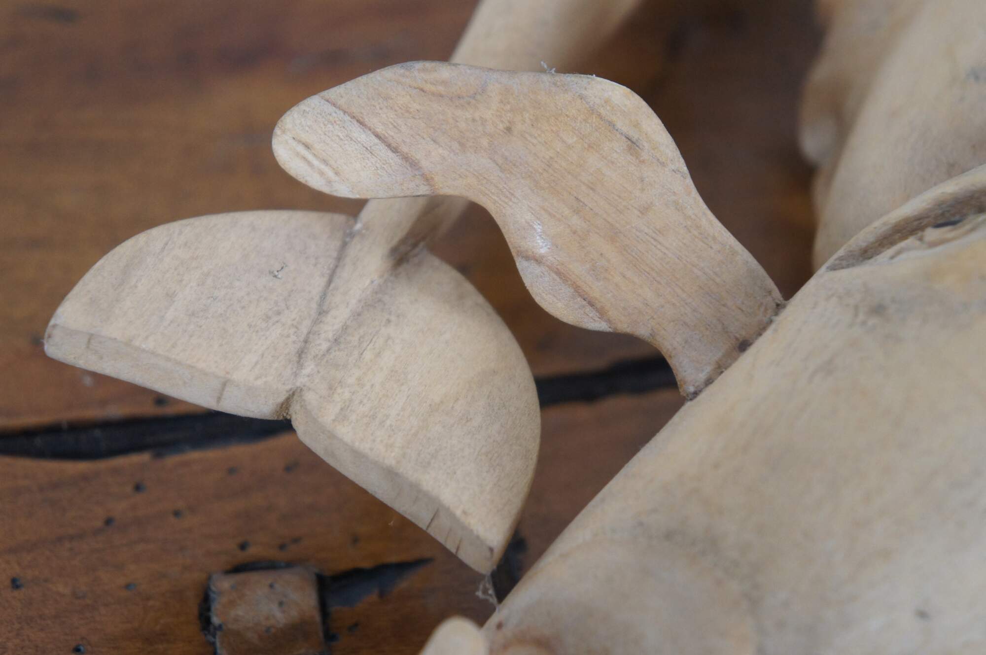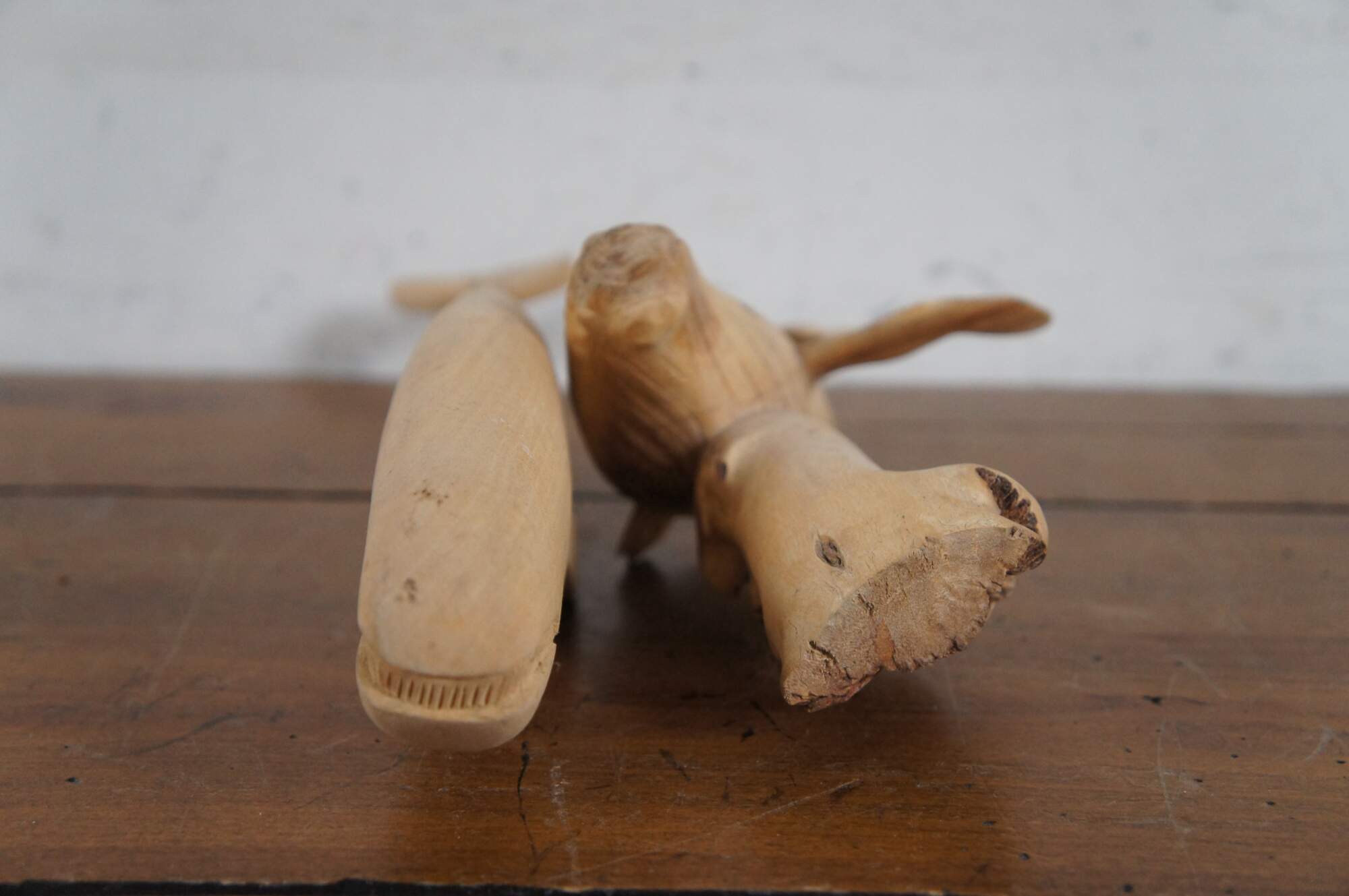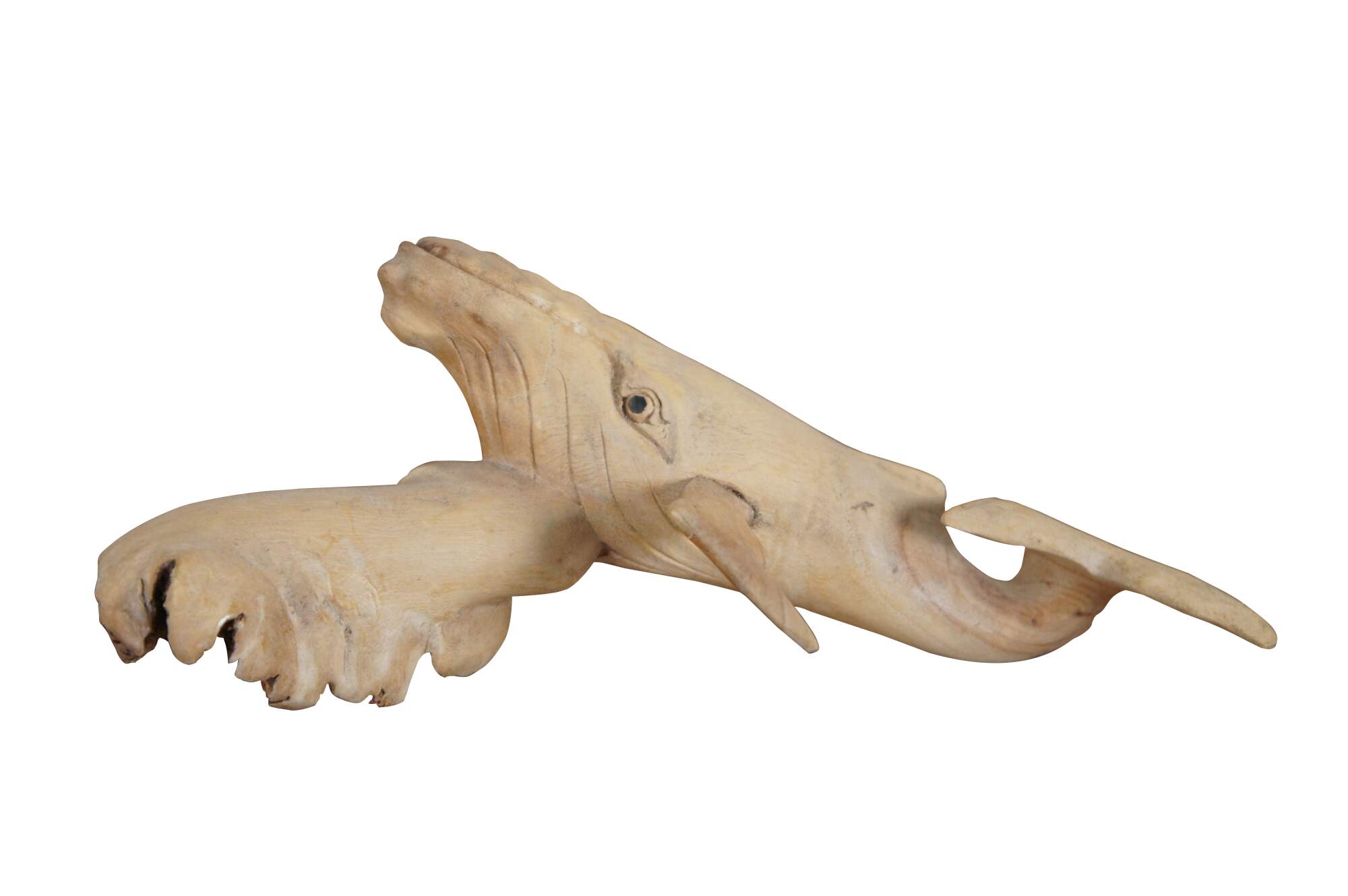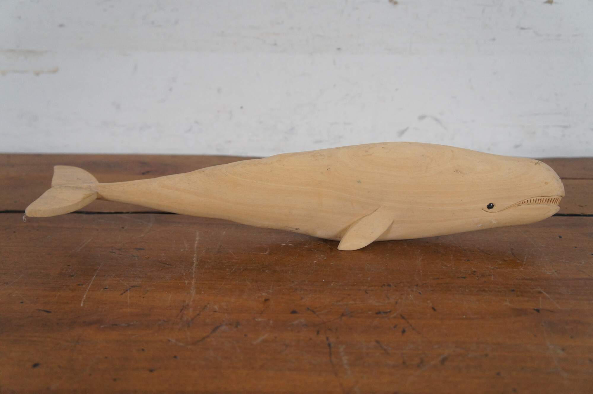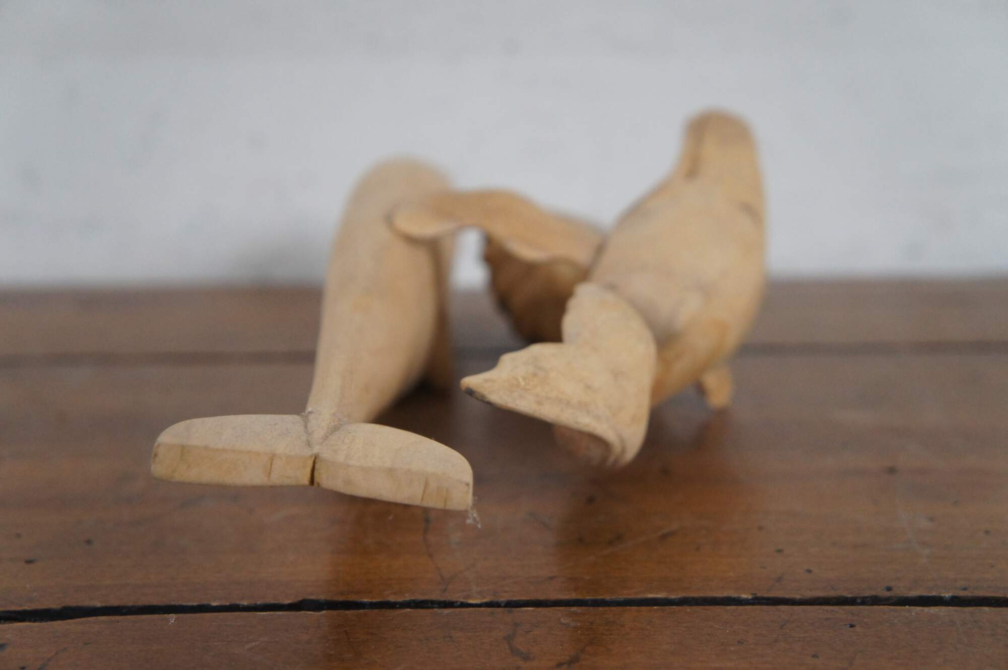 Pair of mid to late 20th century hand carved teak wood whale figurines - one sperm whale with inlaid eyes and one humpback whale perched on a small burl.