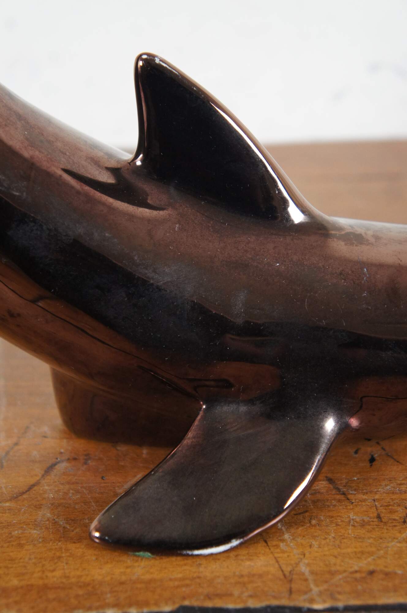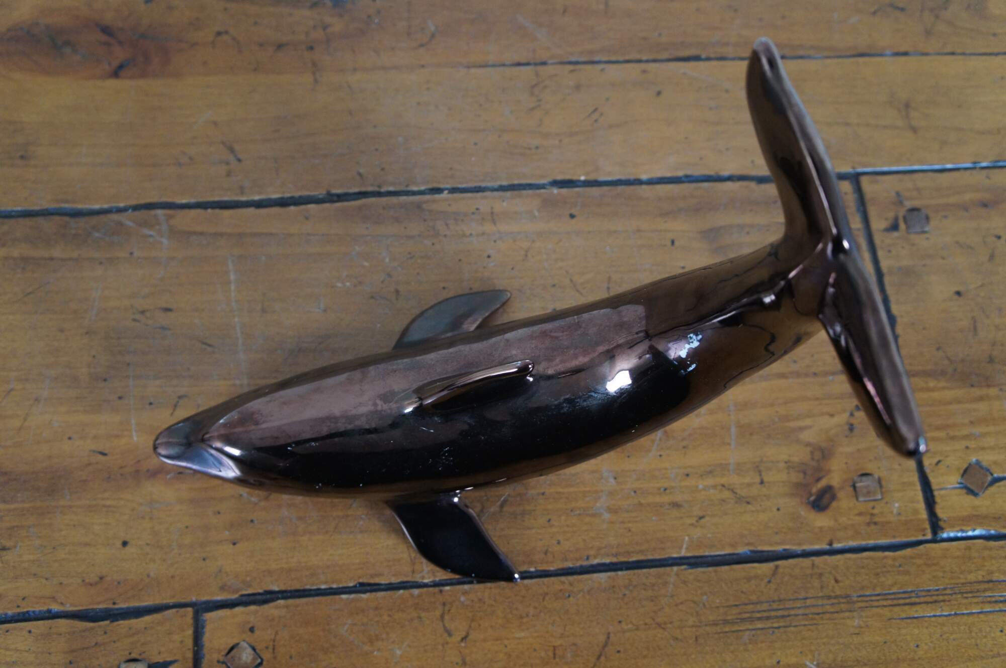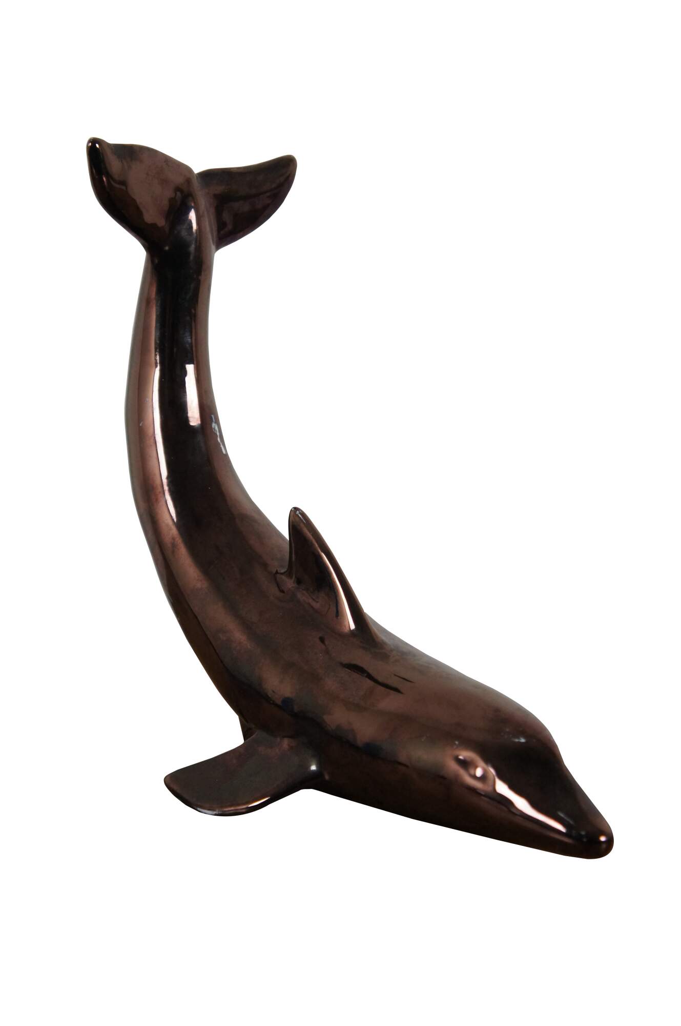 Vintage porcelain sculpture / figurine in the shape of a dolphin with tail in the air, finished in an iridescent / metallic bronze color
