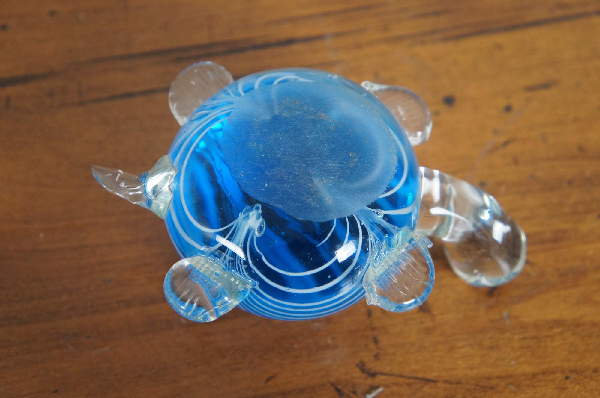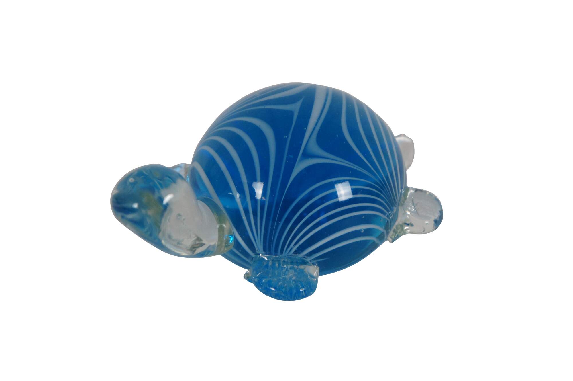 Late 20th century hand blown Murano art glass turtle figurine featuring clear glass limbs and a blue and white swirl shell.