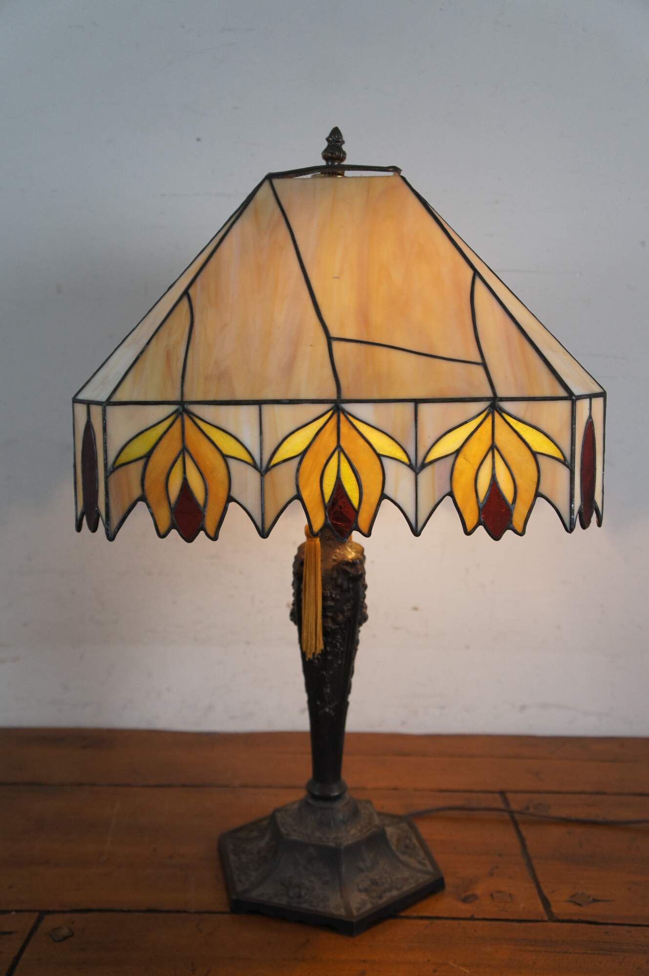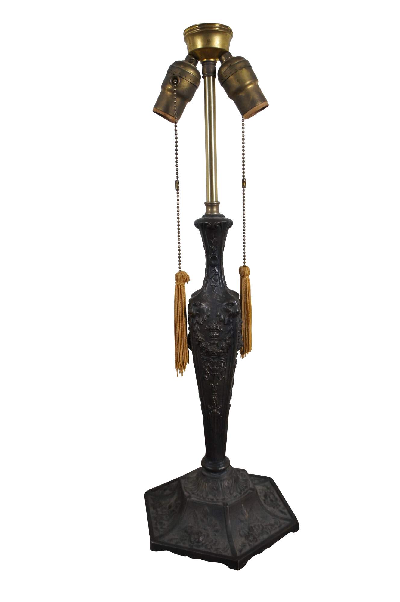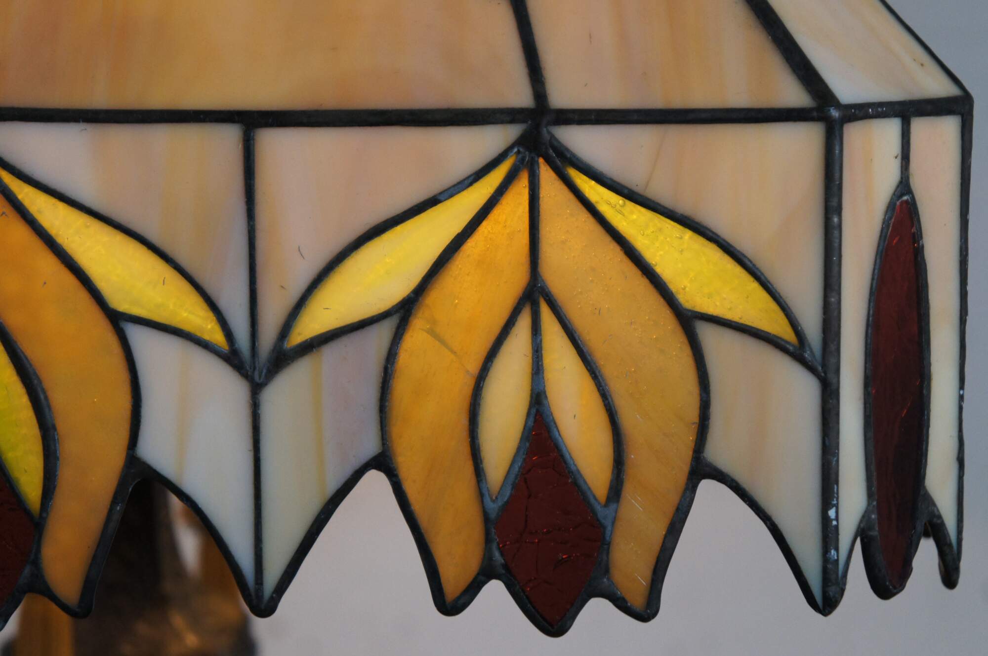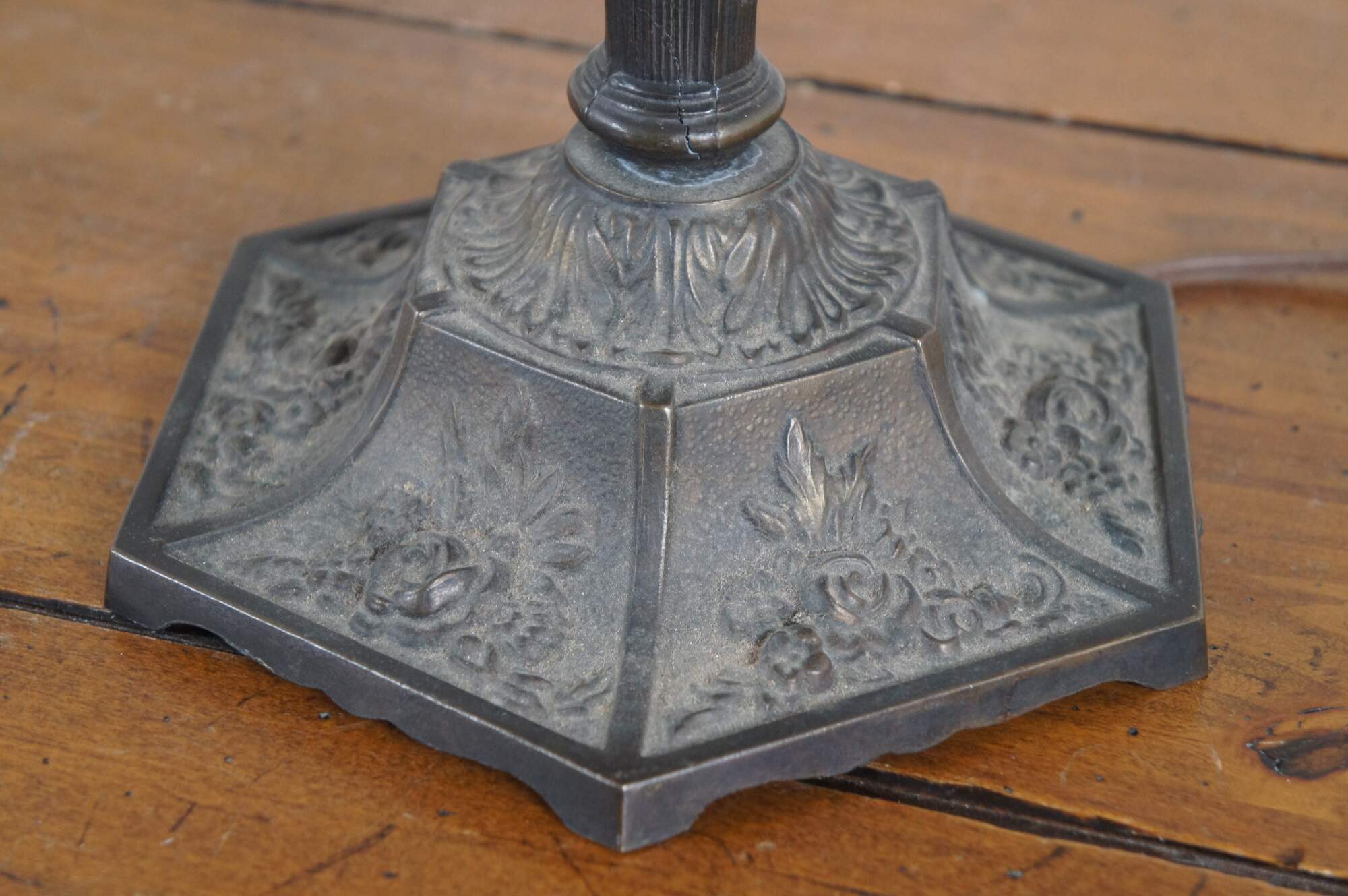 Tiffany style parlor lamp featuring a cast metal base decorated with lion's heads, flowers and vases, and a squared off Art Nouveau style shade featuring a simple edge design of drooping tulips or rosebuds.