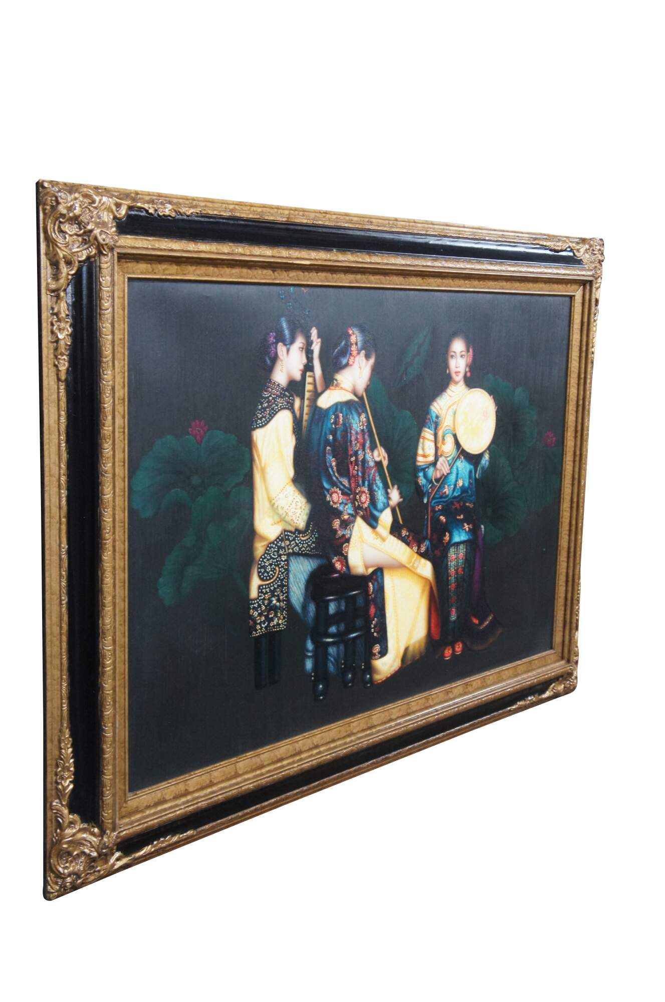 Vintage trio of Chinese woman playing instruments oil painting on canvas after Chen Yifei. Features three young musicians in traditional court attire playing various instruments.
