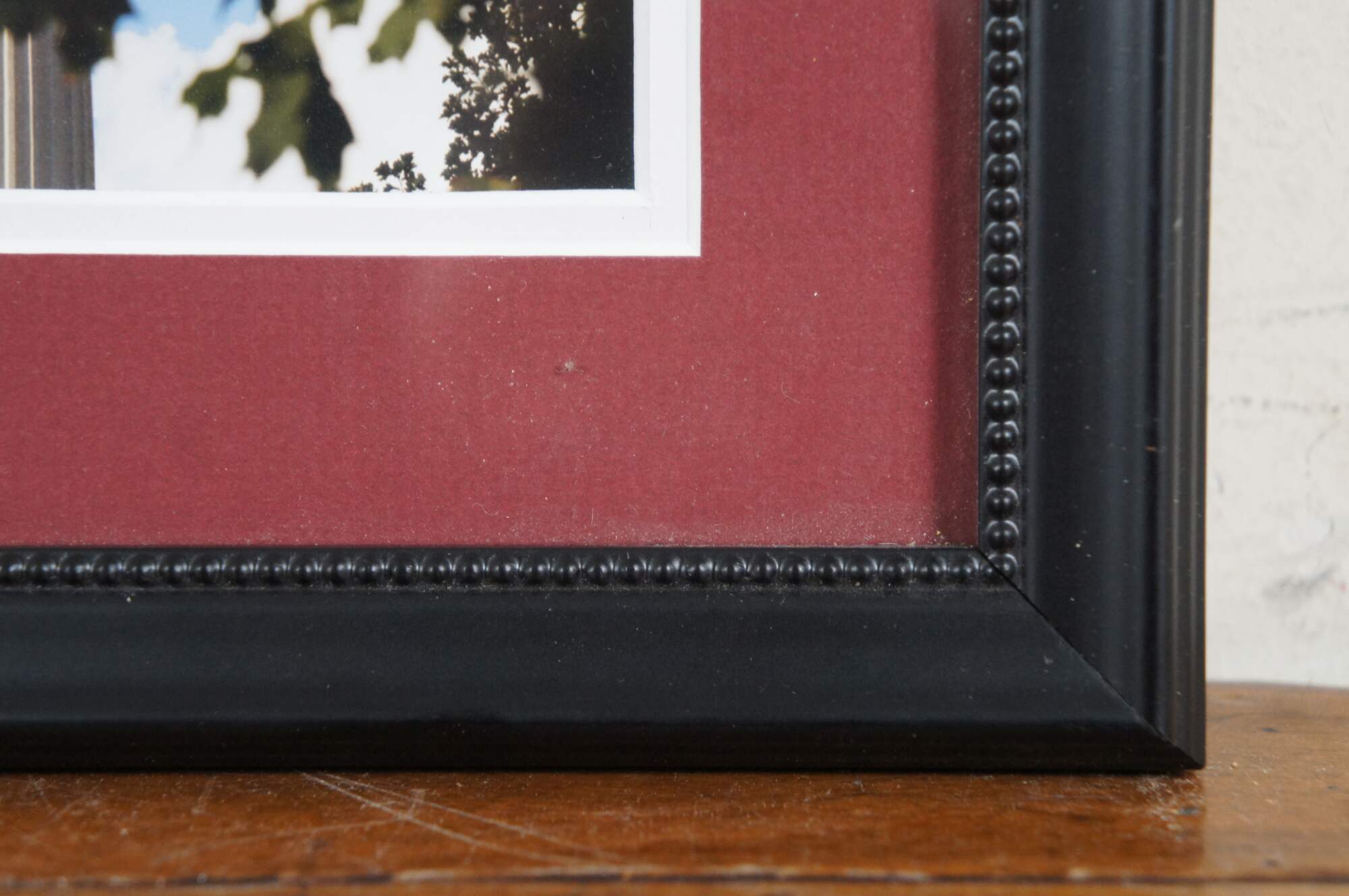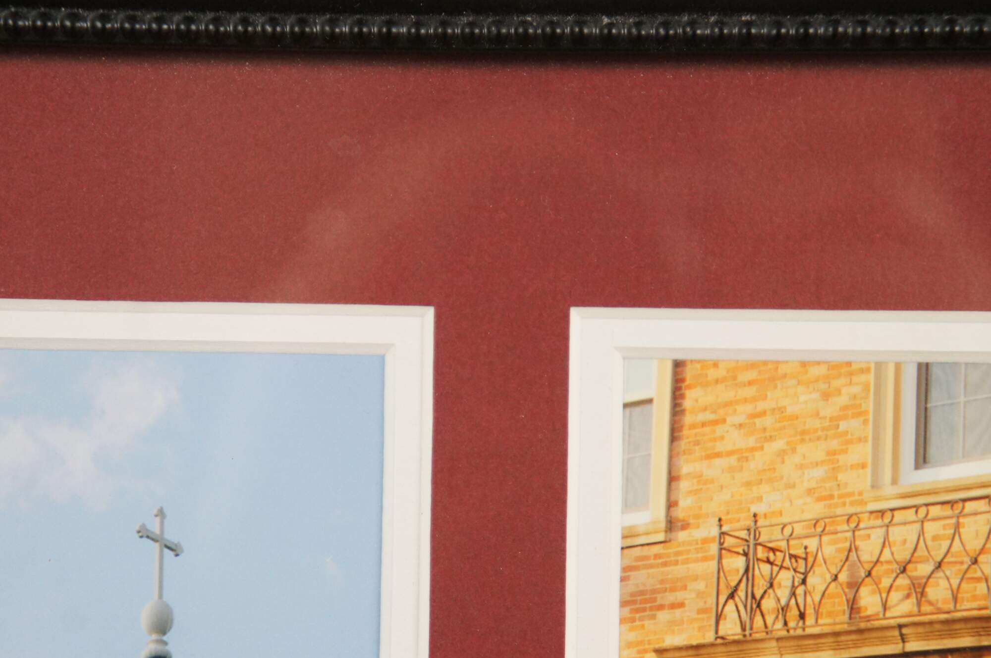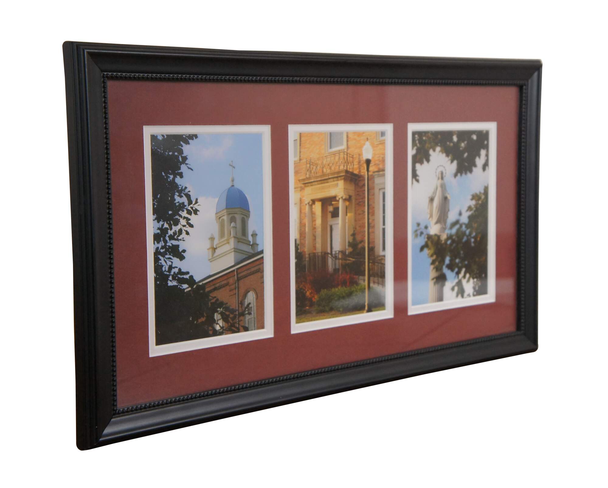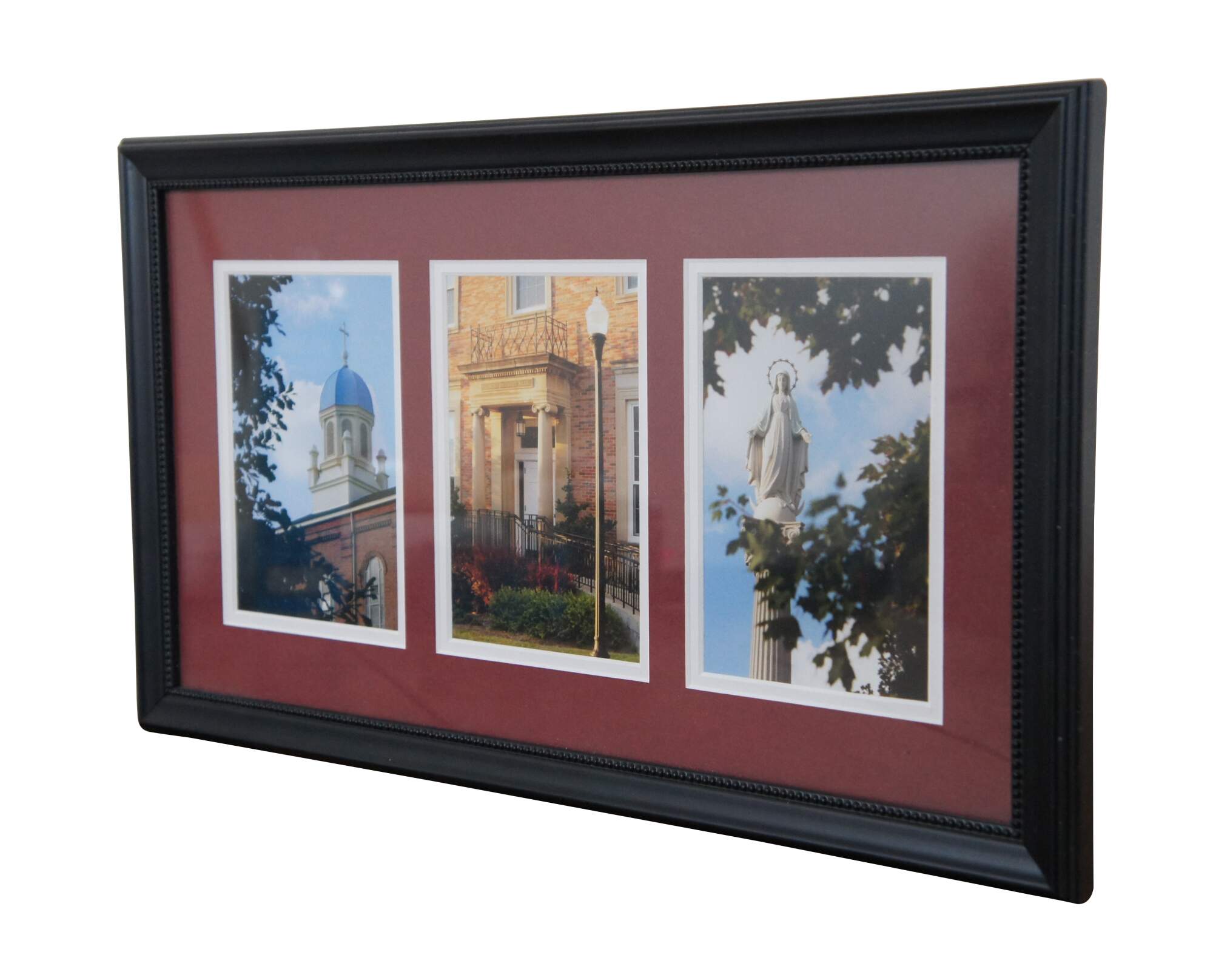 Neatly framed triptych of photographs of sites at the University of Dayton, Ohio campus including the dome of the Chapel of the Immaculate Conception, the porch of Albert Emmanuel Hall, and the statue of the Virgin Mary that stands between St. Mary's Hall and Roesch Library. Burgundy and white double mat. Dark wood beveled frame with beaded edge.