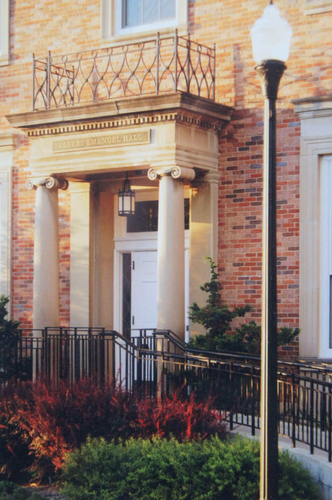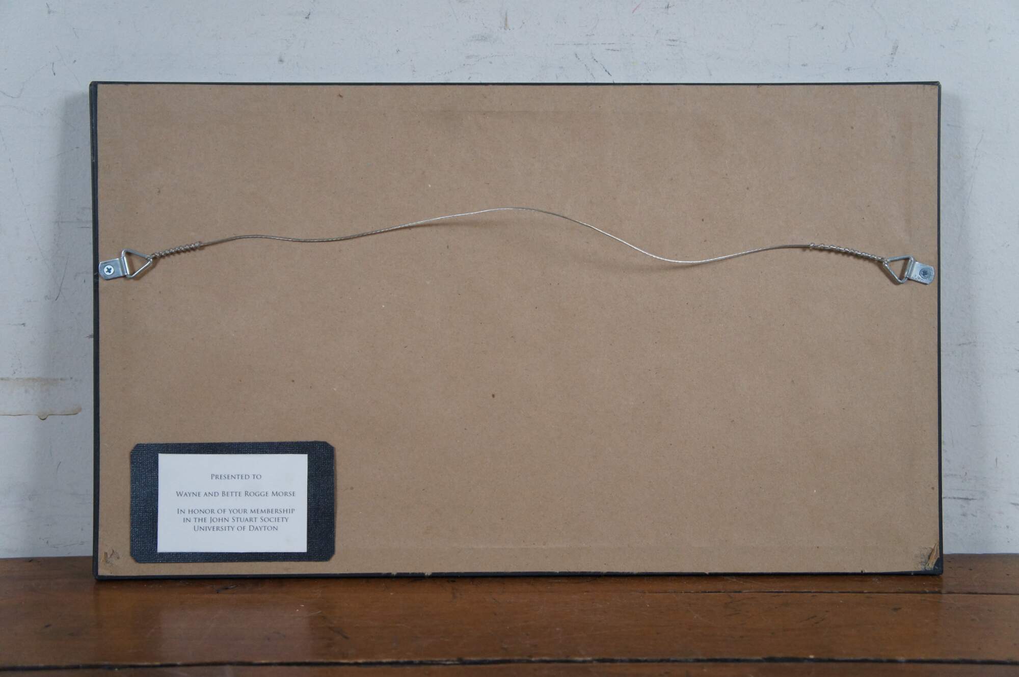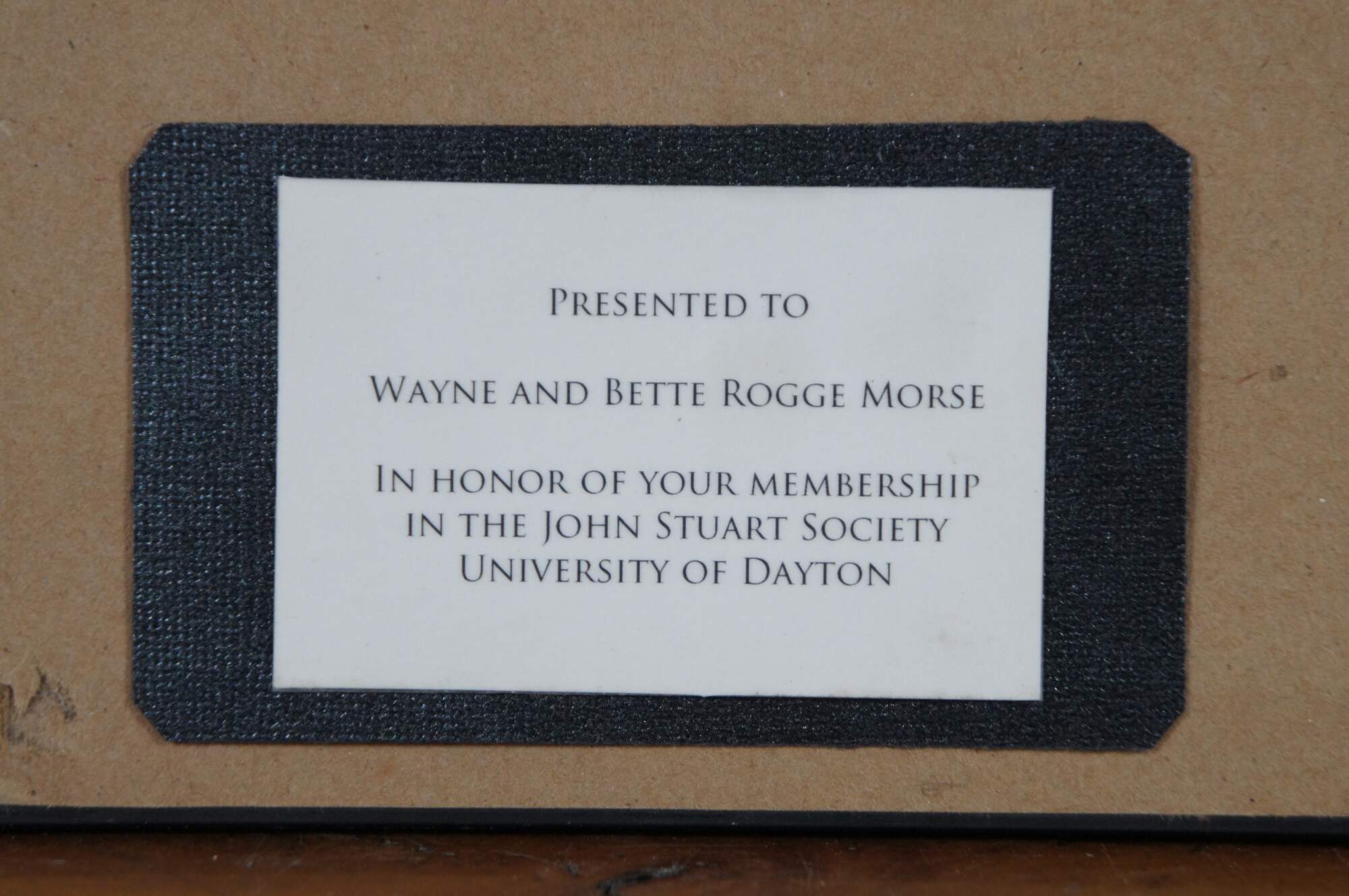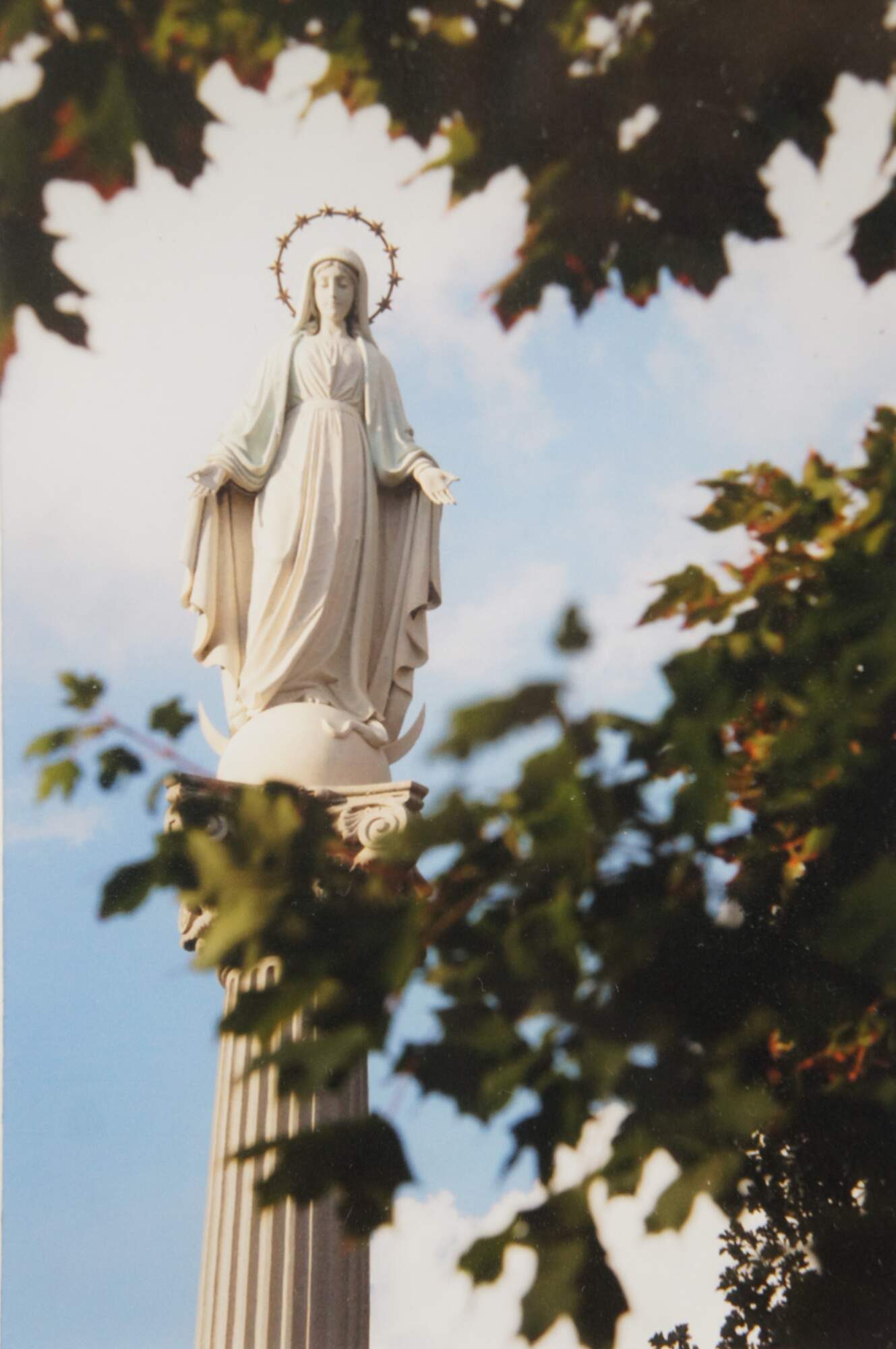 Neatly framed triptych of photographs of sites at the University of Dayton, Ohio campus including the dome of the Chapel of the Immaculate Conception, the porch of Albert Emmanuel Hall, and the statue of the Virgin Mary that stands between St. Mary's Hall and Roesch Library. Burgundy and white double mat. Dark wood beveled frame with beaded edge.