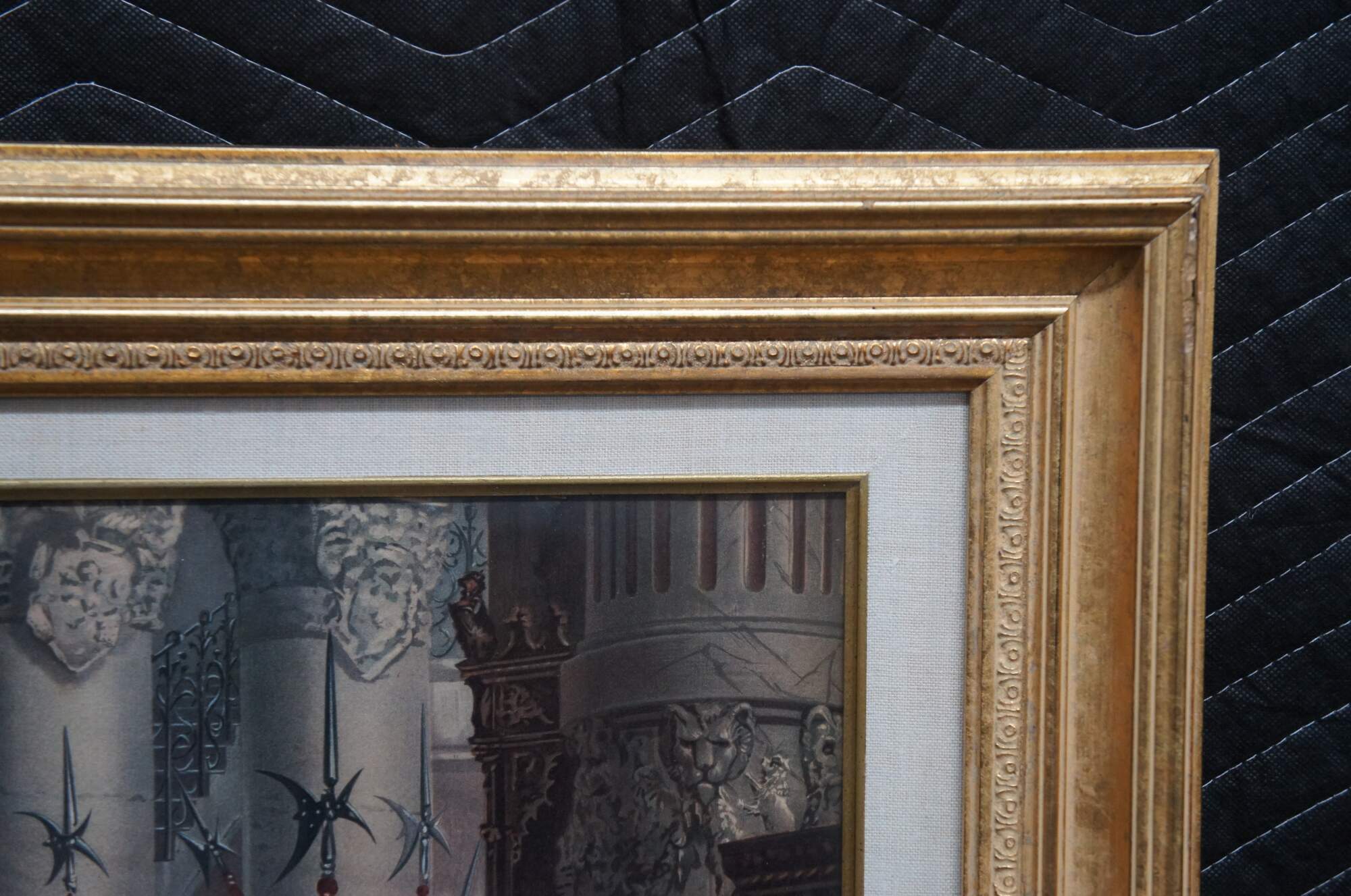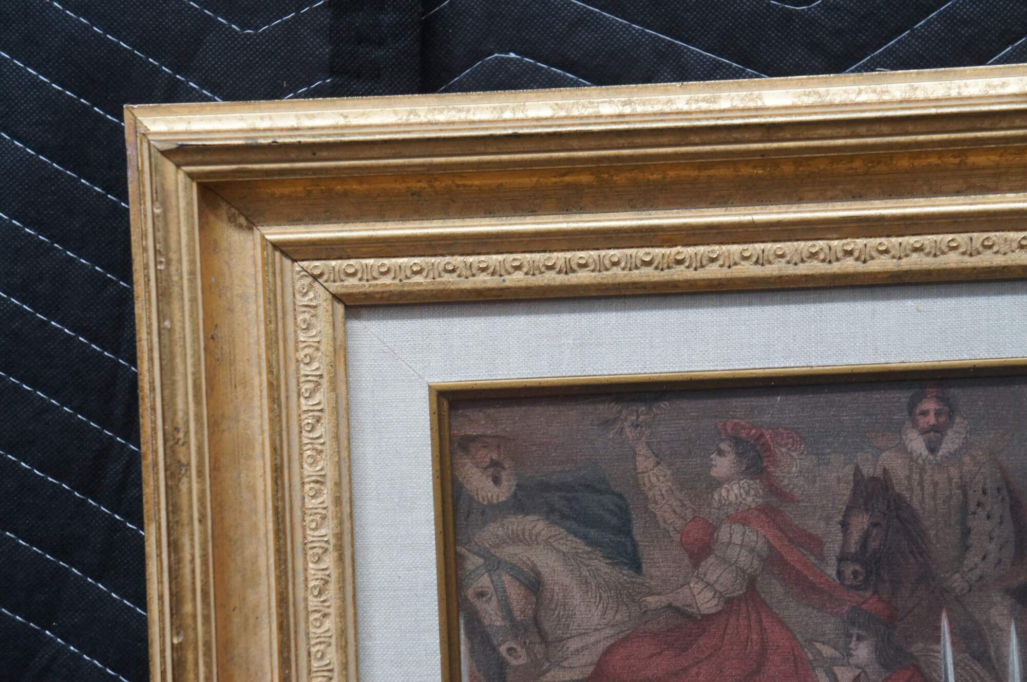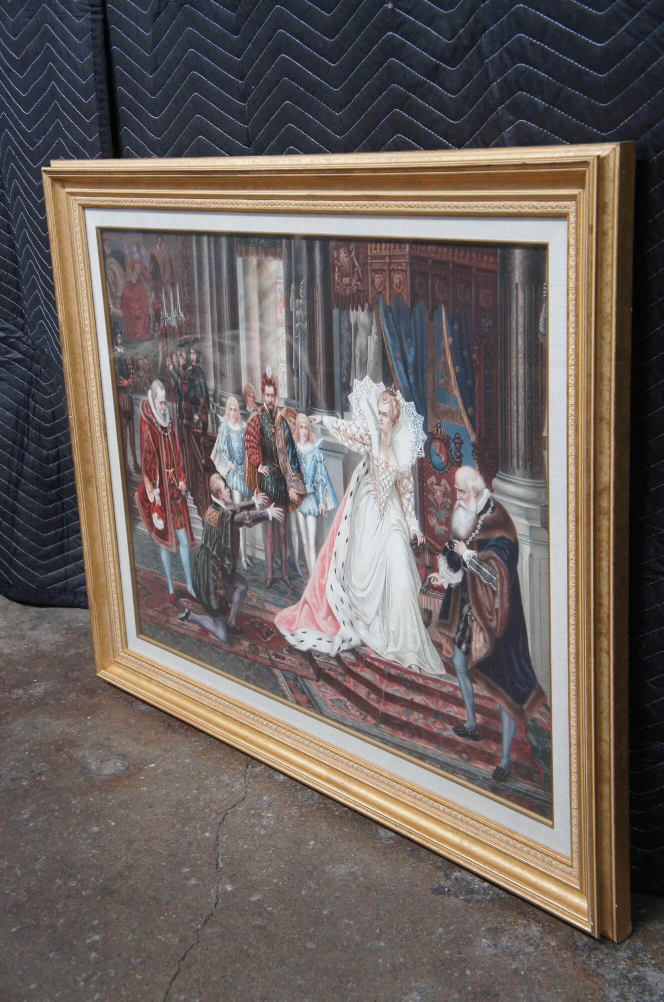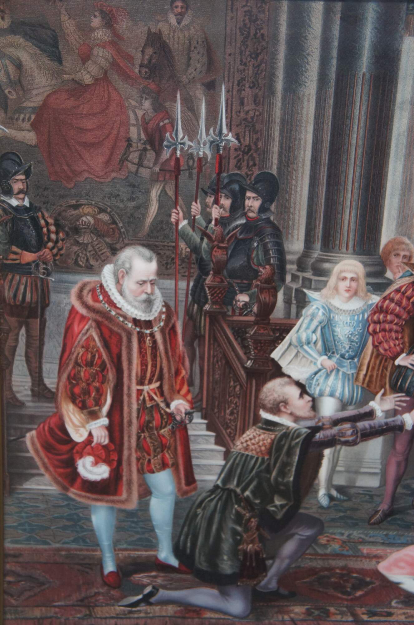 Two vintage Elizabethan court scene prints. One features Queen Elizabeth banishing a peasant, while the other features praying clergy and weeping women. The elaborate attire and decor of the 16th century is on full display with rugs, tapestries, art, sculpture and treasures adorning the walls and floors of the magnificent interior. Heraldic crests / coats of arms decorate the furniture, while the men and women of high status display elaborate jewels and soldiers hold spears and swords to enforce order.