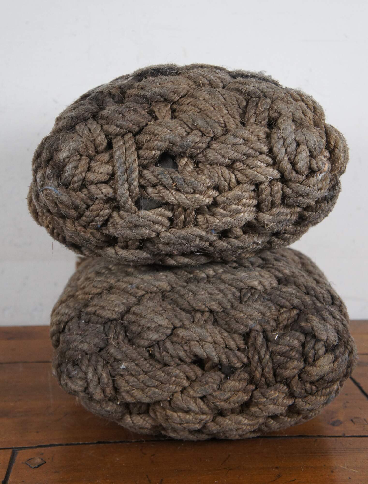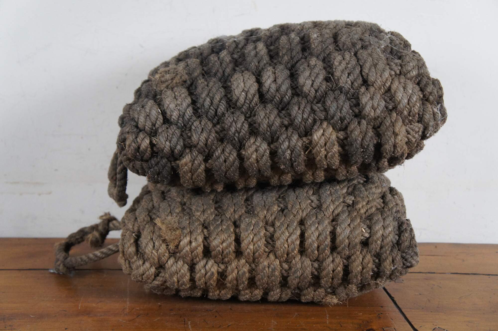 Pair of early 20th century boat bumpers / fenders, rectagnular shape woven from natural hemp rope with handle.