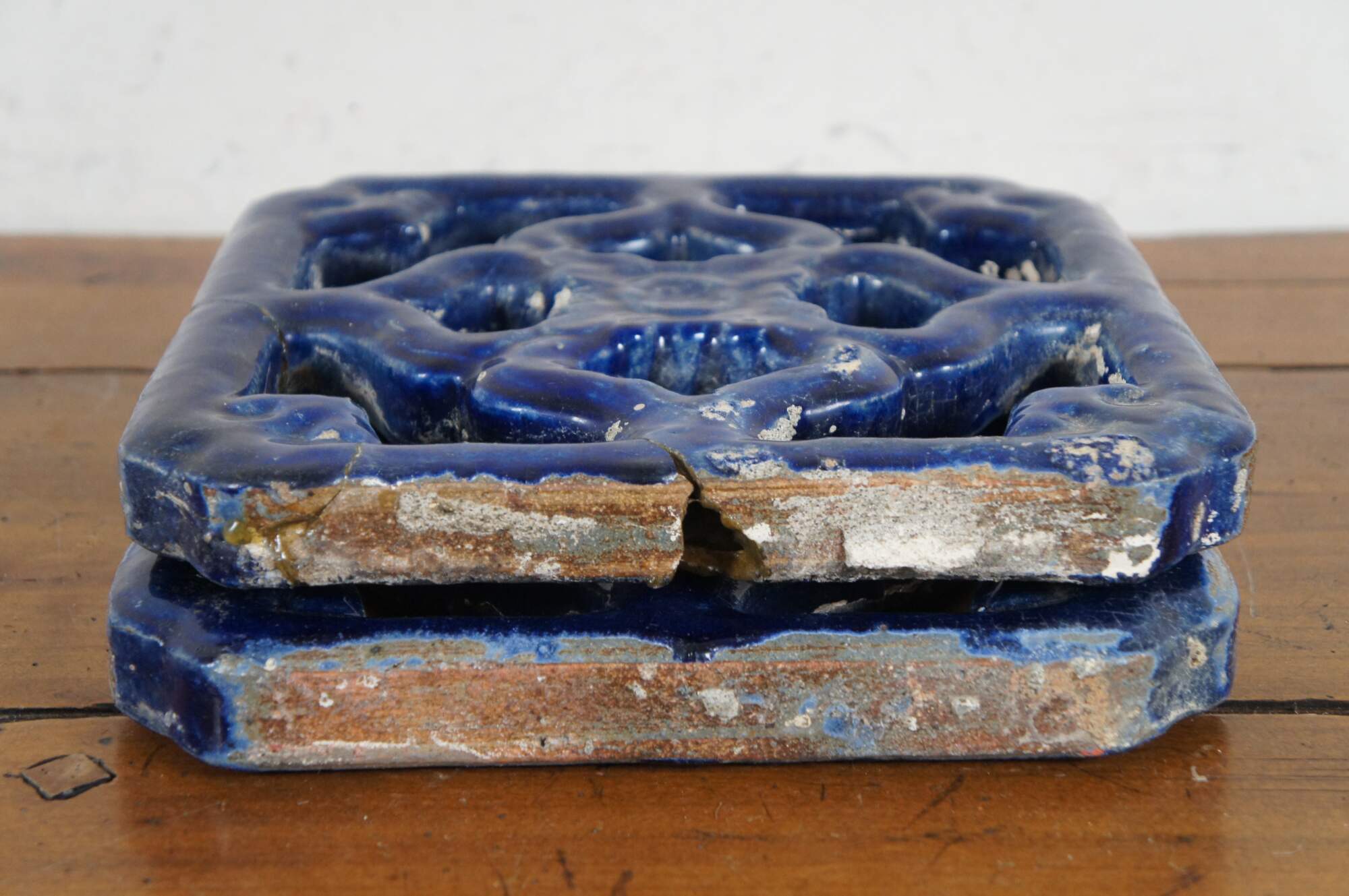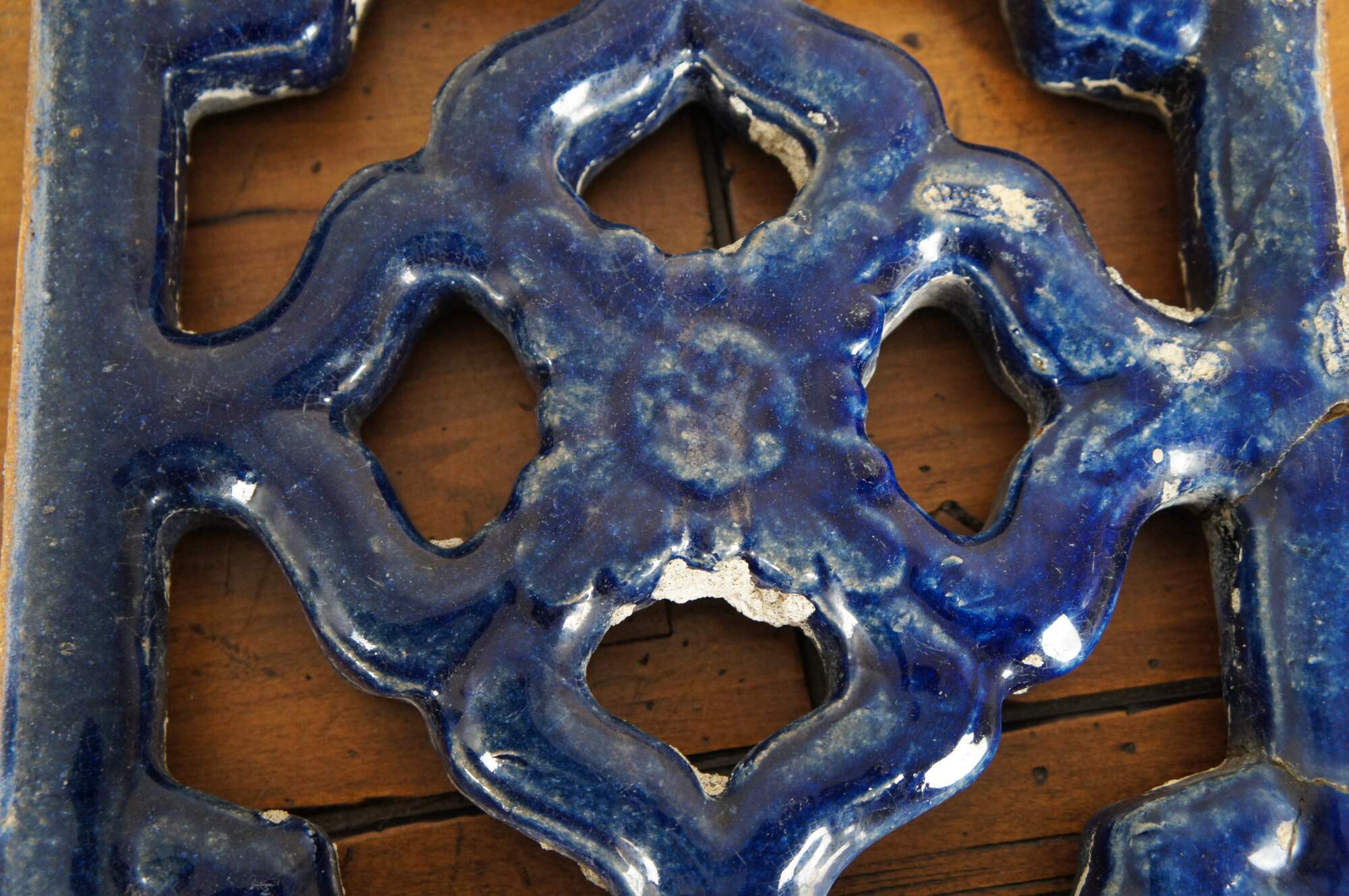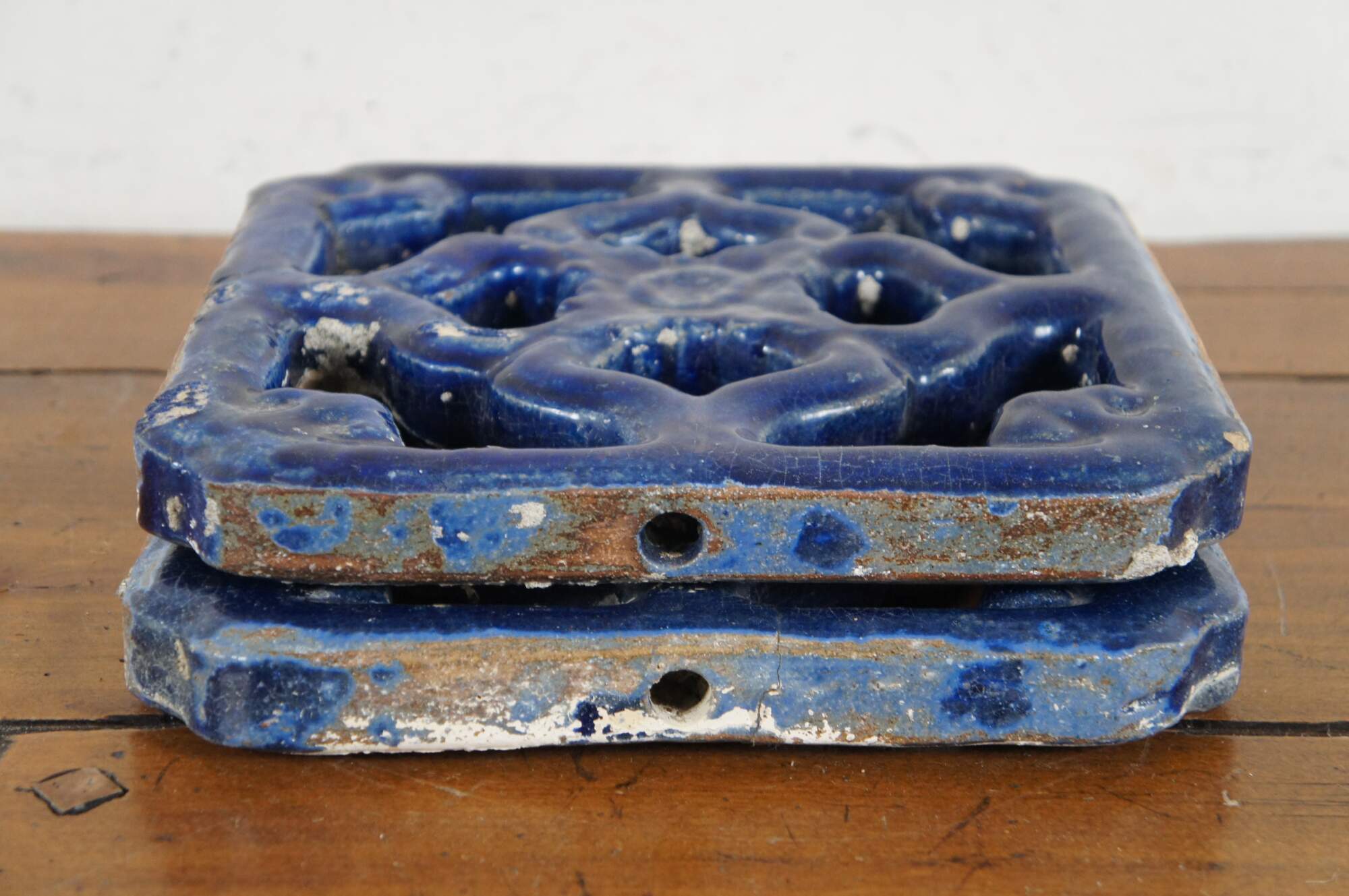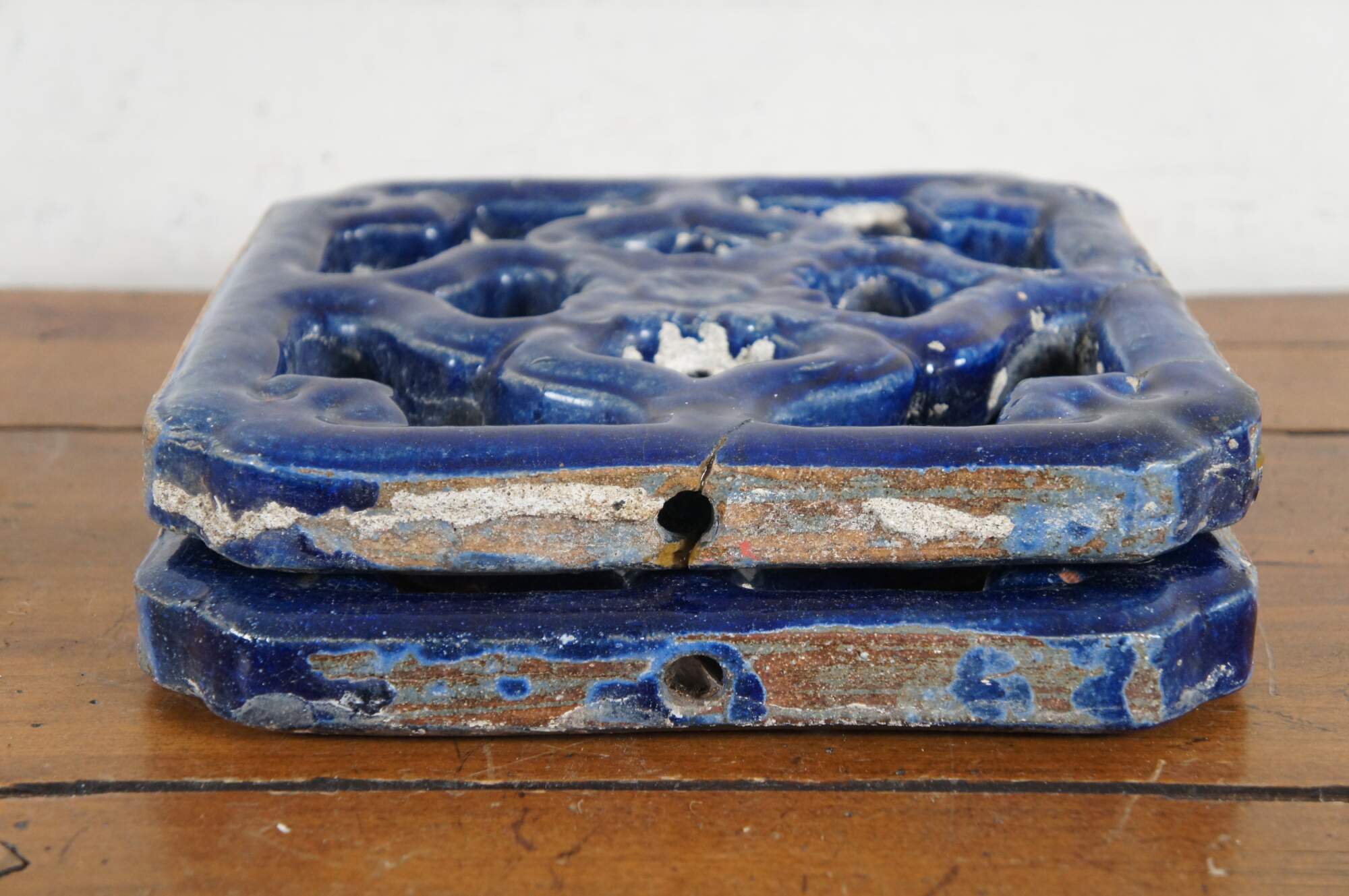 Pair of vintage pierced floral ceramic blue glazed vent / grille tiles.