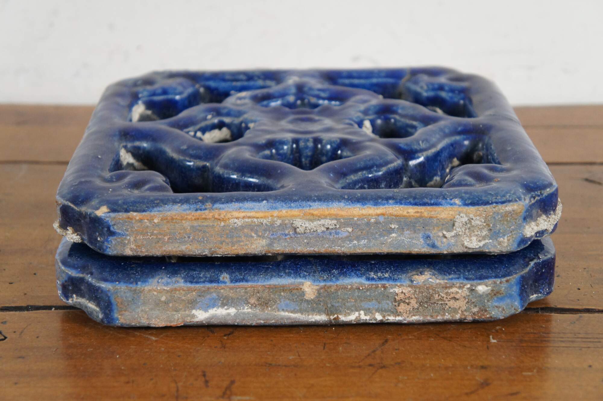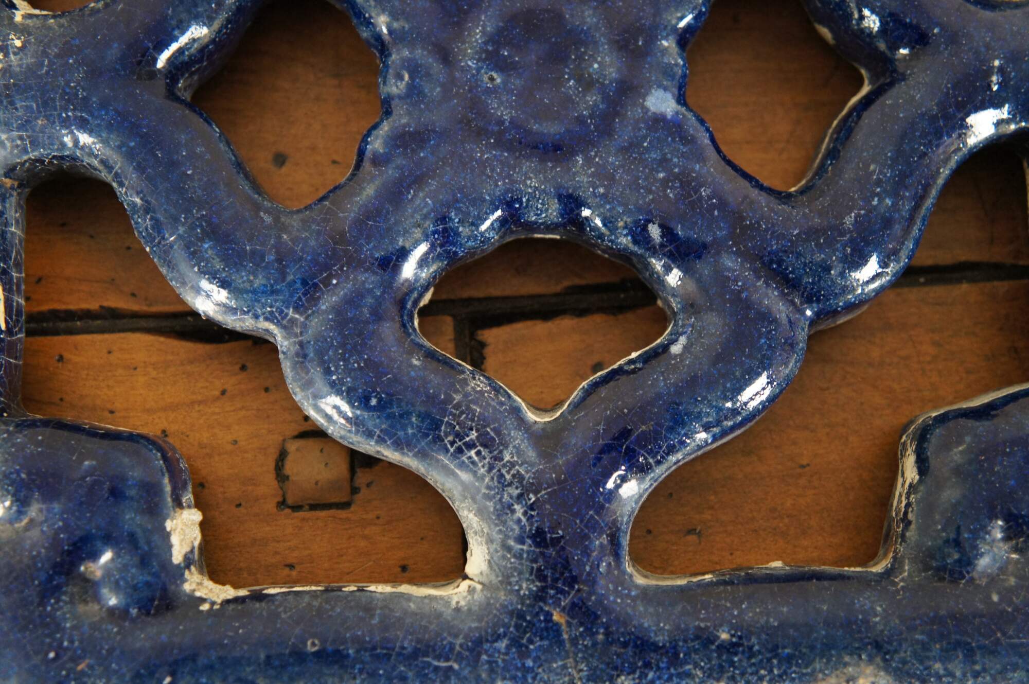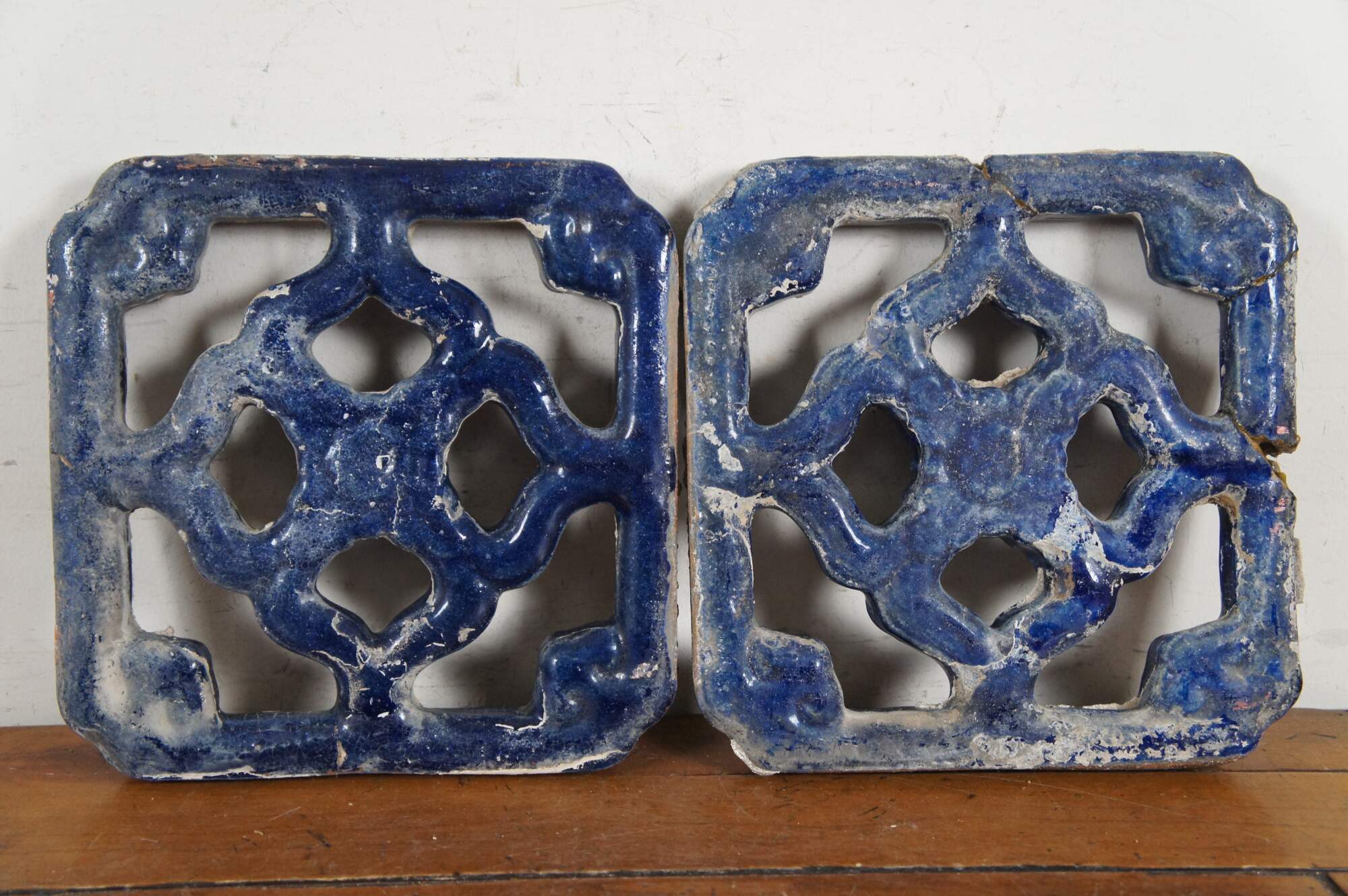 Pair of vintage pierced floral ceramic blue glazed vent / grille tiles.