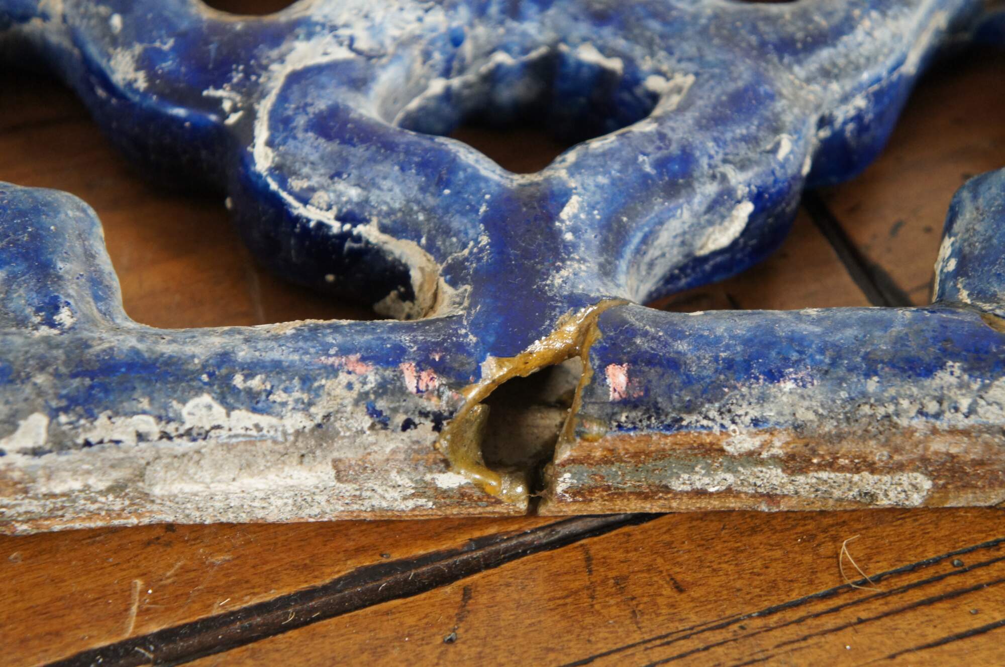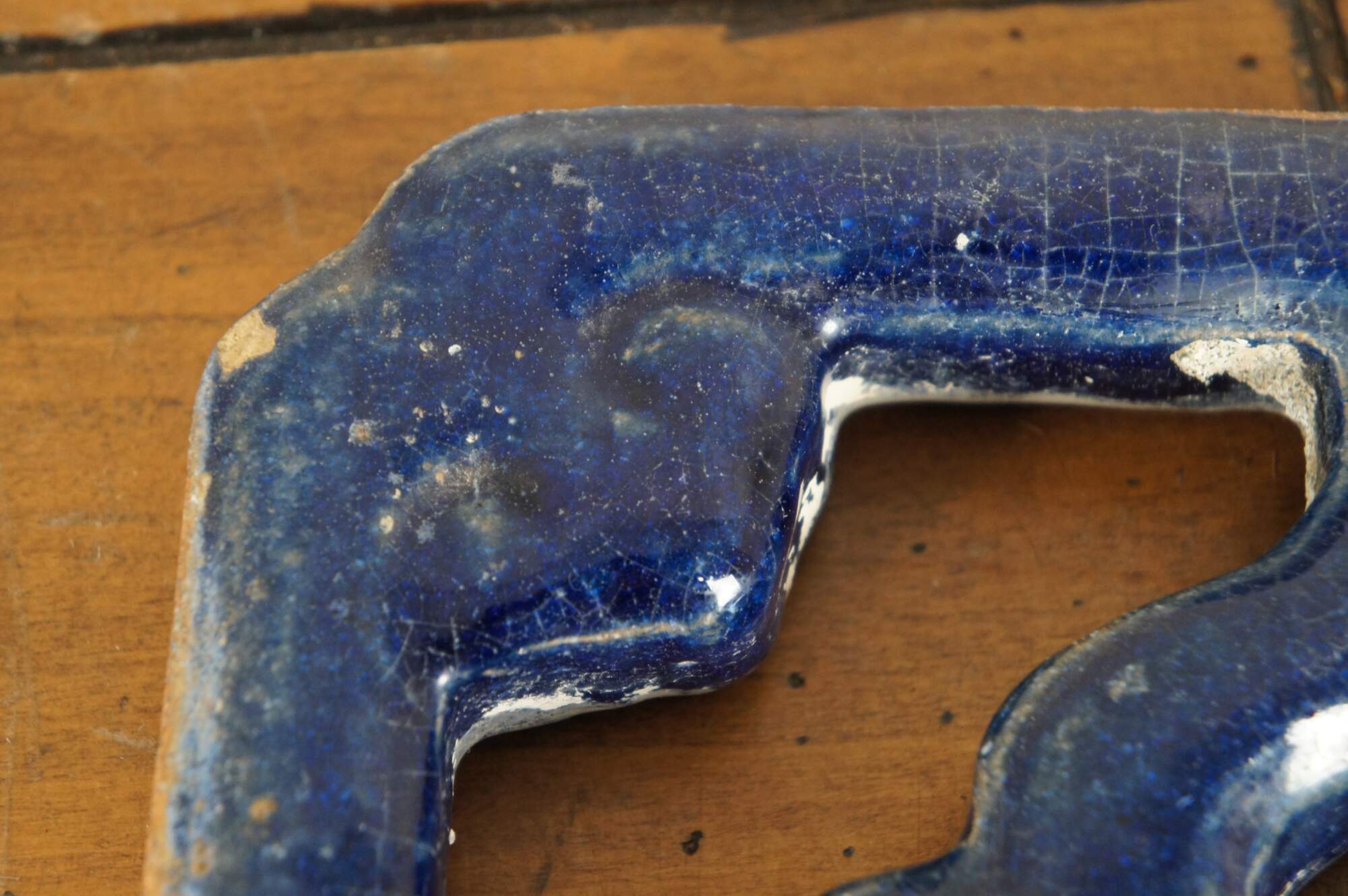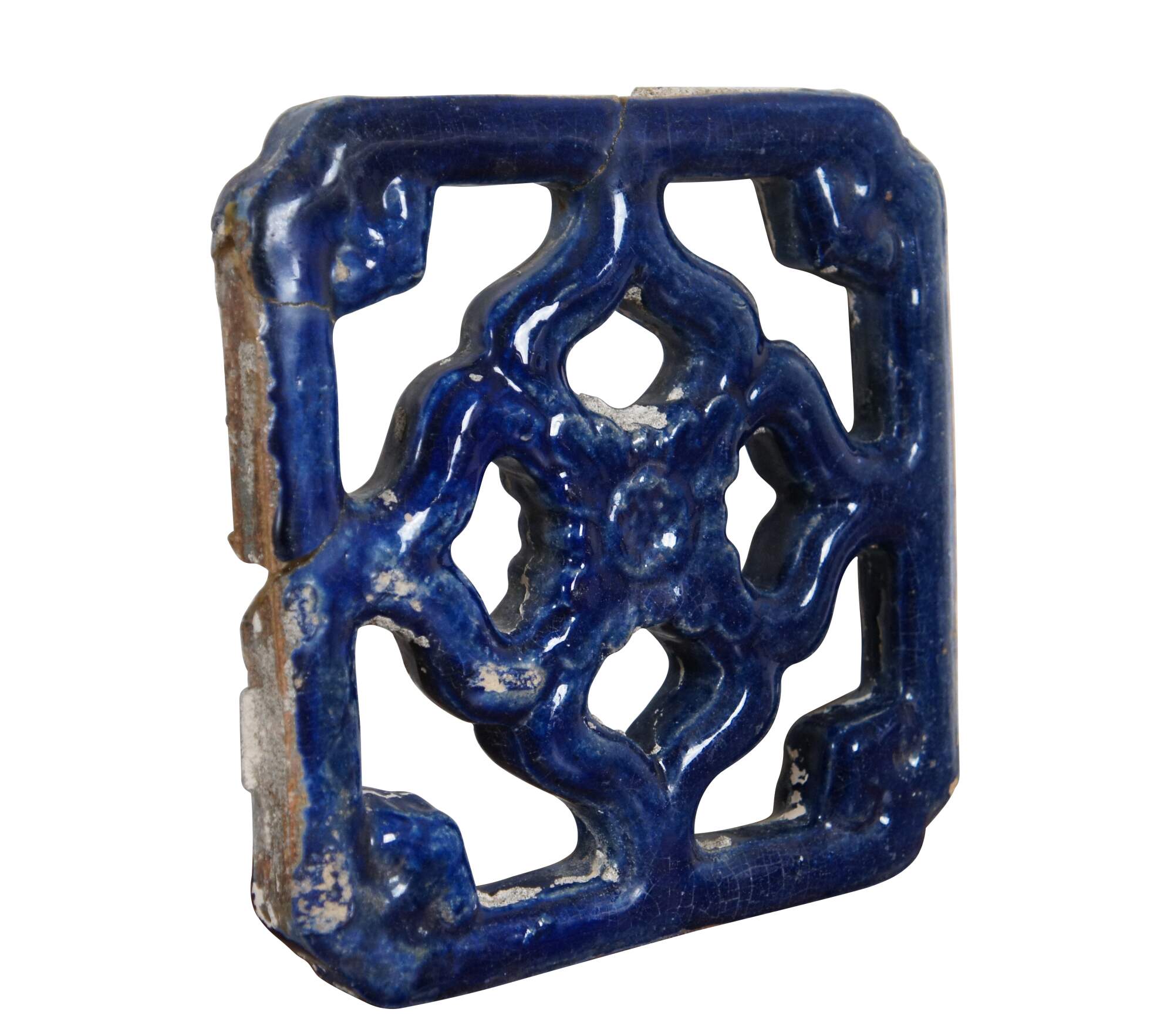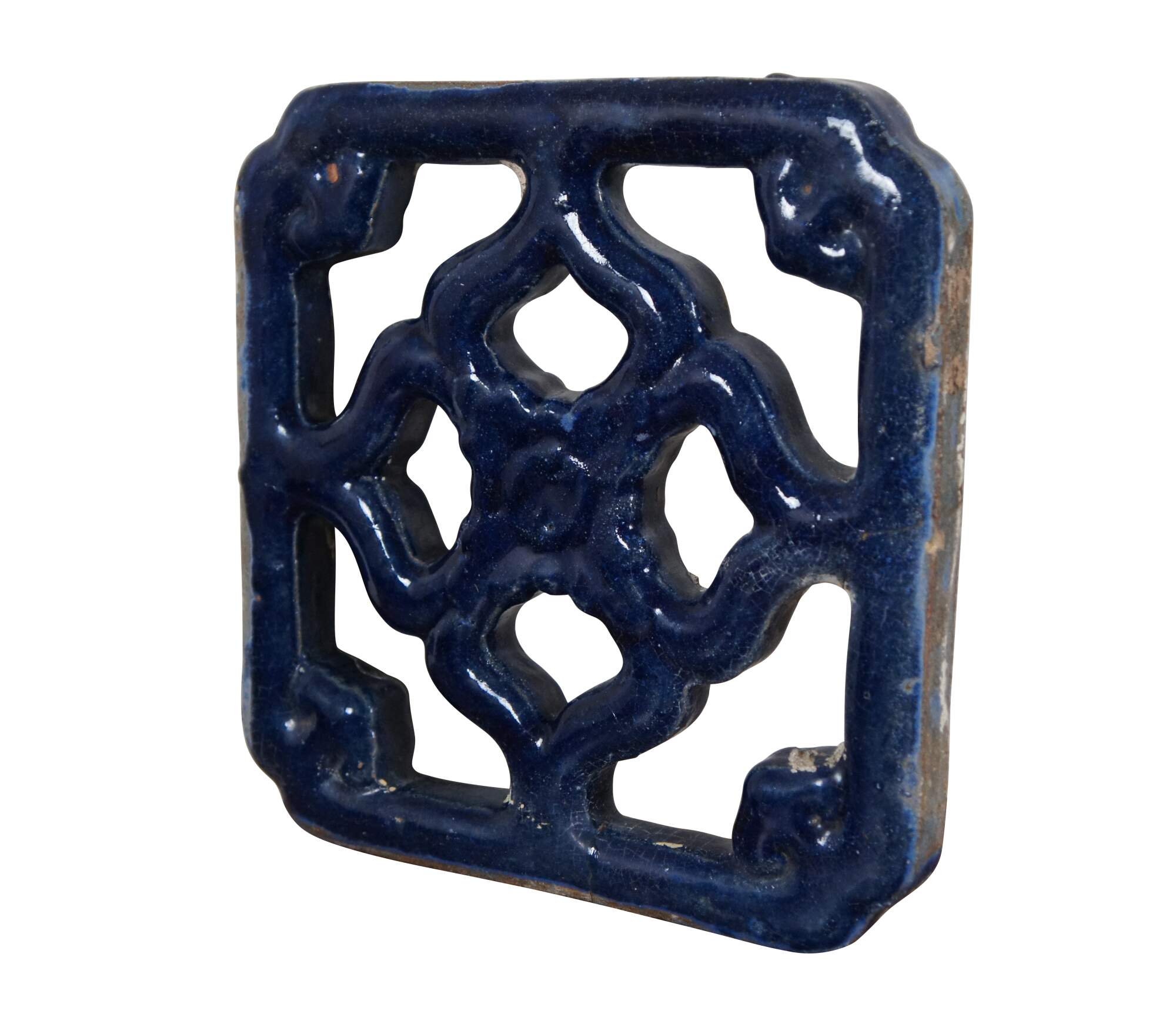 Pair of vintage pierced floral ceramic blue glazed vent / grille tiles.