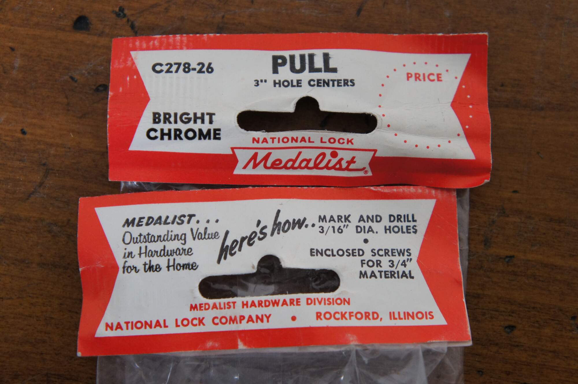 4 Available - Mid to late 20th century old-stock die cast metal drawer / cabinet pulls. National Lock Company - Medalist, item number C278-26 Pull, Galaxie, Bright Chrome finish. Mid century modern styling. Hole Centers - 3