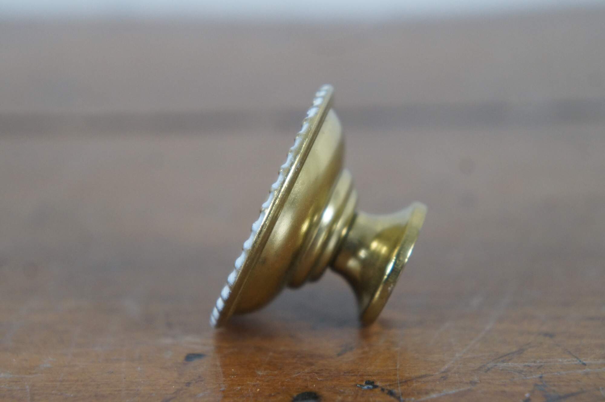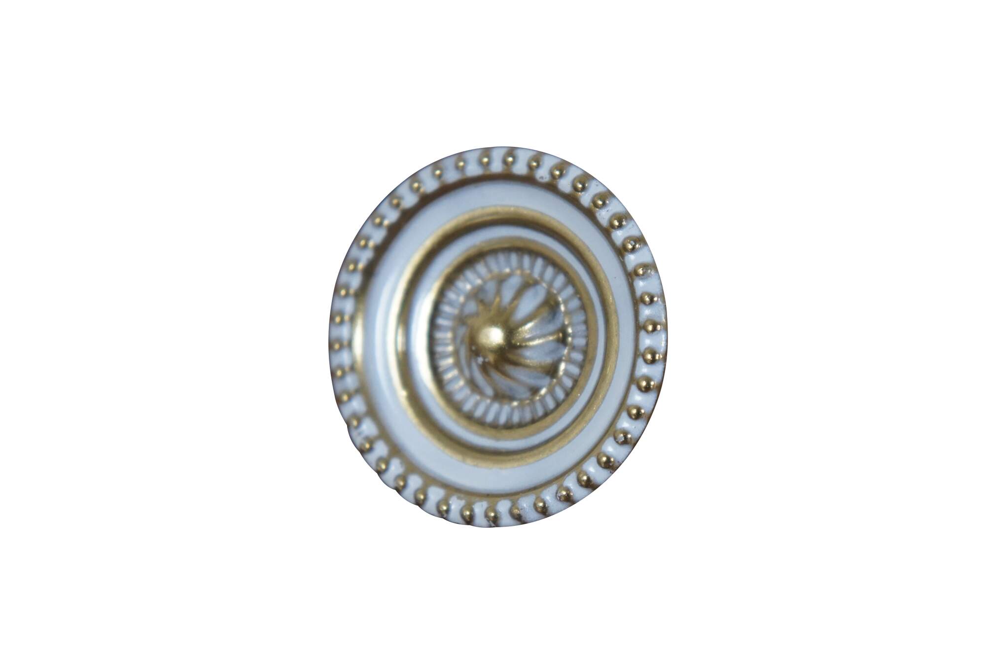 15 Available - Mid to late 20th century old-stock die cast drawer / cabinet pulls. Attributed to National Lock Company - Medalist. Bright brass with white accent knob. Hollywood Regency styling. Round / circular shape with spiral sunburst at center, framed in recessed grooves and beaded edge, finished with white enamel.