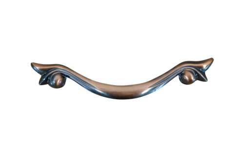 7 Available - Mid to late 20th century old-stock die cast drawer / cabinet pulls. National Lock Company - Medalist, item number C674-10D Pull, Old Copper finish. Curved fixed bail design with ends reminiscent of a leaf and berry. Hole Centers - 3