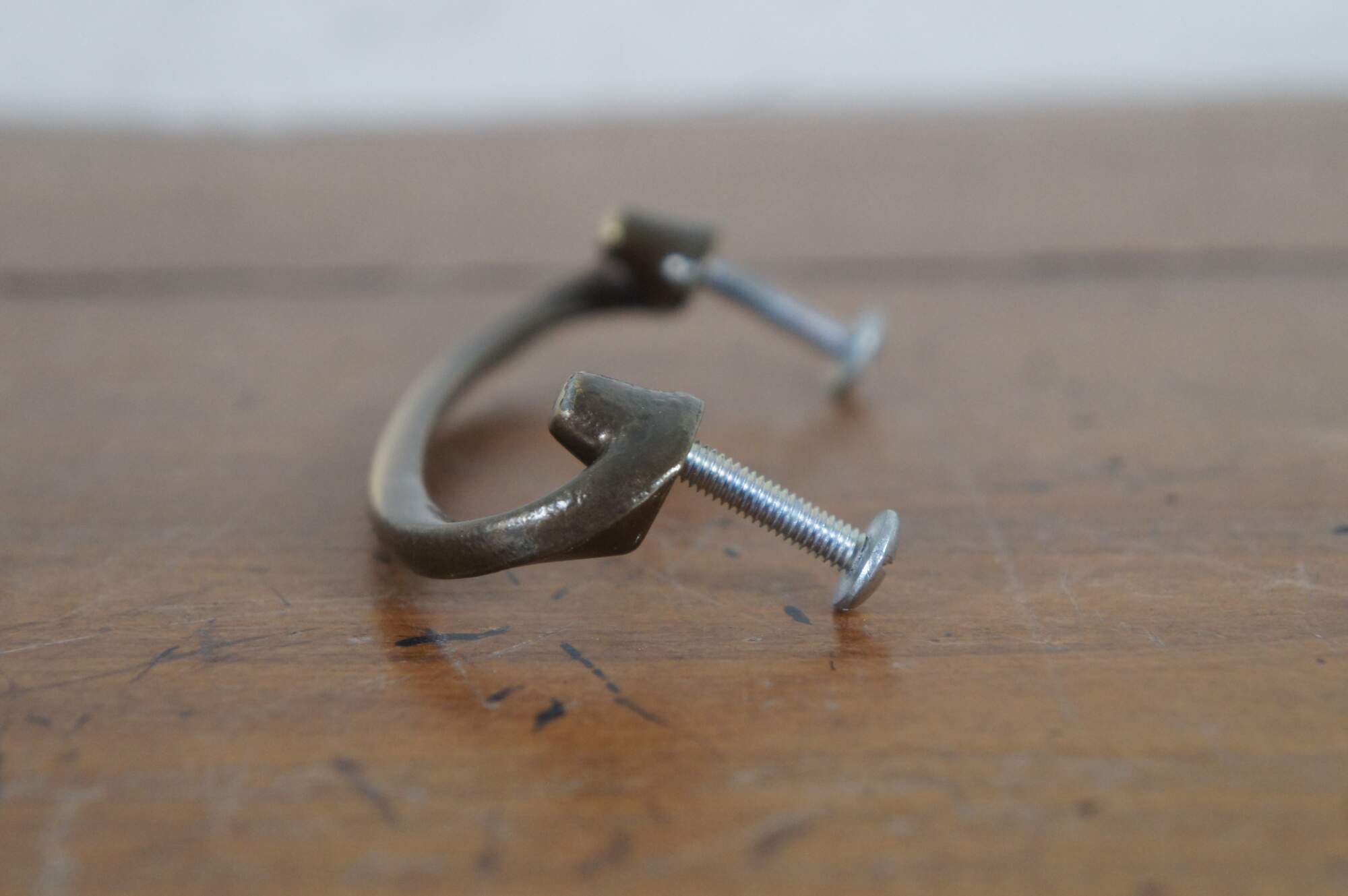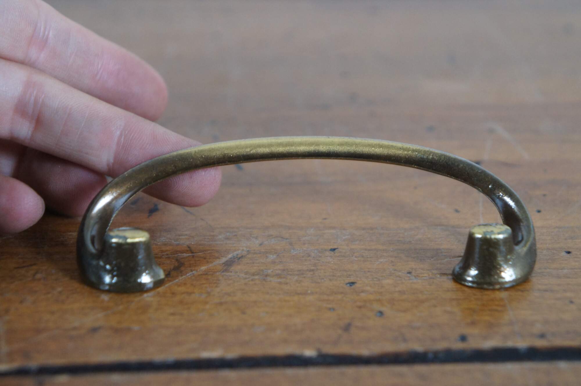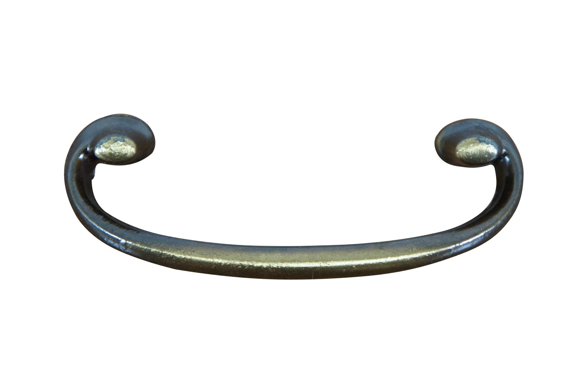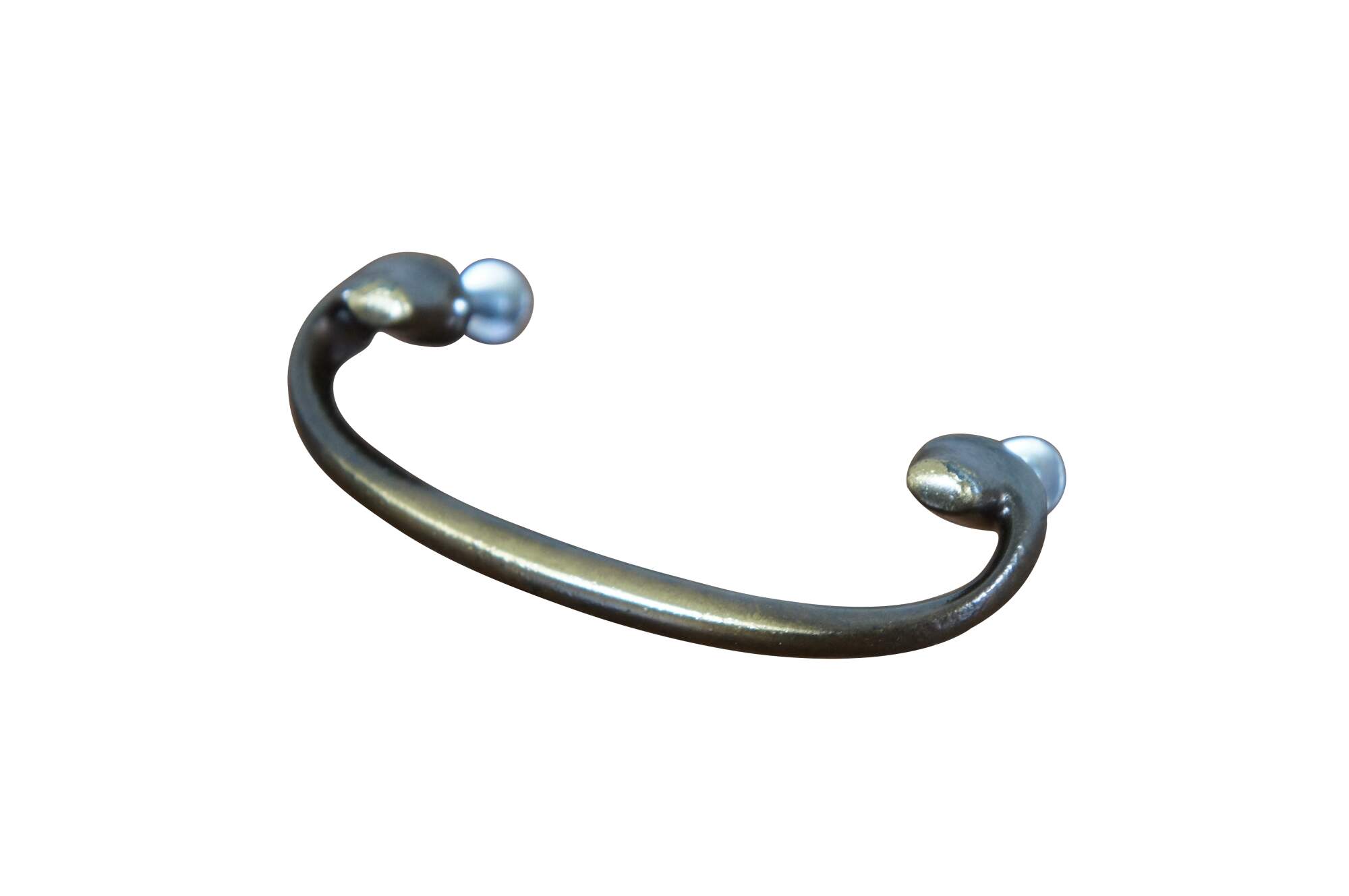 15 Available - Mid to late 20th century old-stock die cast metal drawer / cabinet pulls. Attributed to National Lock Company - Medalist. Antique brass / bronze finish. Simple, curved, fixed bail design with knob ends. Hole Centers - 3