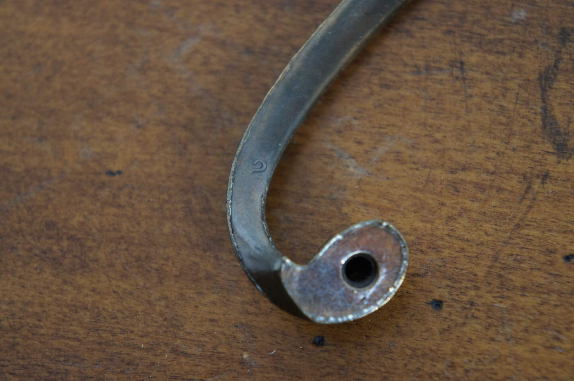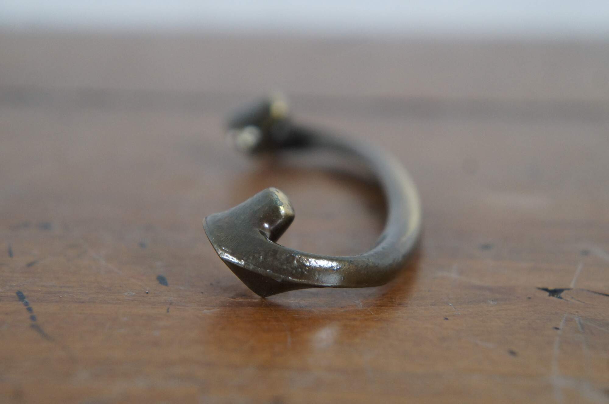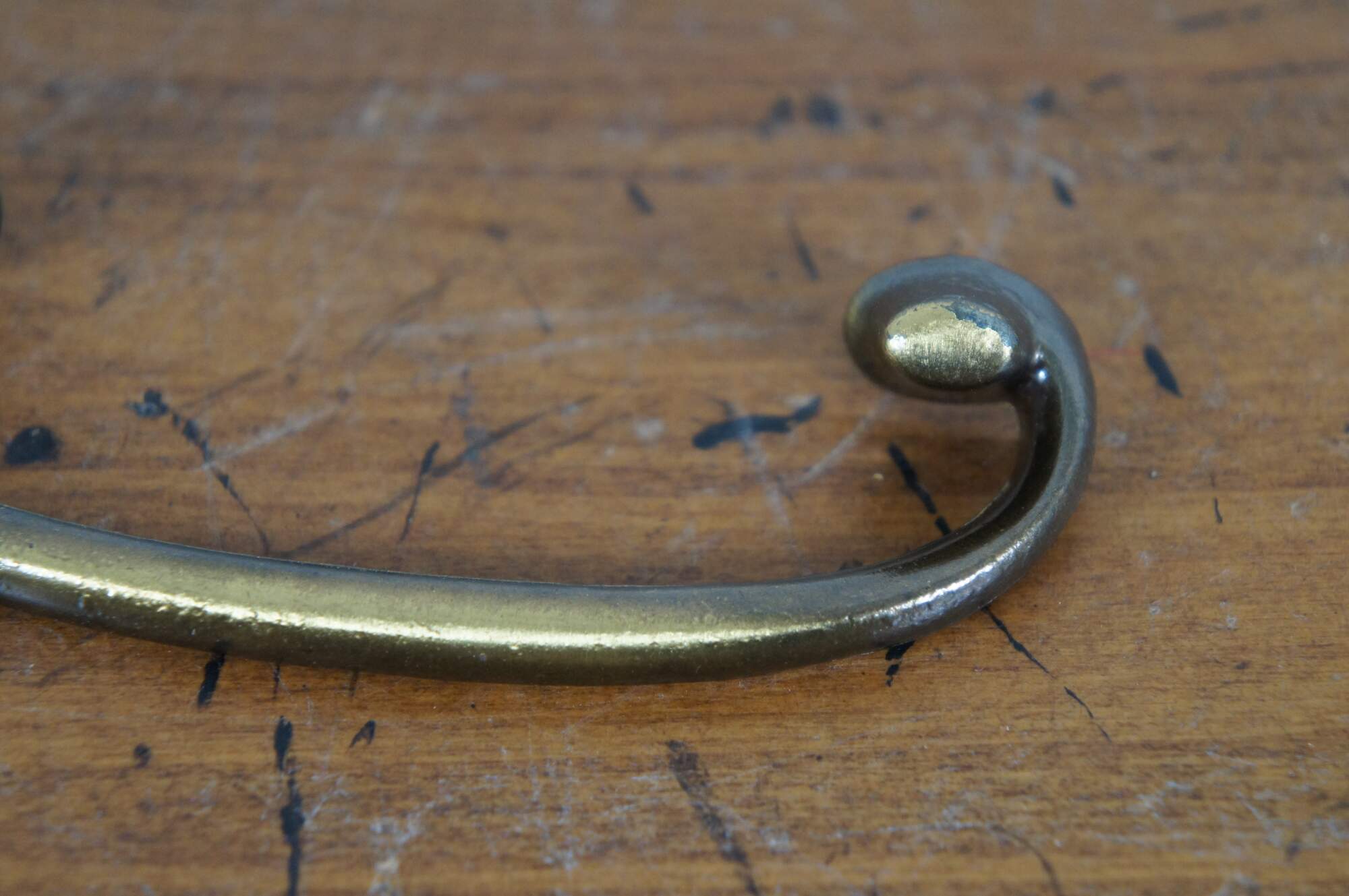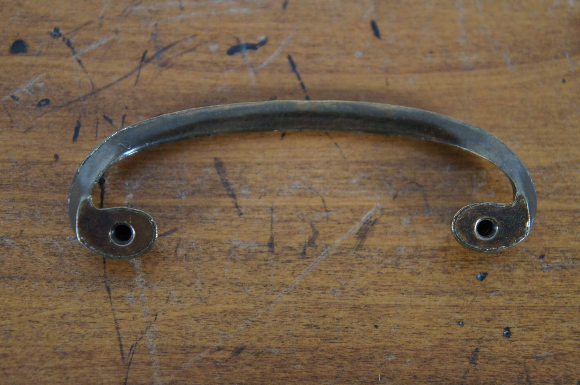 15 Available - Mid to late 20th century old-stock die cast metal drawer / cabinet pulls. Attributed to National Lock Company - Medalist. Antique brass / bronze finish. Simple, curved, fixed bail design with knob ends. Hole Centers - 3