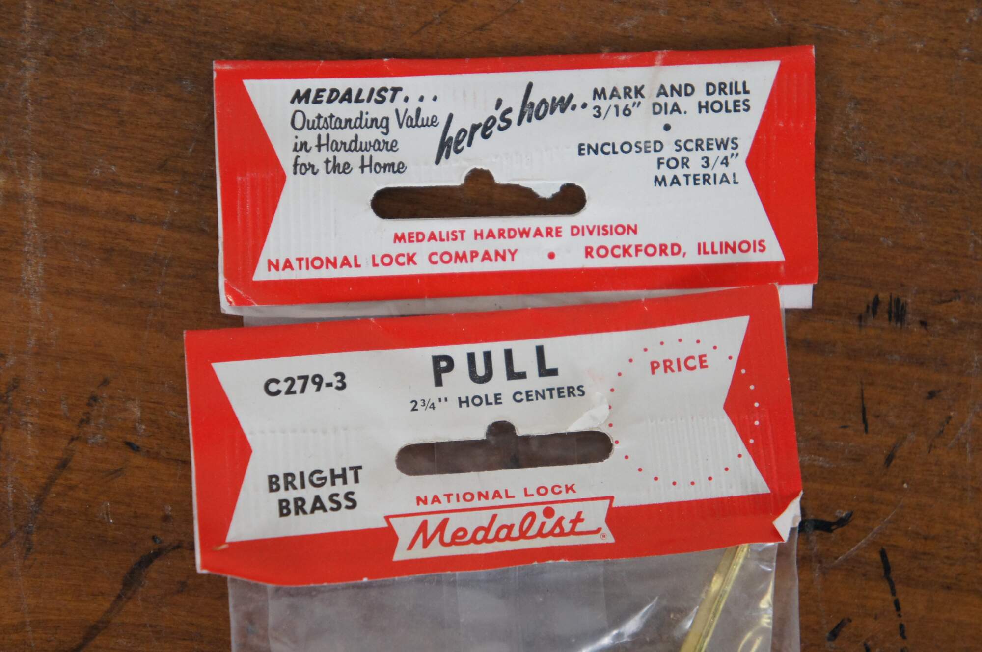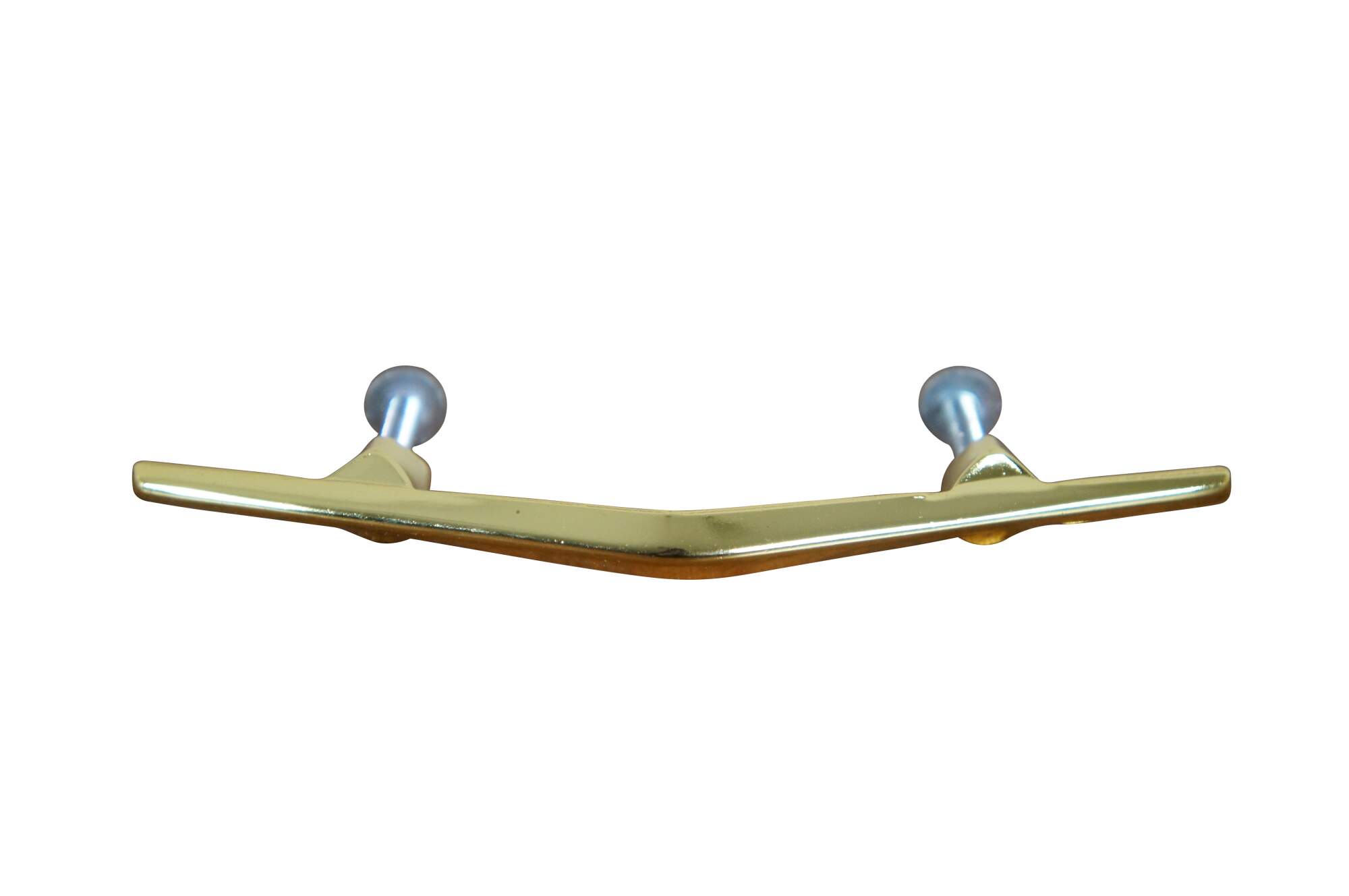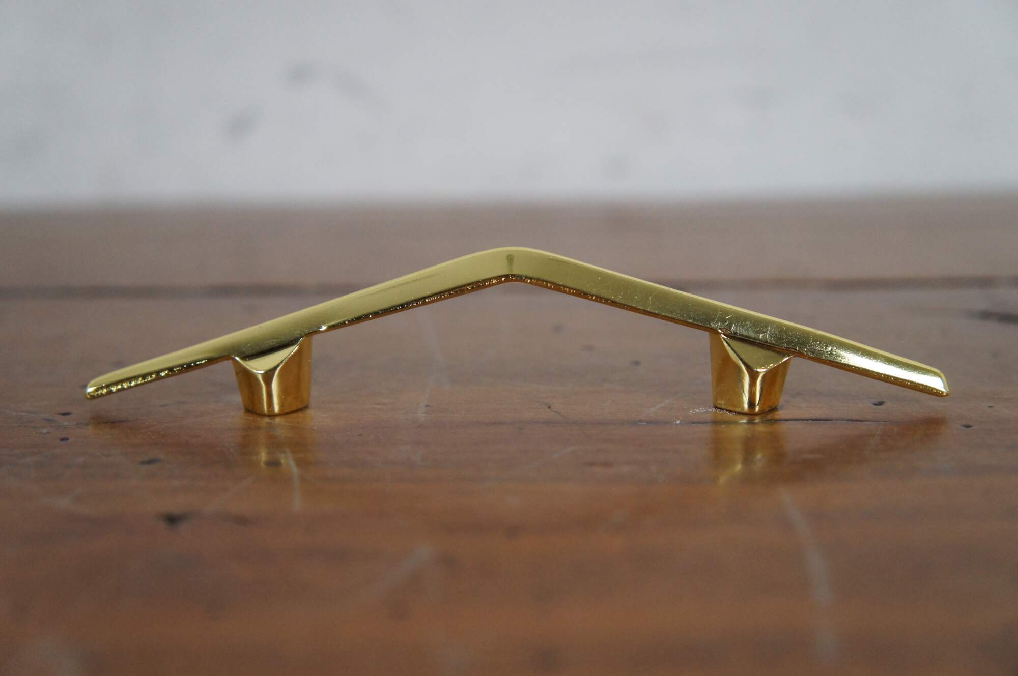25 Available - Mid to late 20th century old-stock drawer / cabinet pulls. National Lock Company - Medalist, item number C279-3 Starflite Pull, Bright Brass. Mid Century Modern styling. Triangular, airplane or arrow-like shape.