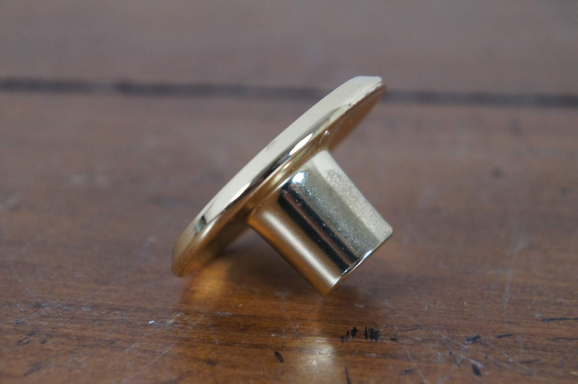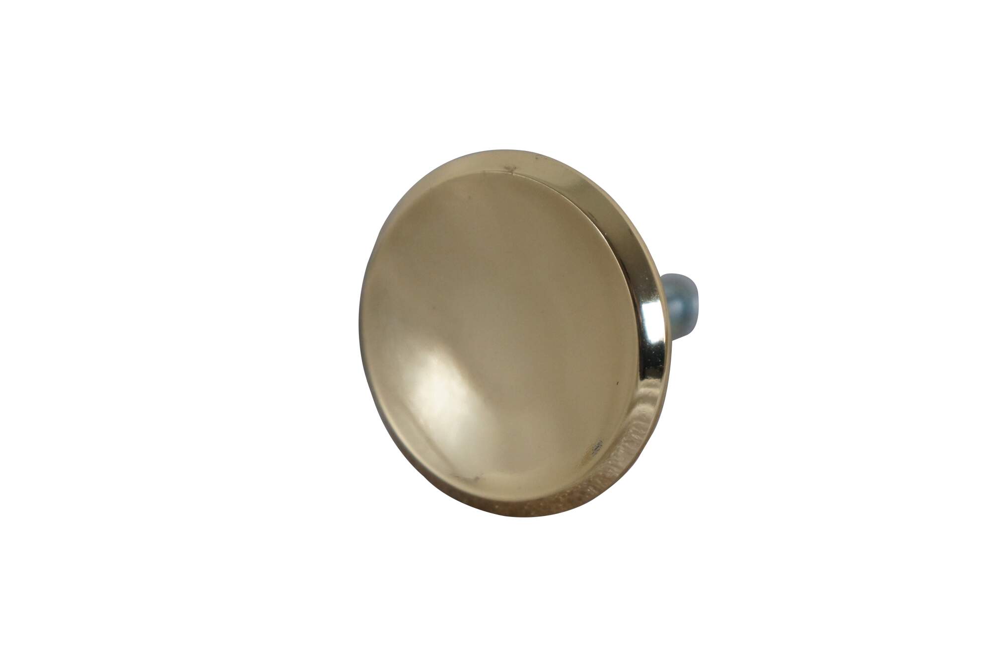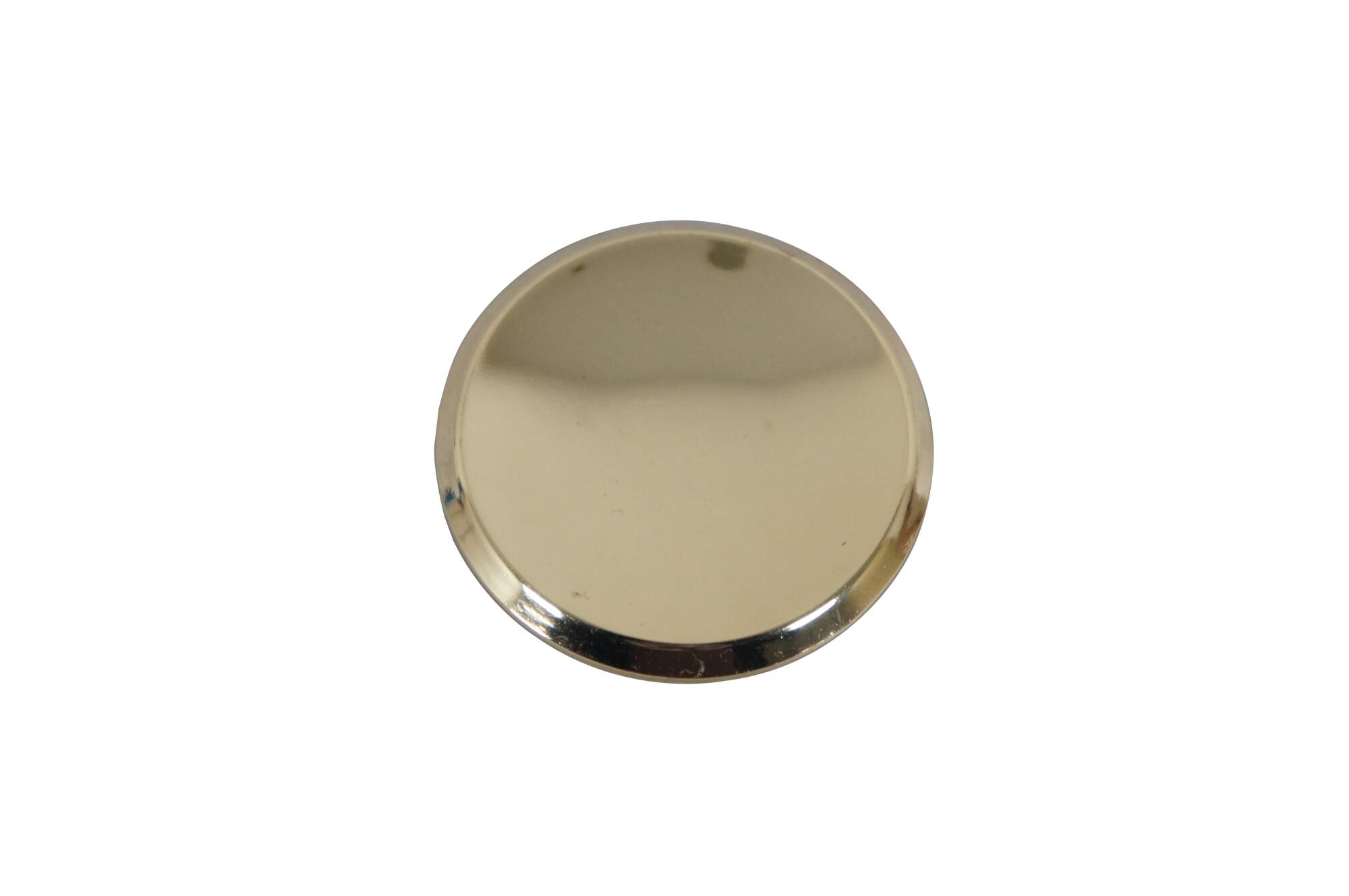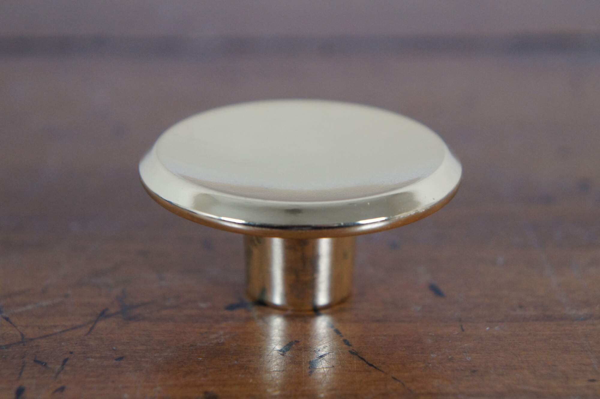 3 Available - Mid to late 20th century old-stock drawer / cabinet pulls. Amerock, item number T-554-3 Polished Brass, Modern Knob. Simple round shape with concave face and beveled edge.
