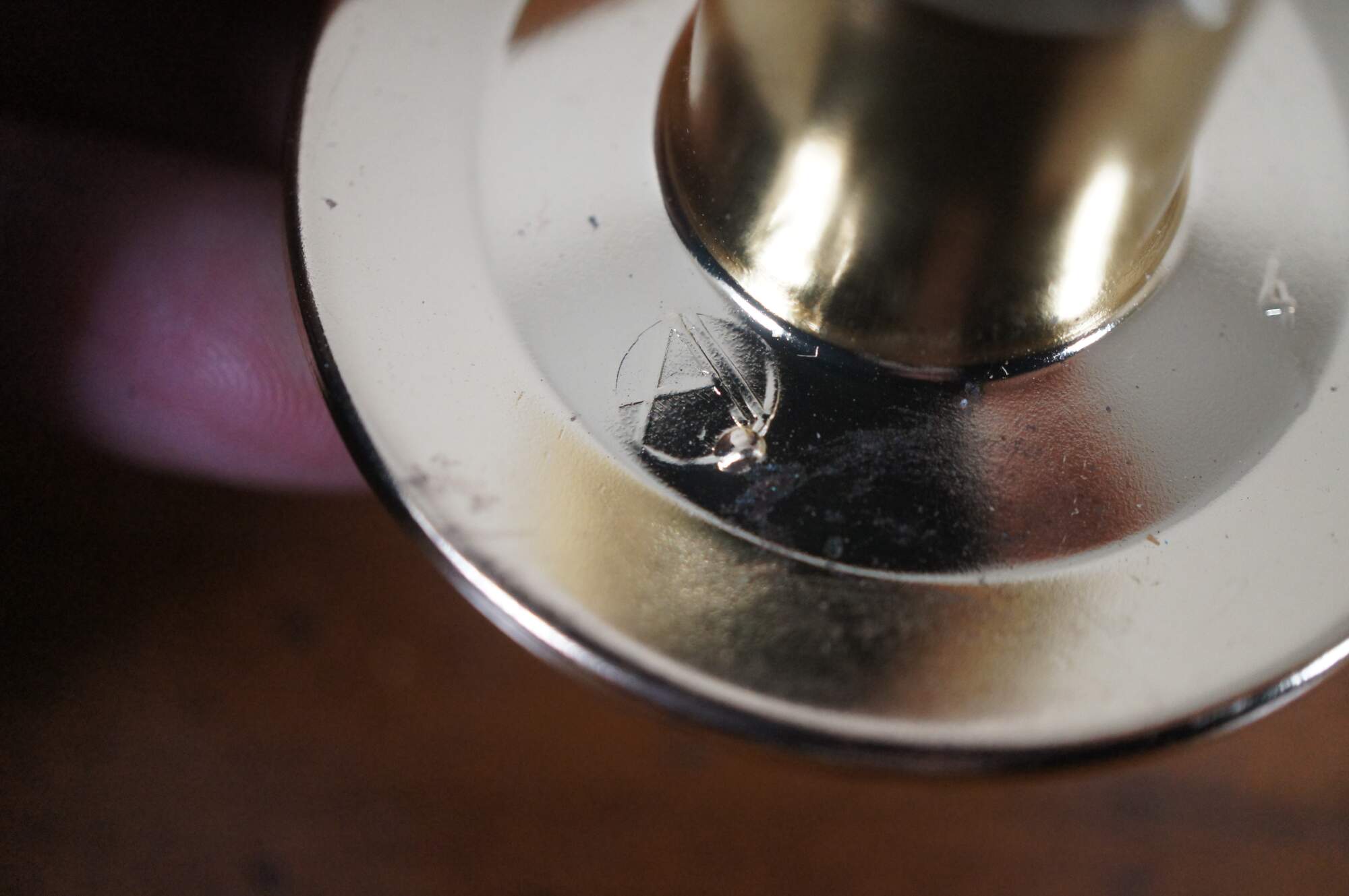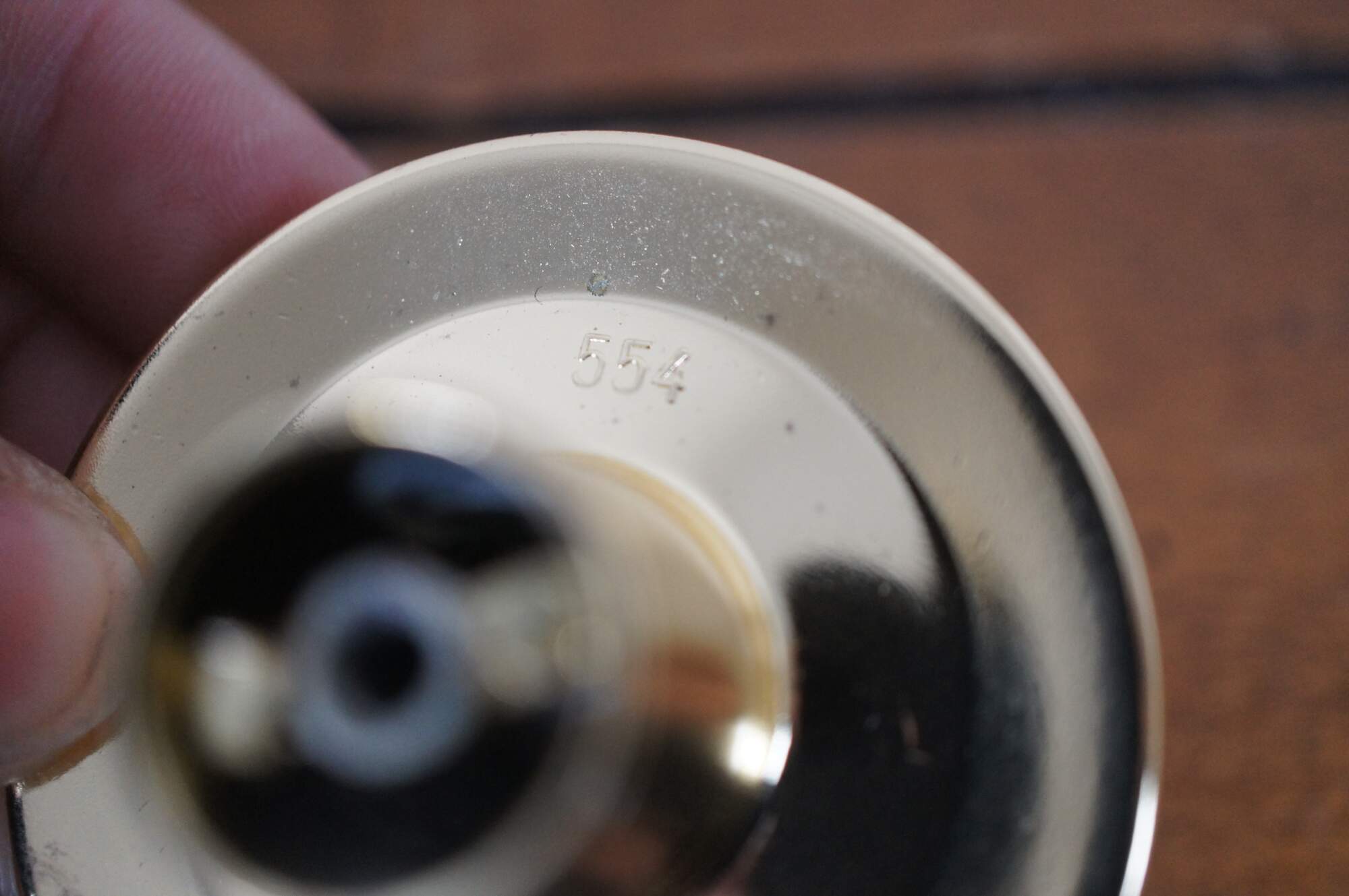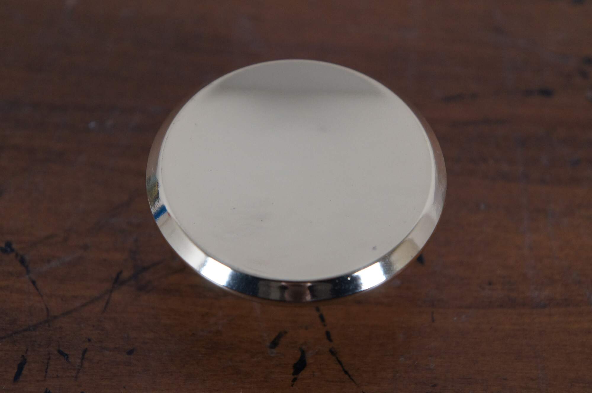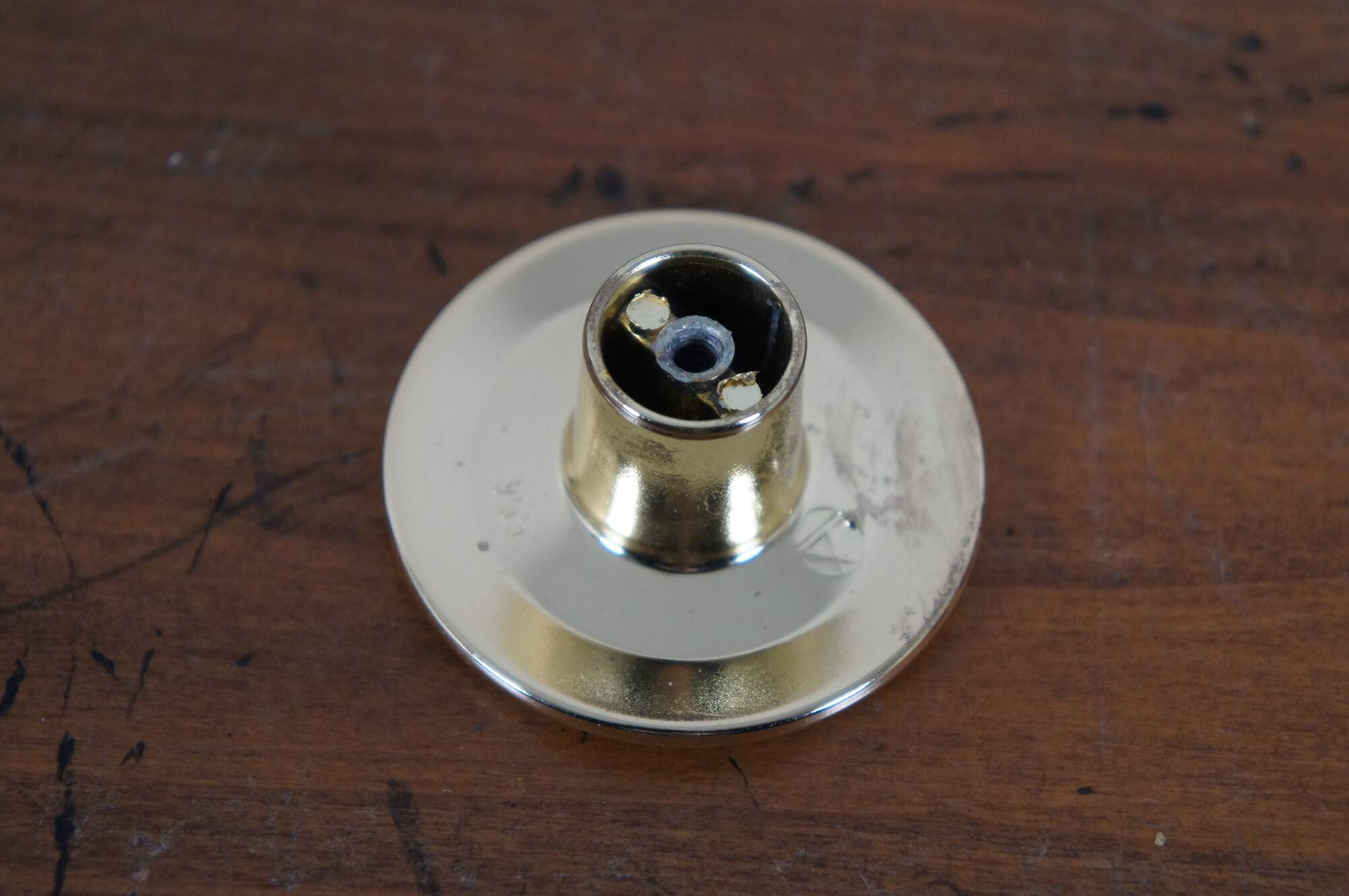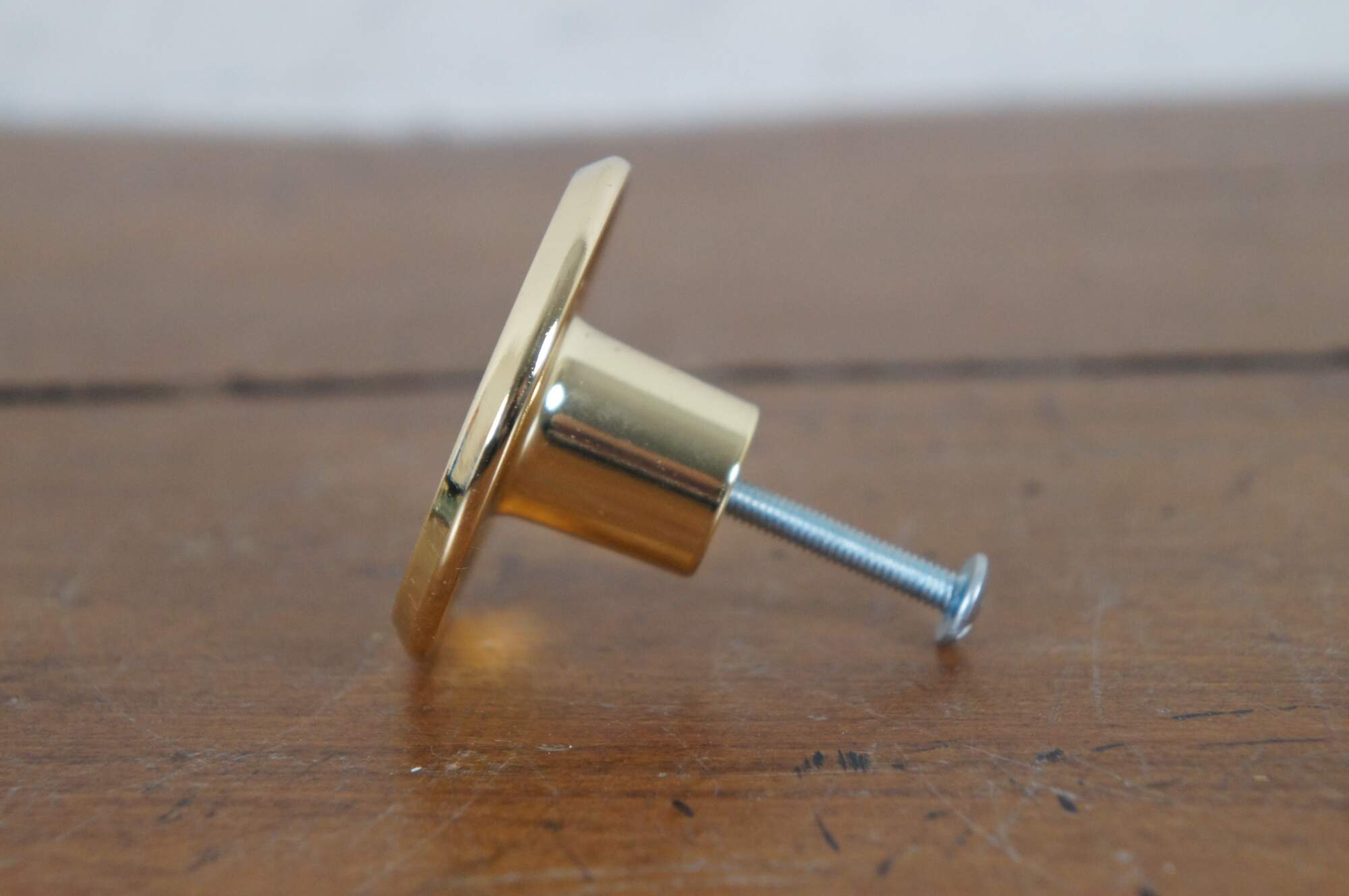 3 Available - Mid to late 20th century old-stock drawer / cabinet pulls. Amerock, item number T-554-3 Polished Brass, Modern Knob. Simple round shape with concave face and beveled edge.