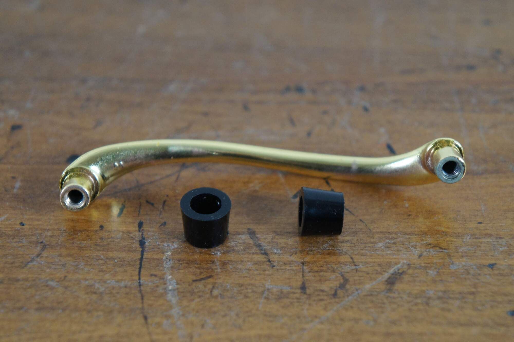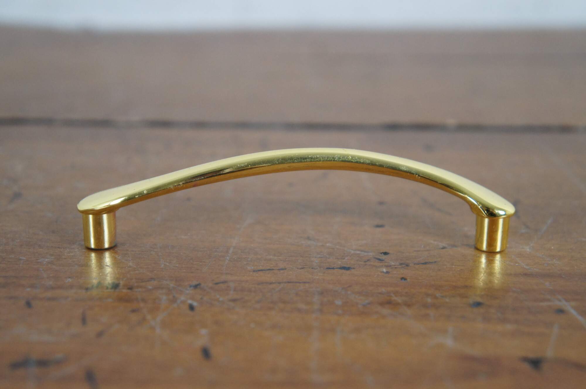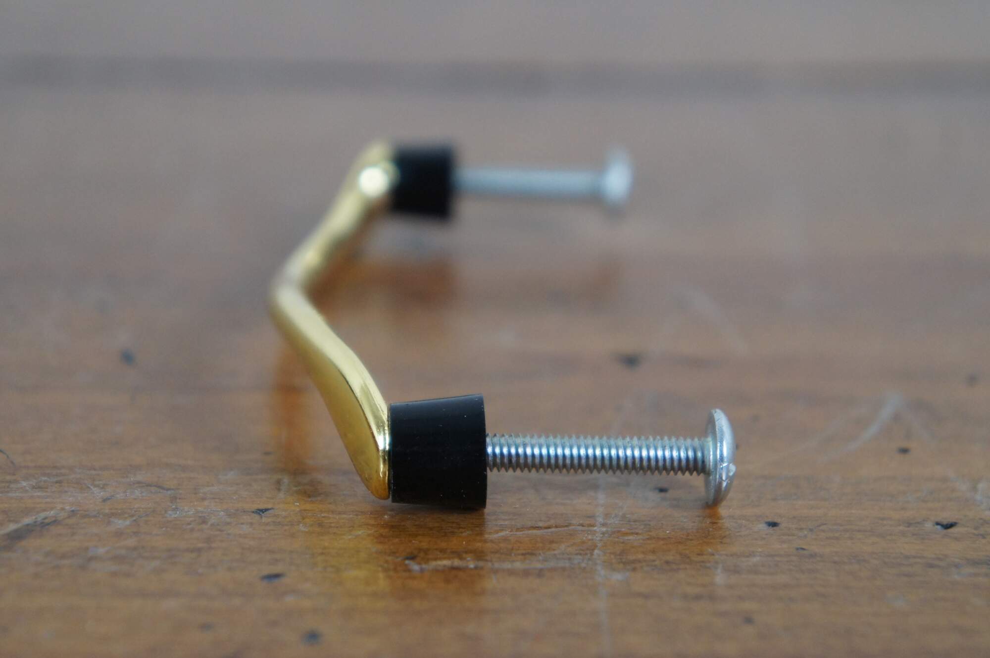 33 Available - Mid to late 20th century old-stock die cast drawer / cabinet pulls. National Lock Company - Medalist, item number C293 Pulls, Bright Brass (3). 3.5" Hole Centers. Mid Century Modern styling. Serpentine shape with rounded ends and black caps.
