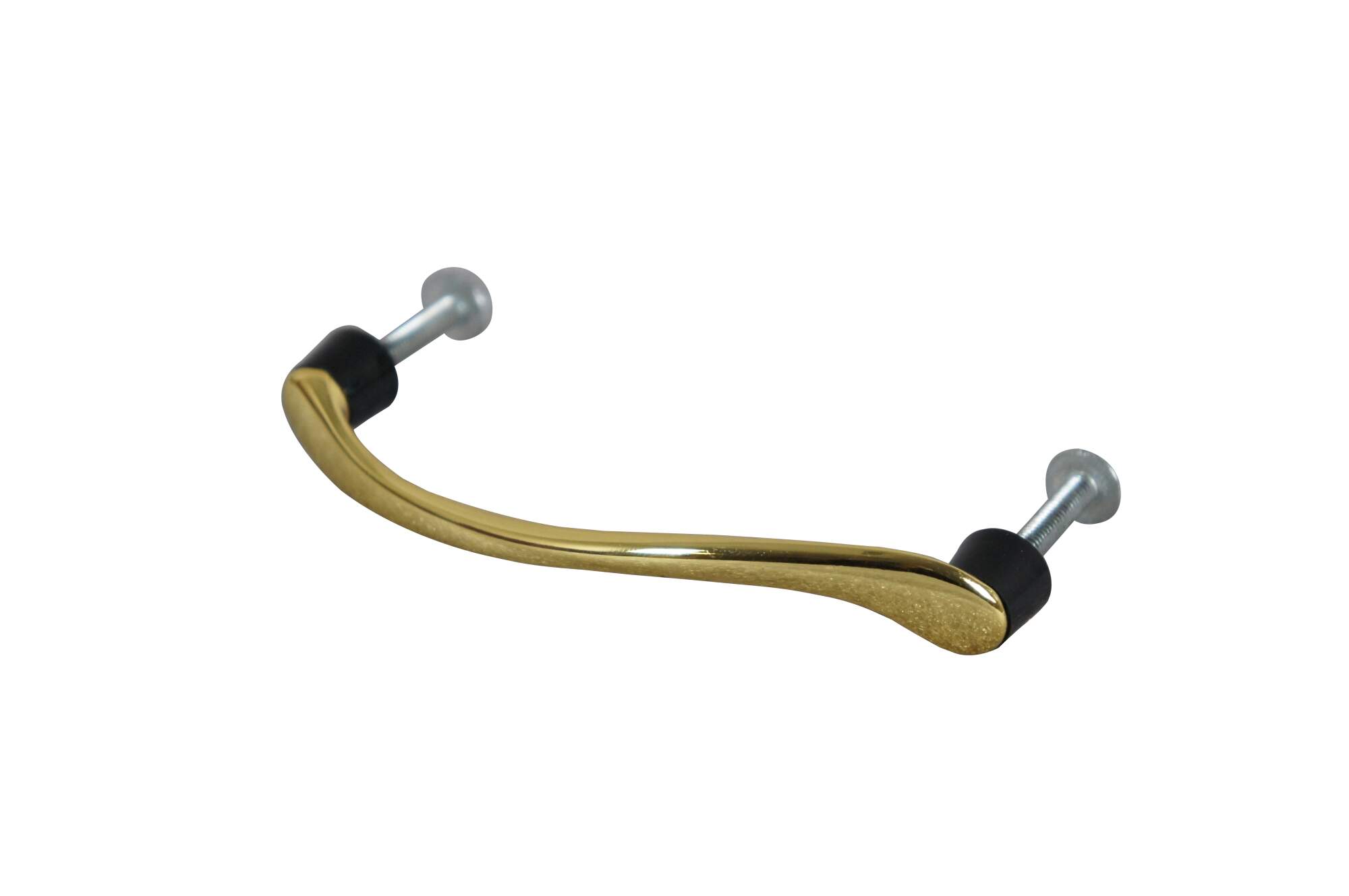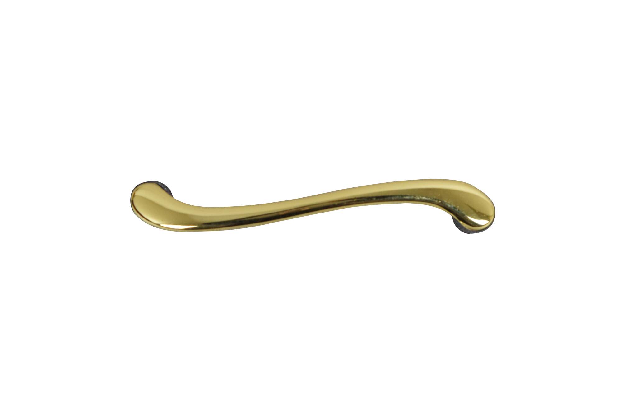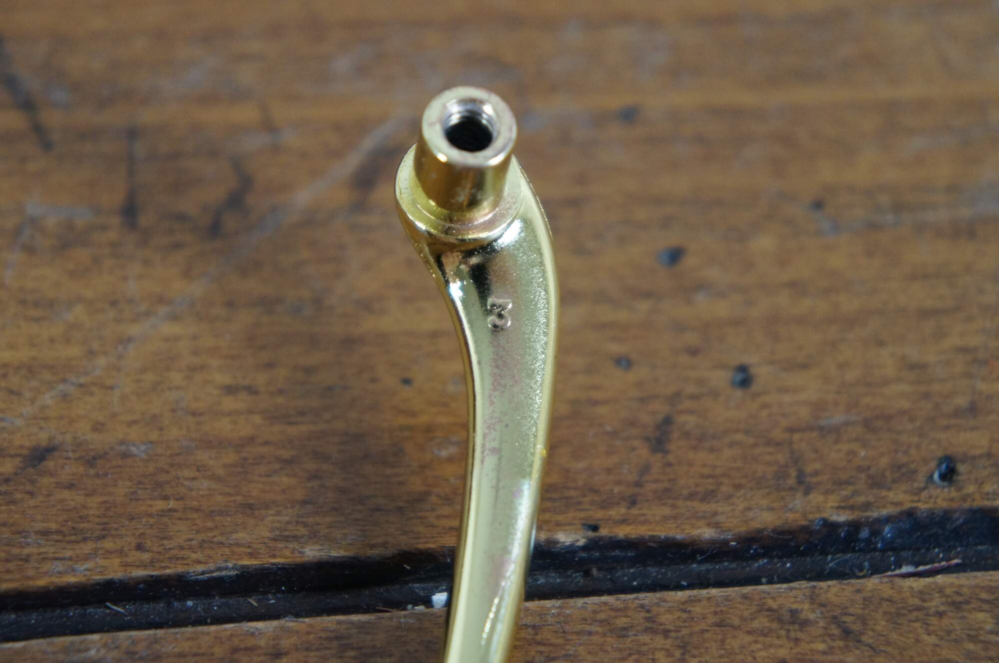 33 Available - Mid to late 20th century old-stock die cast drawer / cabinet pulls. National Lock Company - Medalist, item number C293 Pulls, Bright Brass (3). 3.5" Hole Centers. Mid Century Modern styling. Serpentine shape with rounded ends and black caps.