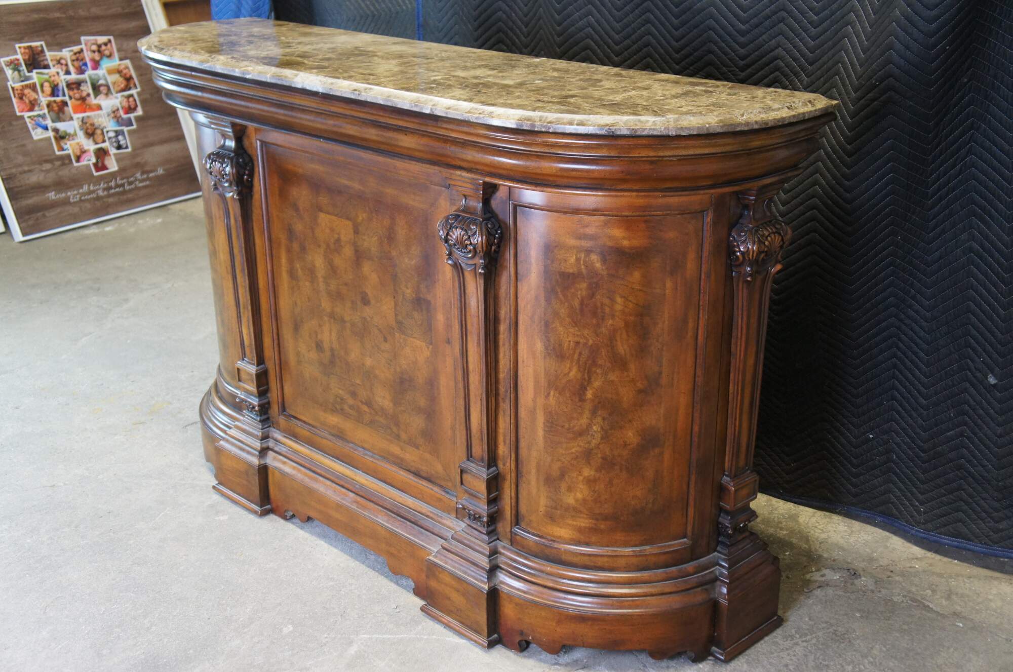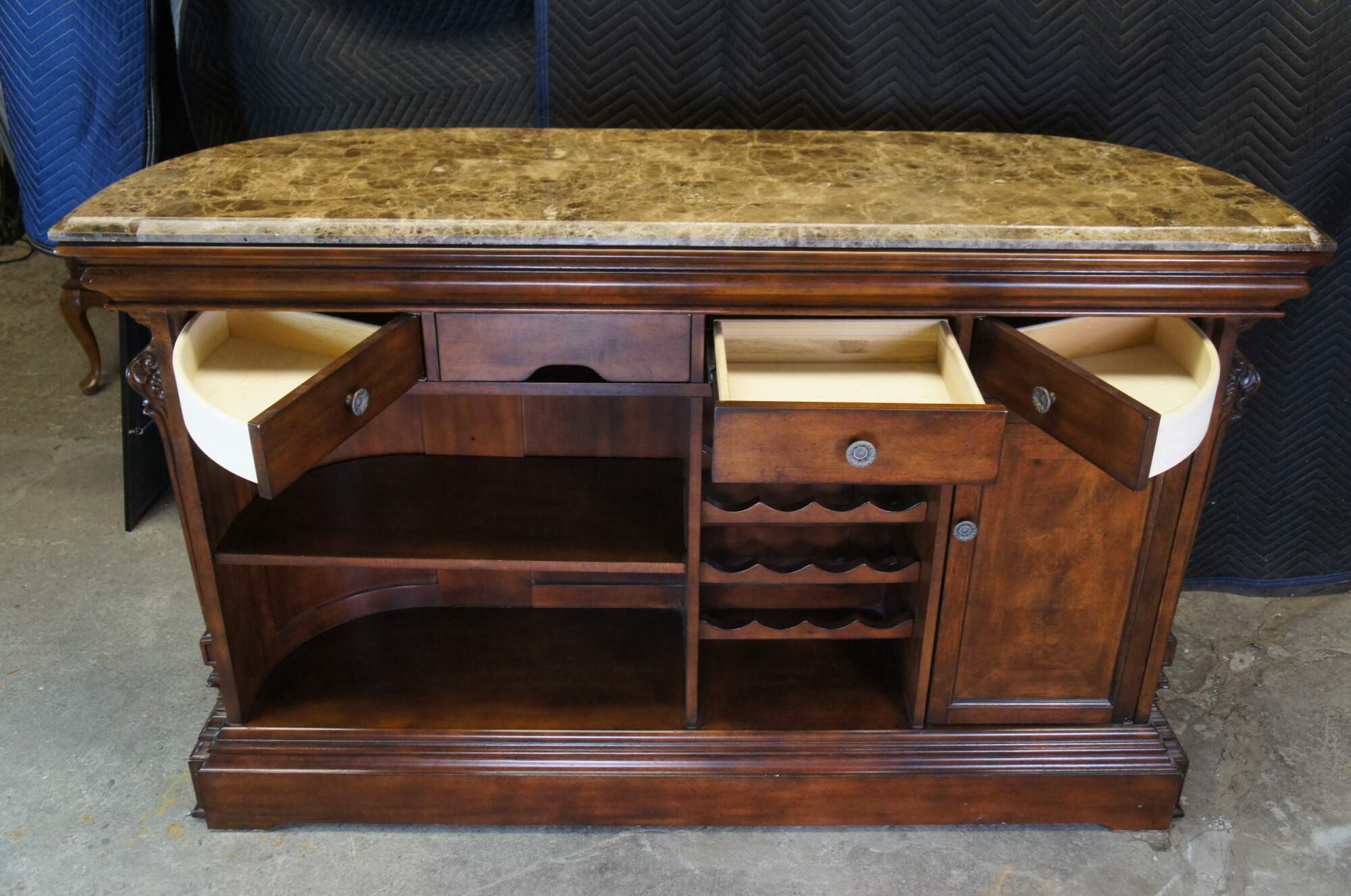 A quaint Millennium Bar by Ashley Furniture. Features Henry II styling with a brown wood demilune frame, burlwood panels, carved columns and a faux marble top. The reverse side showcases 3 drawers, a stone work surface, wine bottle holder for 12, side cabinet and shelf for accessory storage.