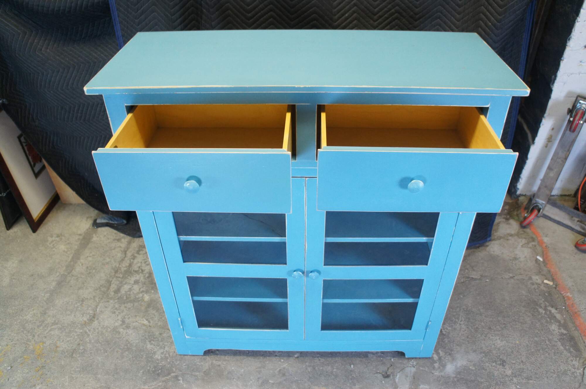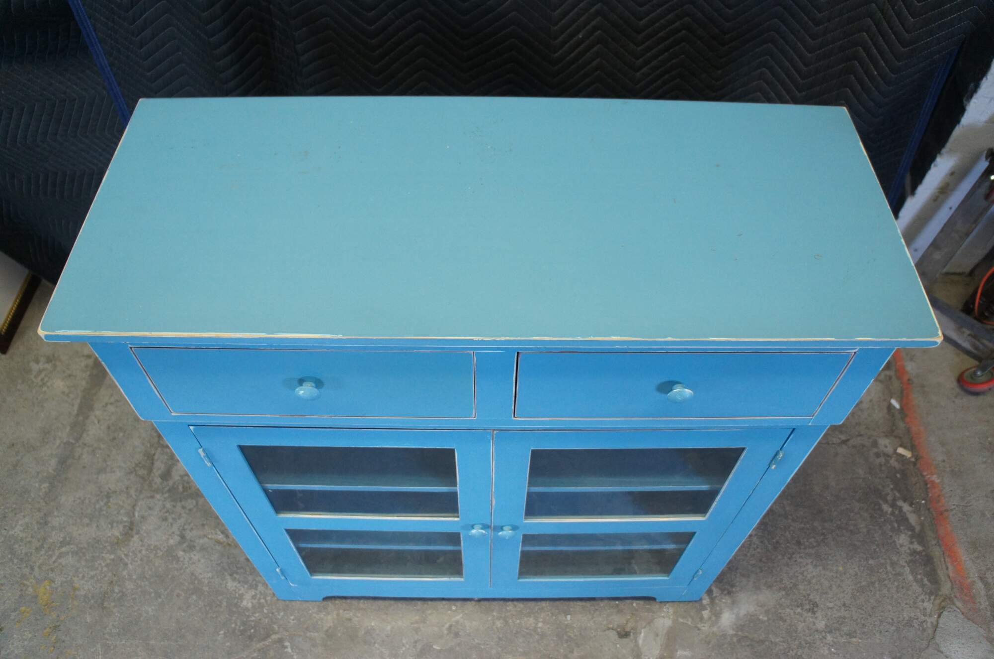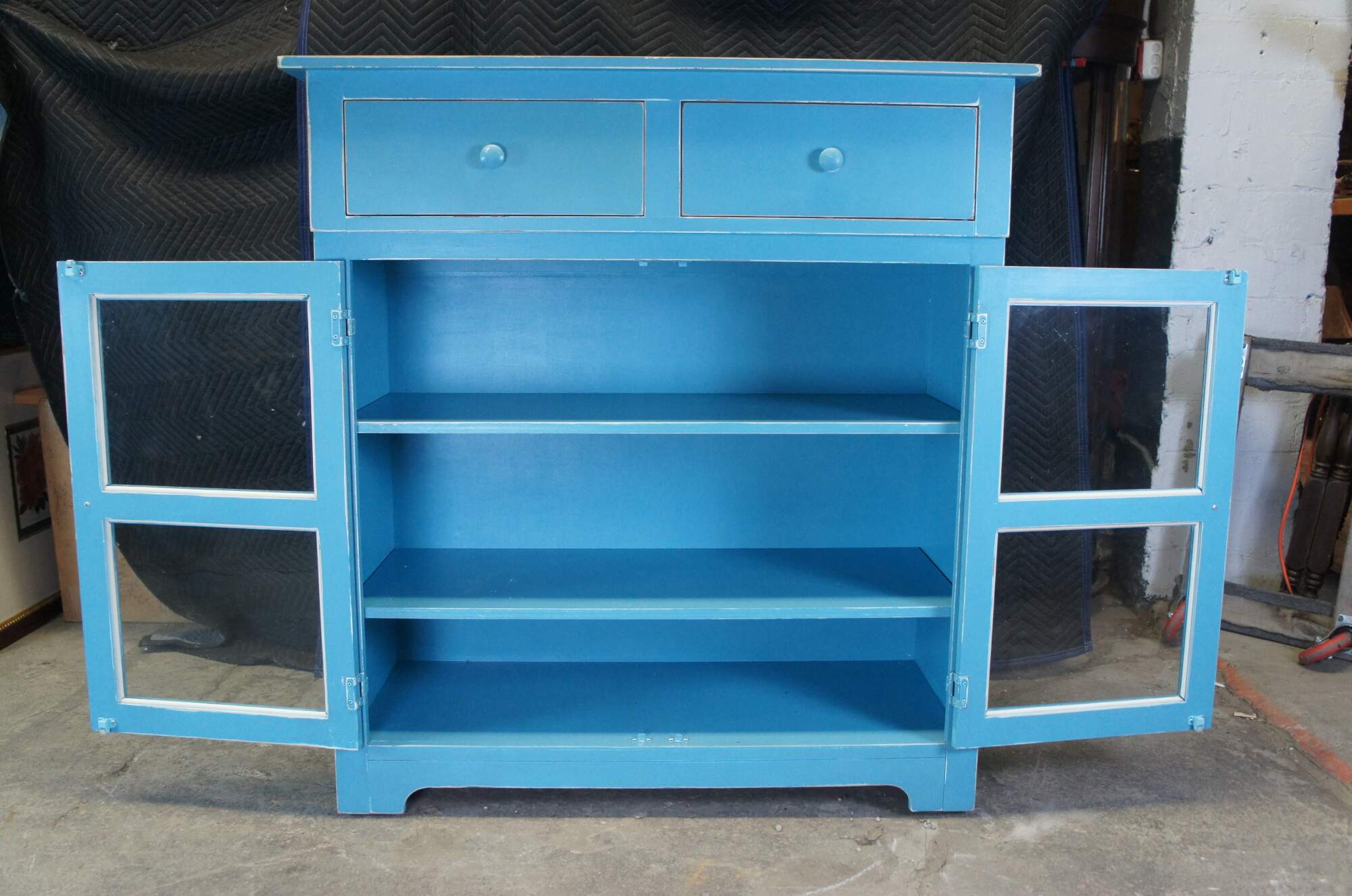 A beautiful blue cupboard by Jasper Cabinet Company. Made from hardwood with two dovetailed drawers over lower cabinet with adjustable shelves. The lower doors feature antiqued glass. A unique design inspired by American Jelly Cabinets from the 19th century. Great for use as a curio, display cabinet, buffet, credenza, console table or media storage cabinet.