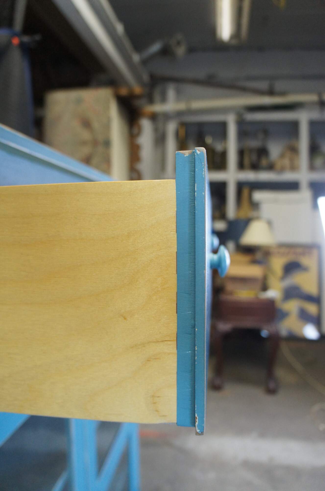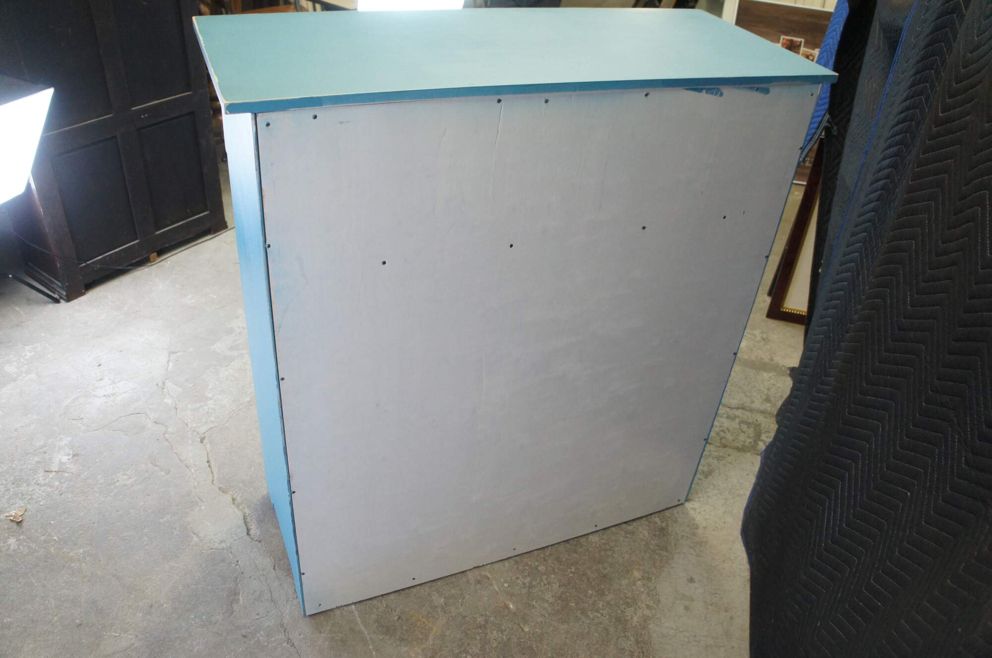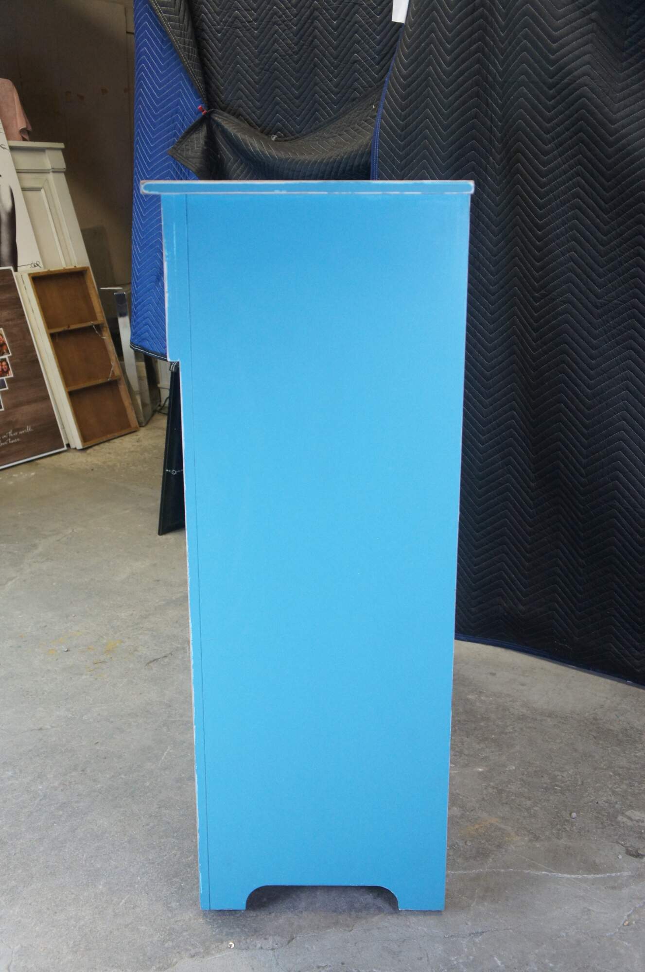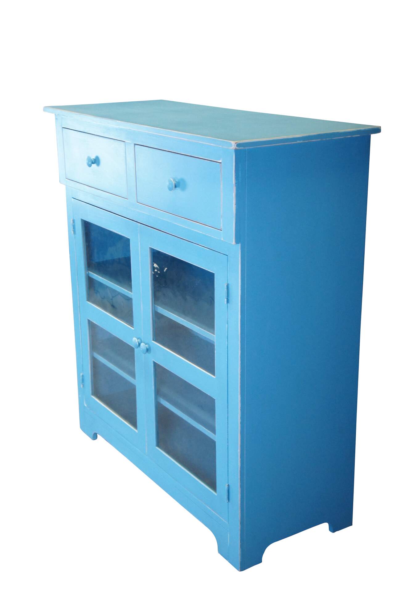 A beautiful blue cupboard by Jasper Cabinet Company. Made from hardwood with two dovetailed drawers over lower cabinet with adjustable shelves. The lower doors feature antiqued glass. A unique design inspired by American Jelly Cabinets from the 19th century. Great for use as a curio, display cabinet, buffet, credenza, console table or media storage cabinet.