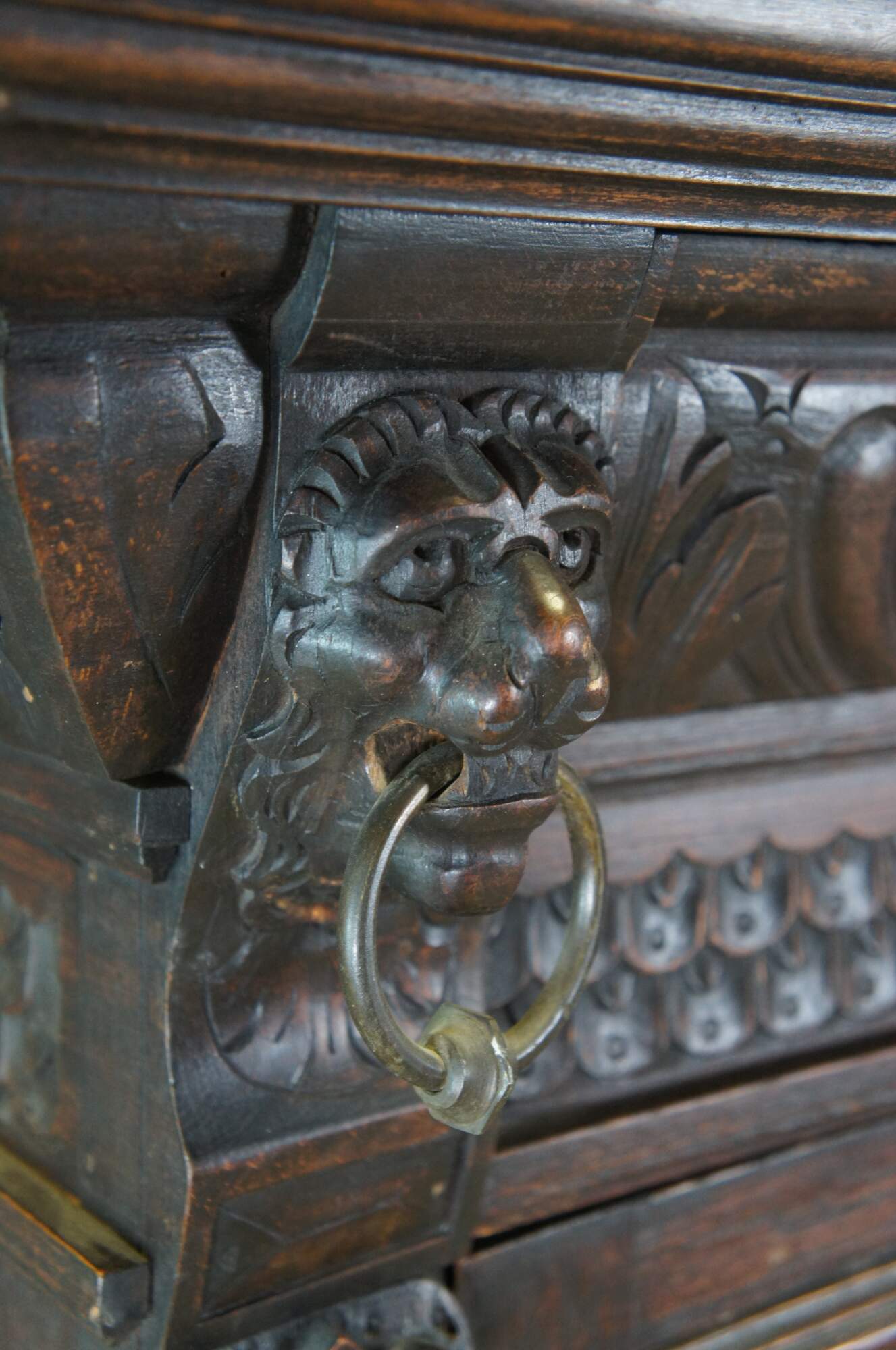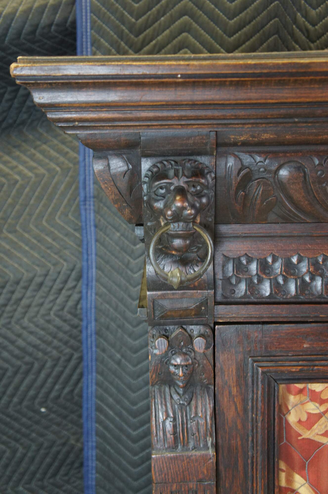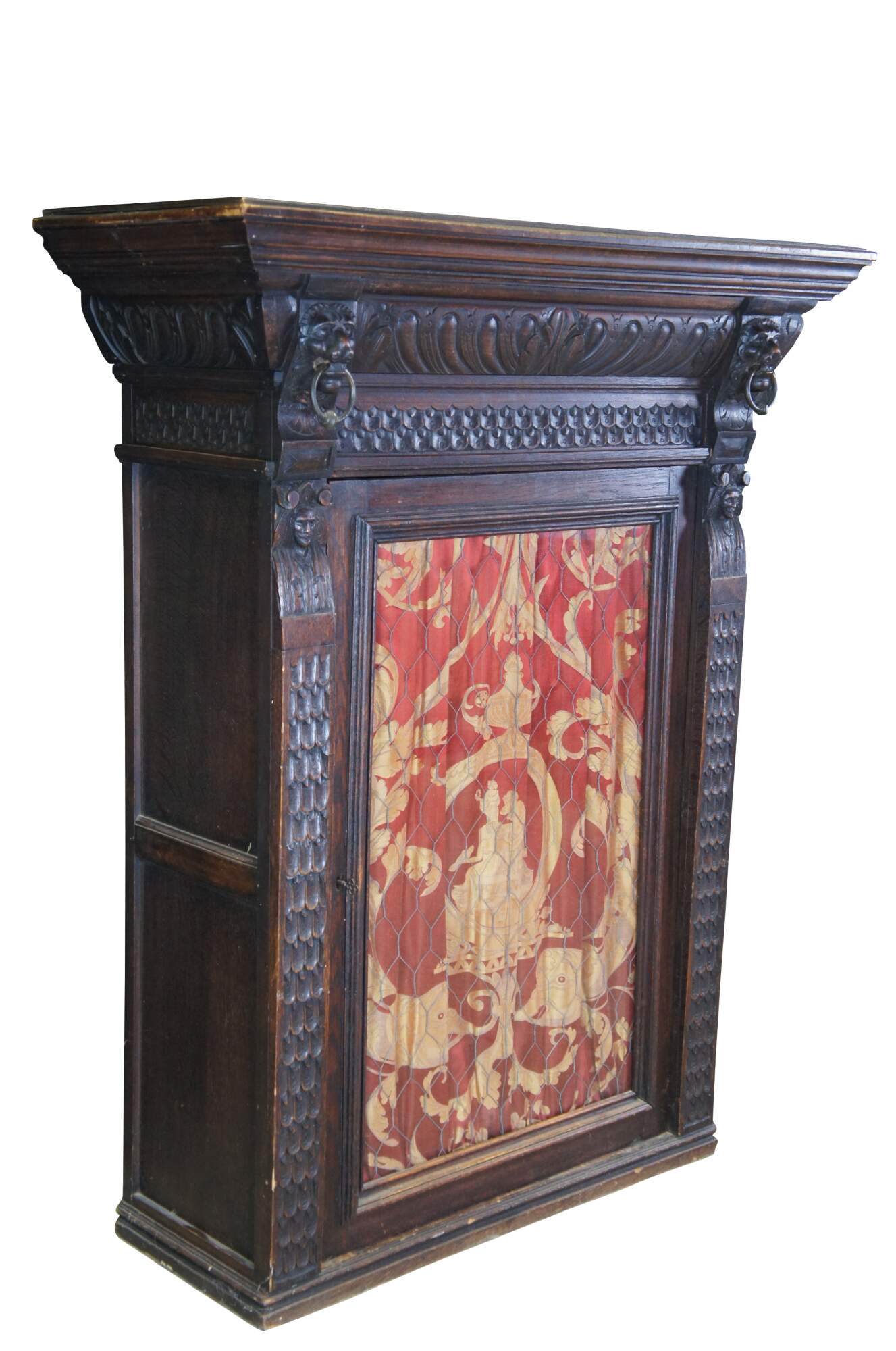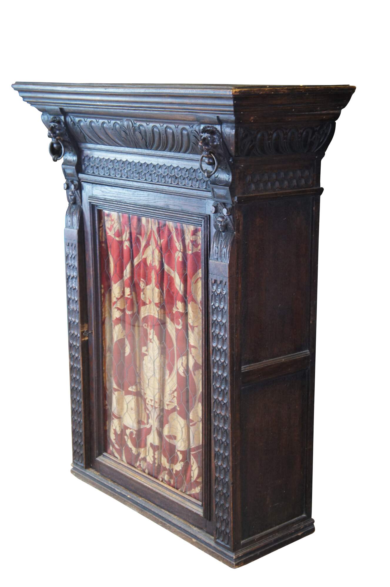 Beautiful late 19th century French Renaissance Revival hanging cabinet. Great for use as a bookcase, curio, vitrine or display cabinet. Made from oak with intricate carved details. Features ornate gadrooning along the crown flanked by carved lion heads leading down to intricate nobleman along the stiles dressed in overcoats with large triangular hats and a mustache. The cabinet is paneled along the sides and opens via glass chickenwire covered door to two interior shelves. Includes a silk curtain with brocade pattern.