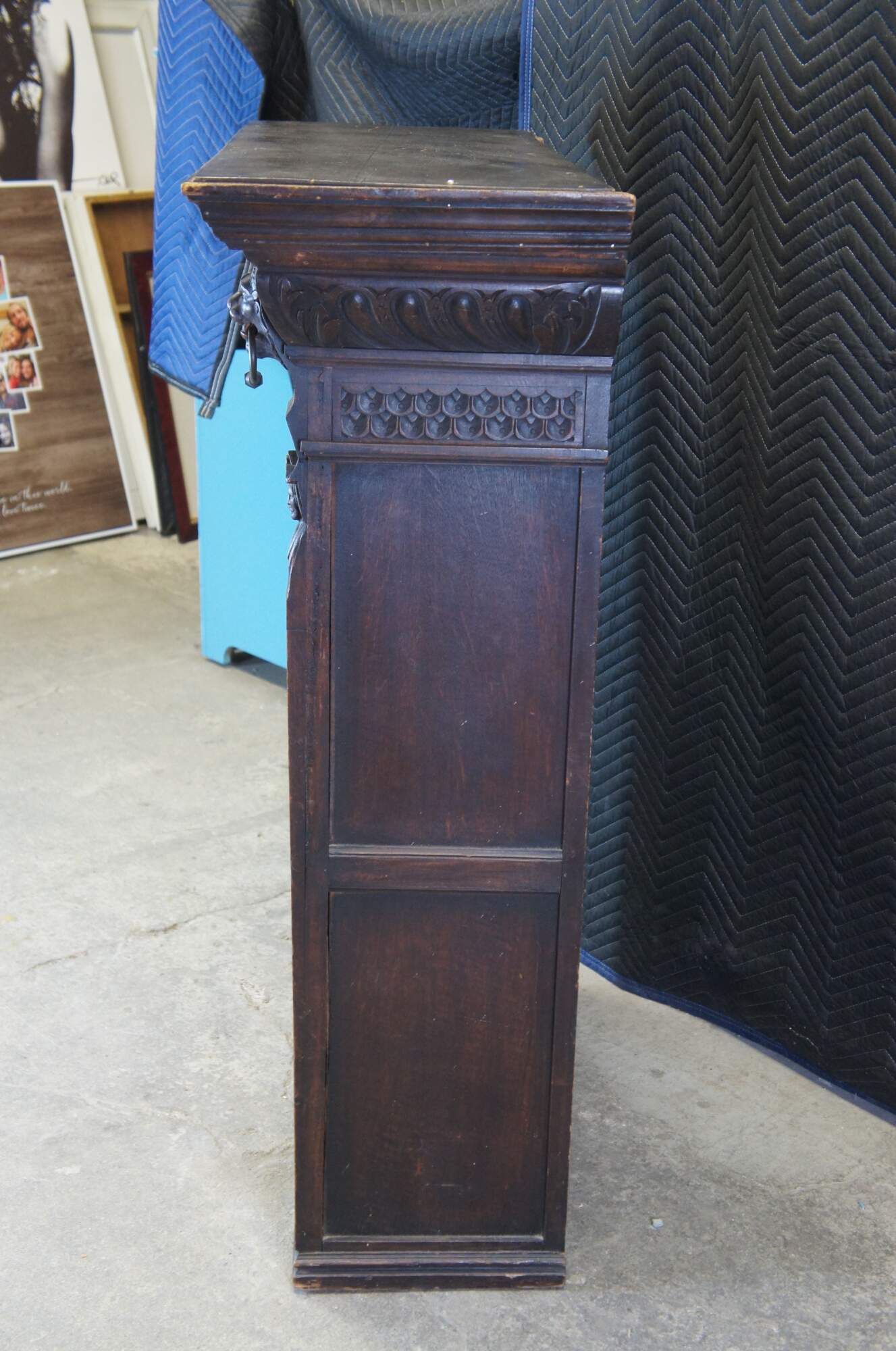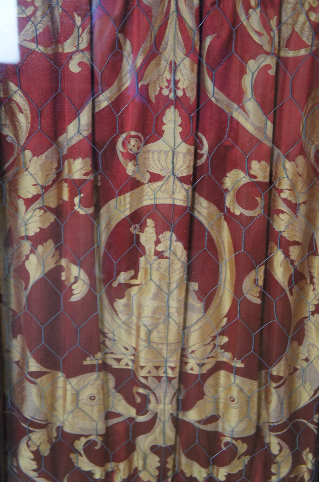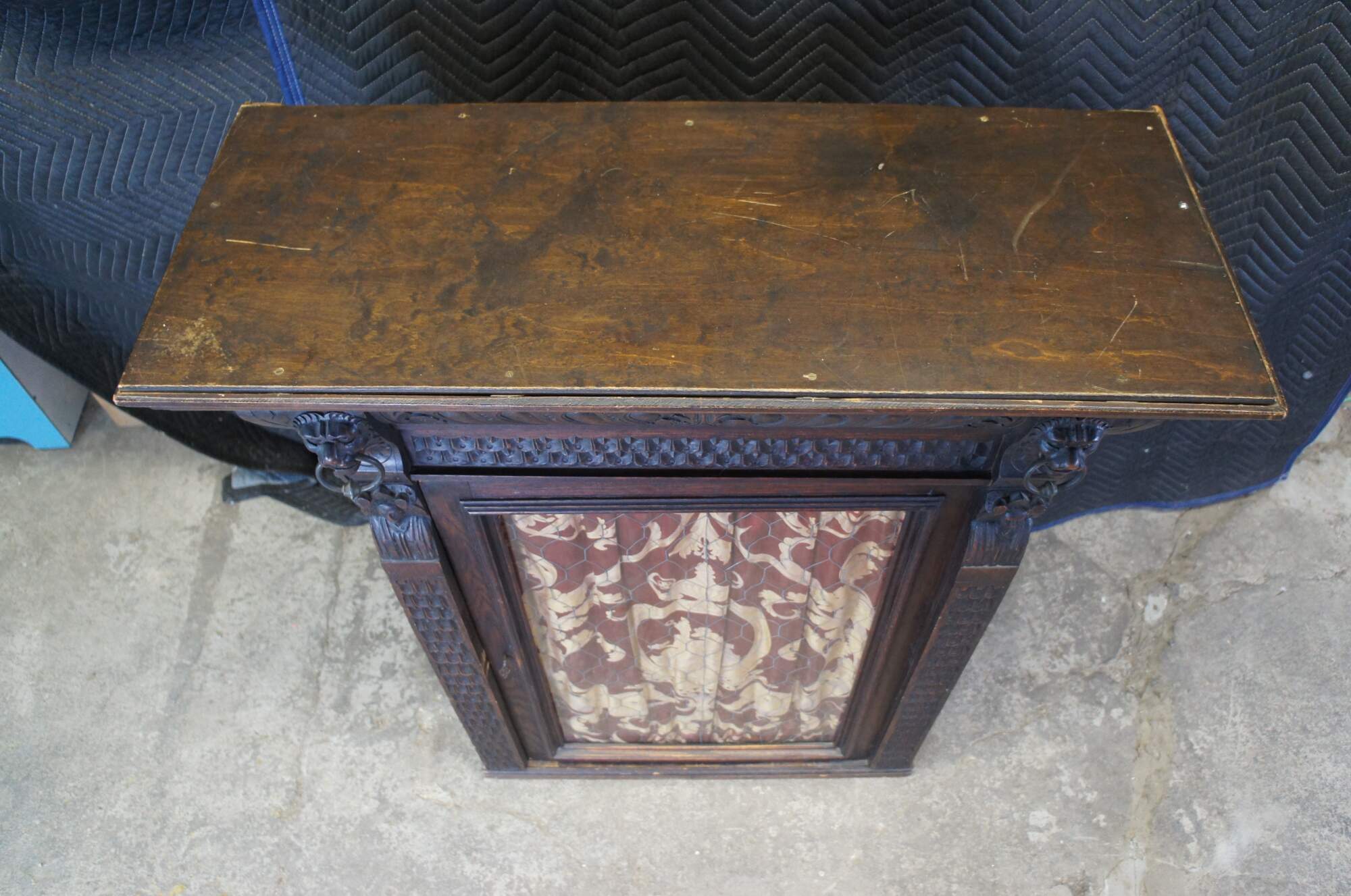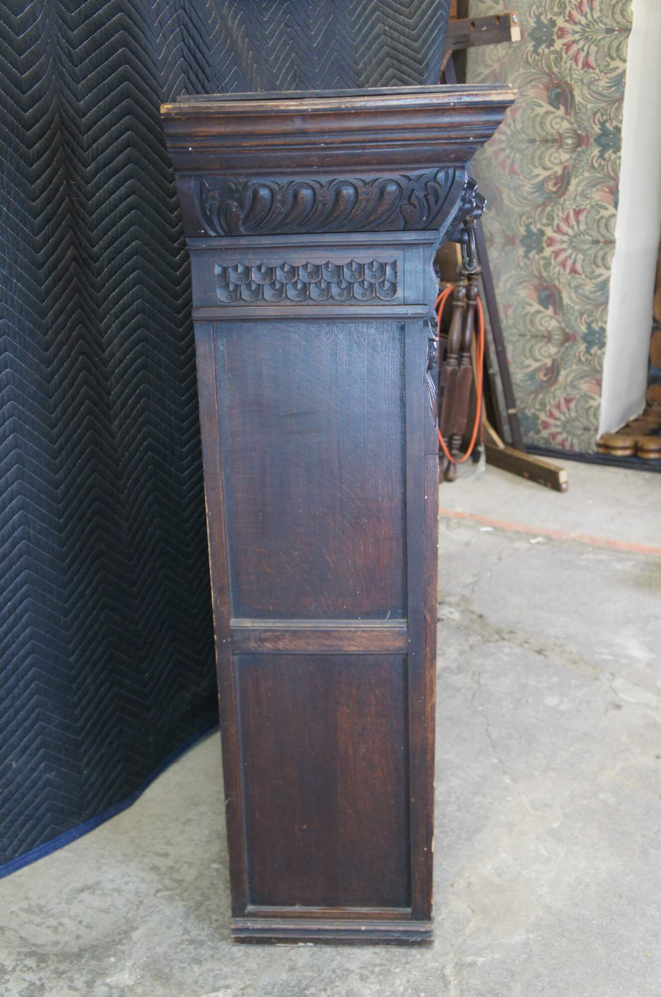 Beautiful late 19th century French Renaissance Revival hanging cabinet. Great for use as a bookcase, curio, vitrine or display cabinet. Made from oak with intricate carved details. Features ornate gadrooning along the crown flanked by carved lion heads leading down to intricate nobleman along the stiles dressed in overcoats with large triangular hats and a mustache. The cabinet is paneled along the sides and opens via glass chickenwire covered door to two interior shelves. Includes a silk curtain with brocade pattern.