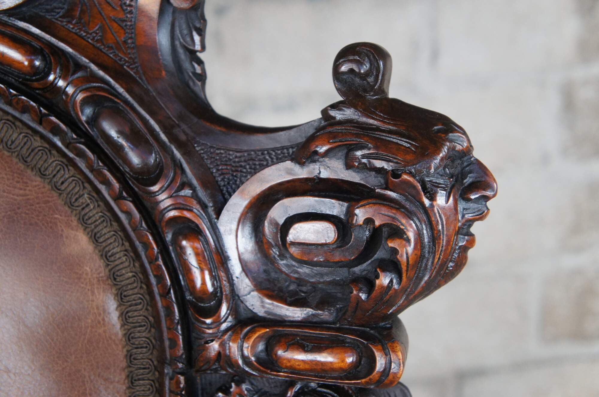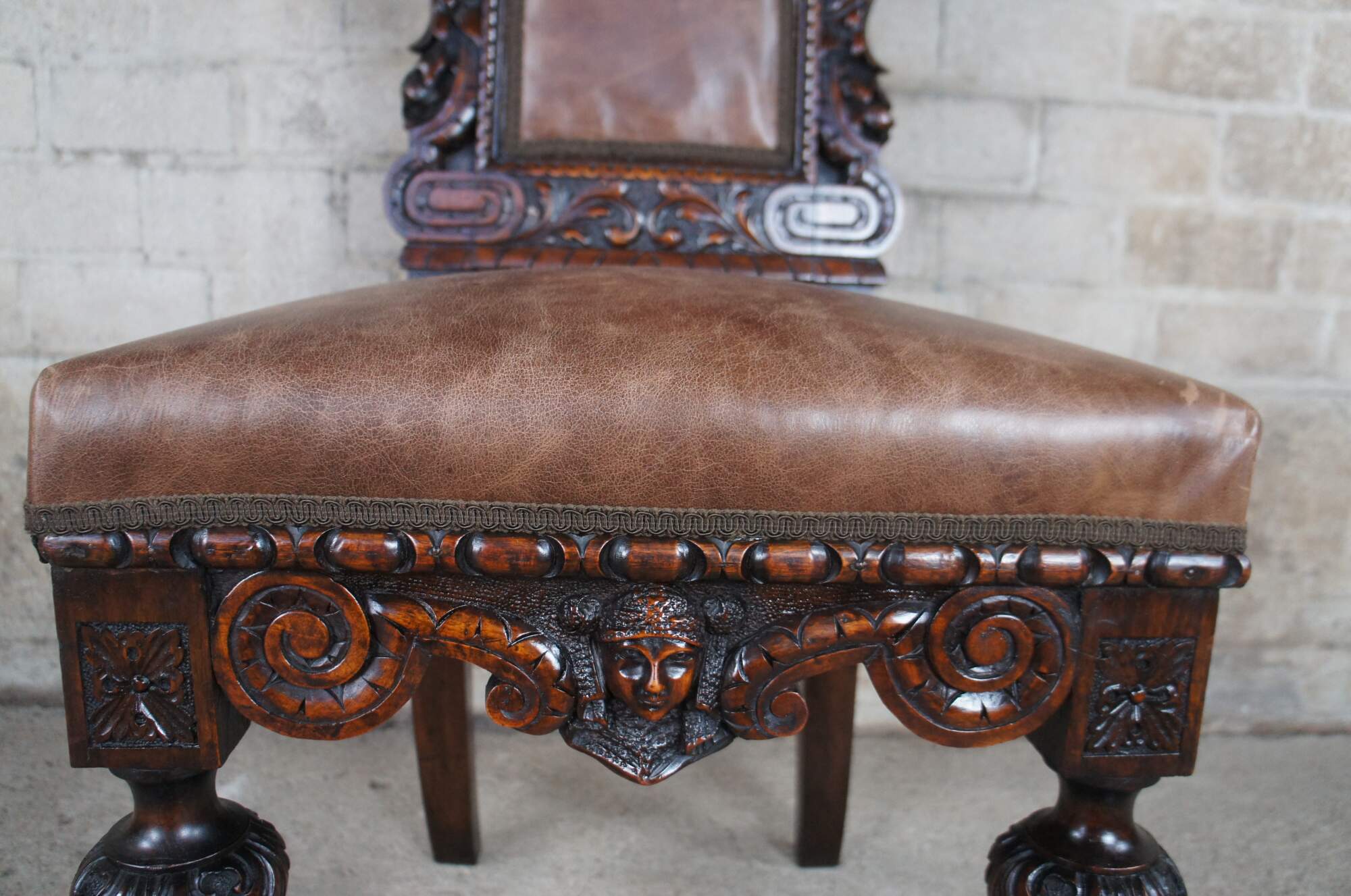 Exceedingly Rare Italian Renaissance Revival style high back mahogany dining chairs, circa 1850-1870s. Each chair is hand carved with an arched and scrolled high back centered by a scalloped shell. The sides showcase figural high relief maidens mirrored below North Wind faces at the ear. Includes acanthus and foliate motifs throughout. Upholstered in a brown top grain leather. Lower aprons feature a carved Guard at the center between an S scrolled Egg and Dart molding and floral medallions at the corners. The chairs are supported by robust acanthus carved baluster turned legs at the front leading to beaded feet.