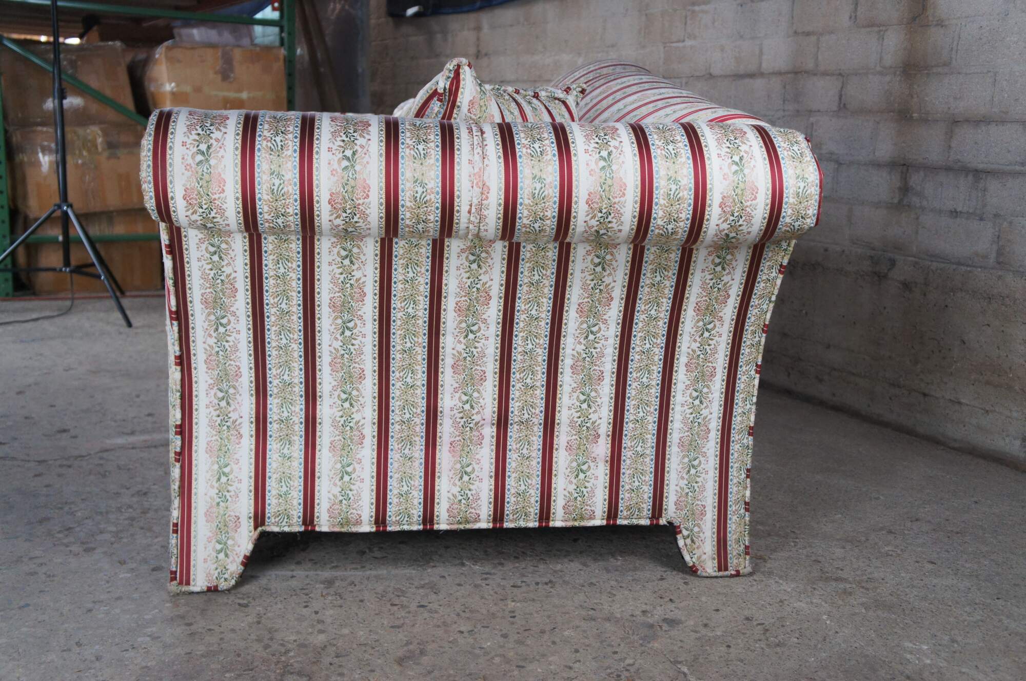 Vintage three seat sleeper sofa / pull out couch with queen size bed featuring Neoclassical styling with rolled arms, camelback and striped floral and ribbon design fabric.