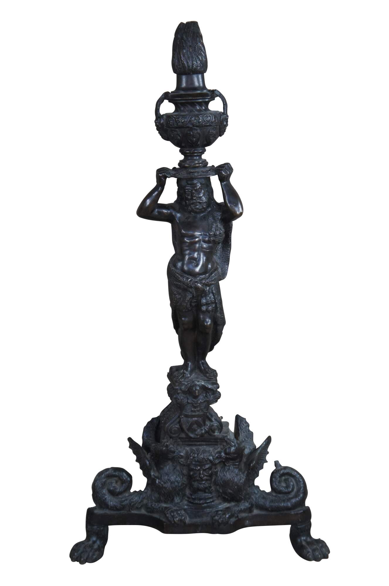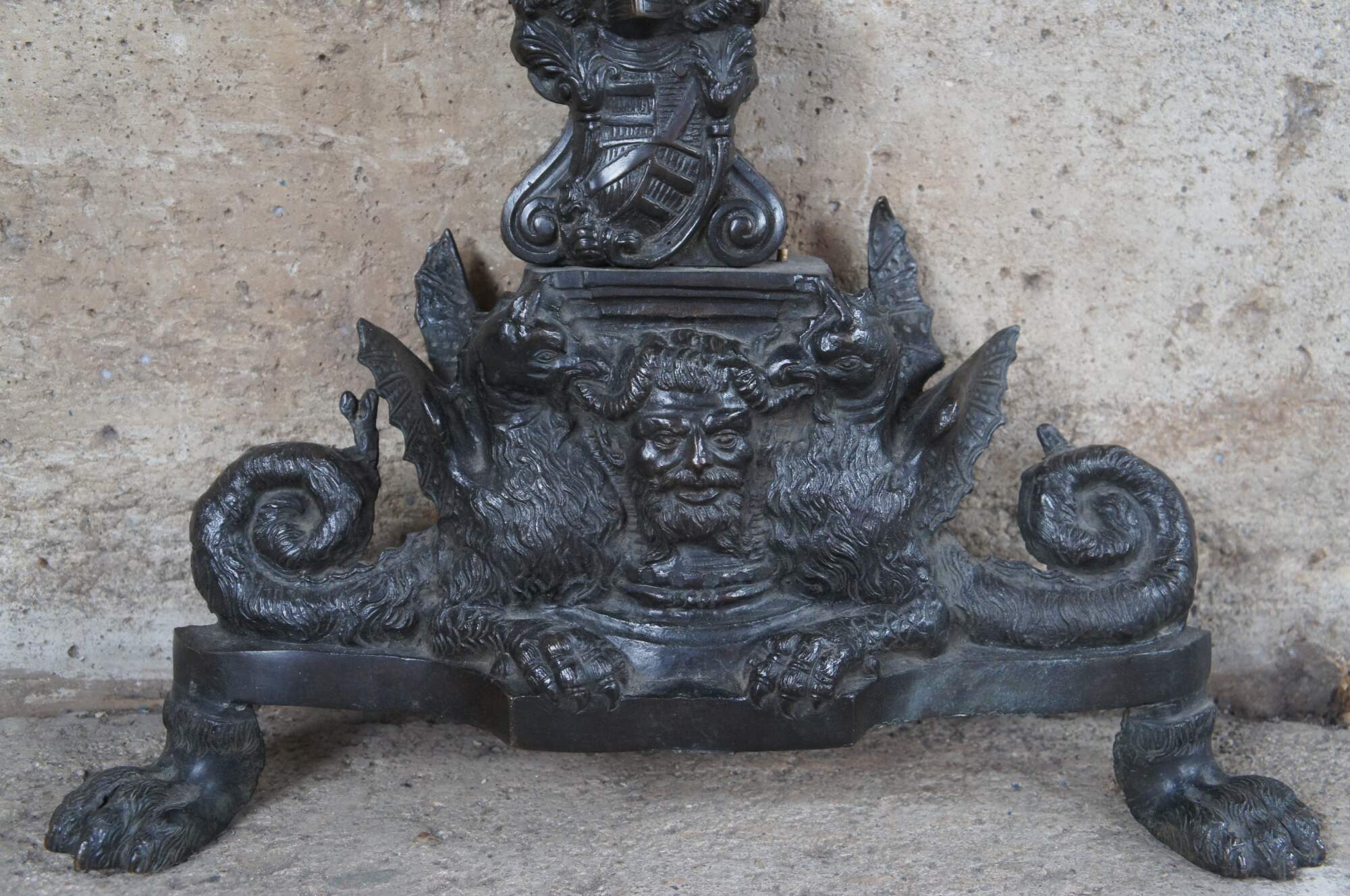 Monumental antique Italian Renaissance Revival hearthware andirons. This large and impressive pair is made of bronze featuring ornate styling with two figures holding torchiere flames above their heads, a crest / coat of arms, supported by two griffons / gryphons / dragons flanking a mans face over hairy paw feet.