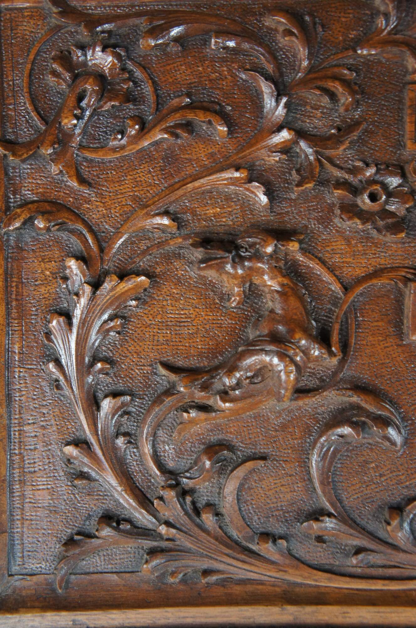 Antique Neo-Renaissance Revival writing desk. Made of walnut featuring Neoclassical styling with high relief figural carvings of cherubs / puttis, Northwind faces, and acanthus / floral designs. The desk features a drop front door with griffons and castle courtyard scene that opens to multiple cubbies and storage compartments with and additional pull out writing surface, supported by four turned legs connected by serpentine stretcher with cherub busts.