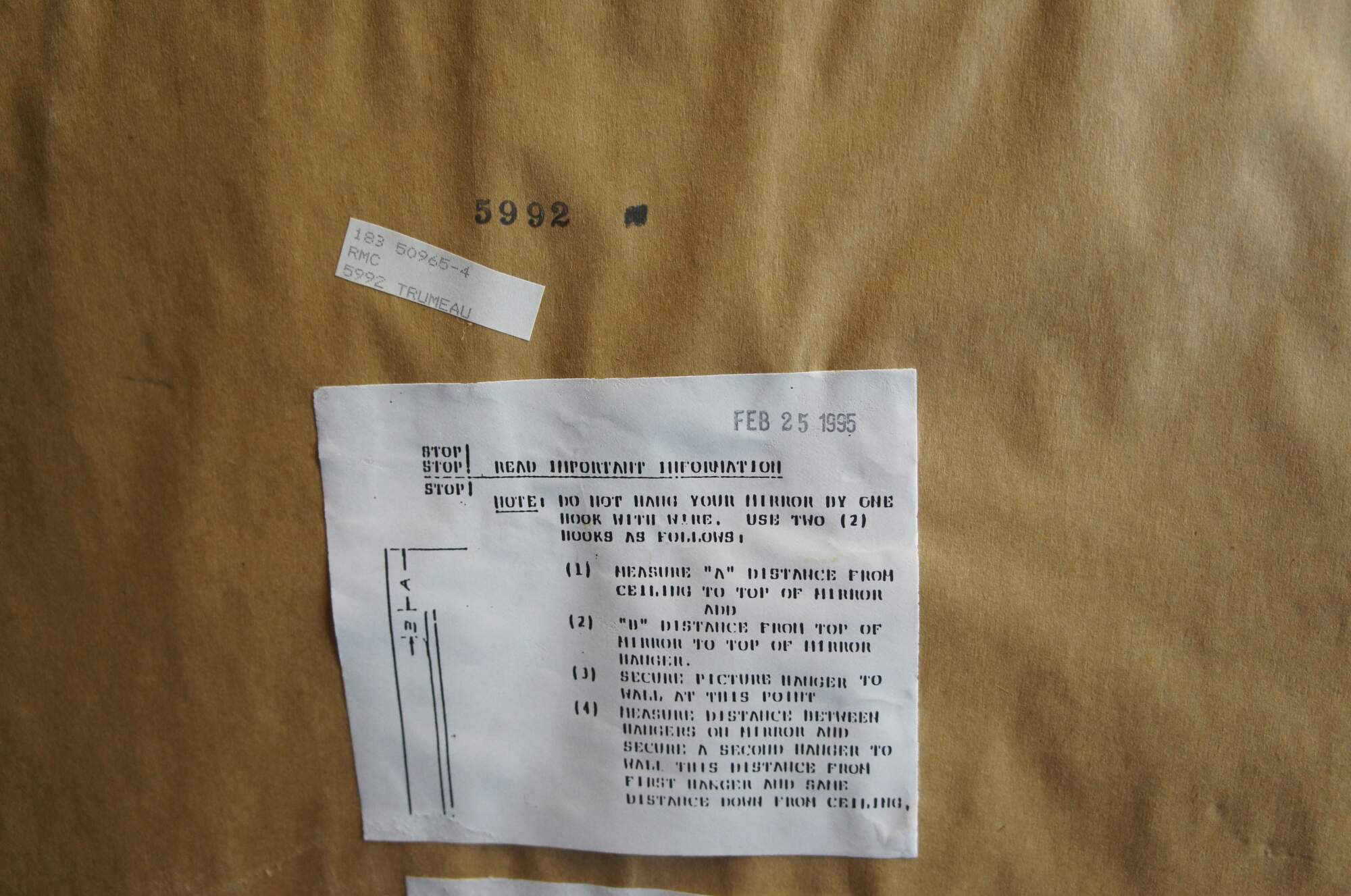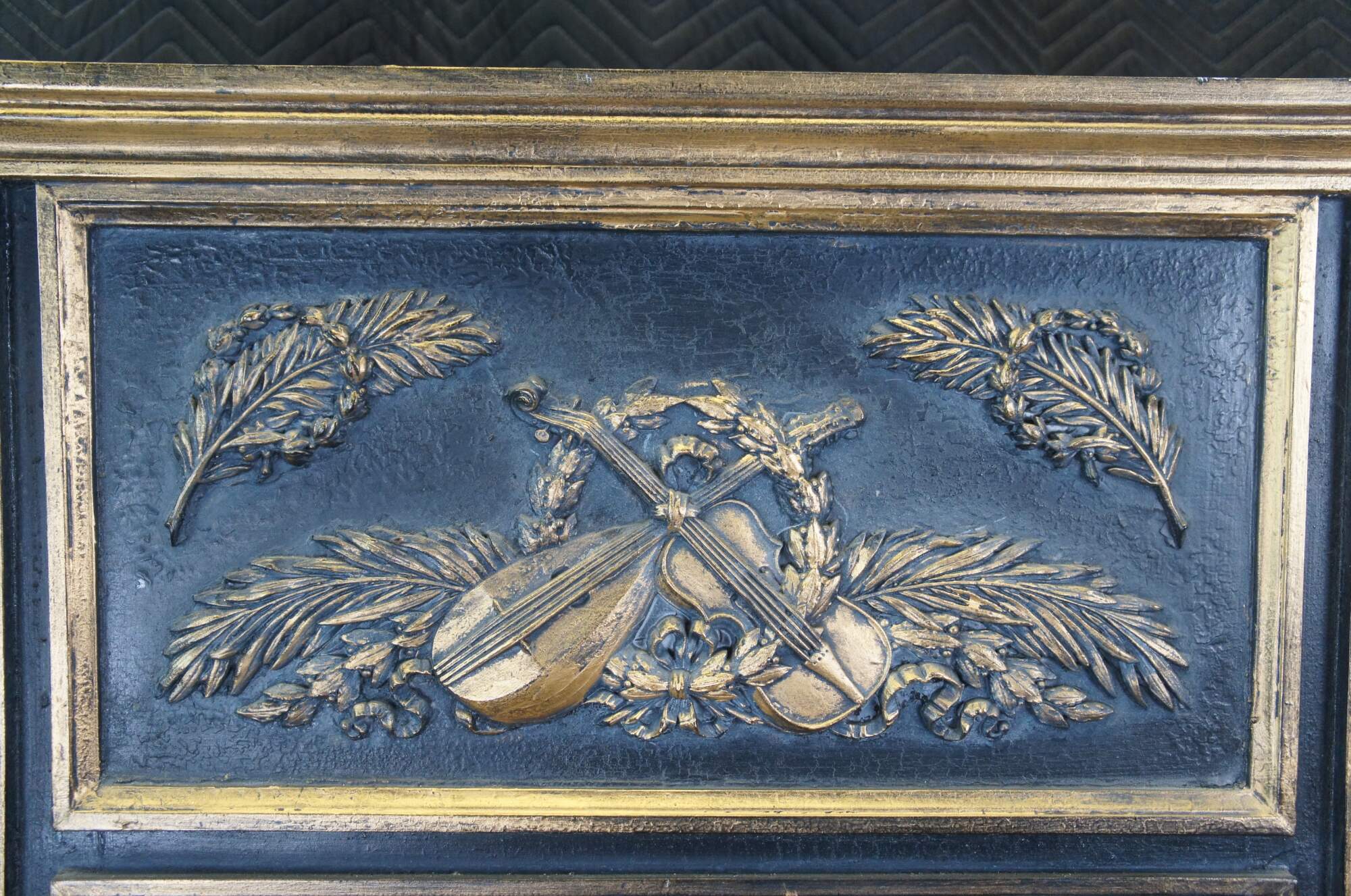Late 20th Century Italian Neoclassical style trumeau wall mirror Finished in black with gold details. Features a harp and lute intertwined at the center within a wreath and neoclassical ribboning. This scene is flanked by trophy urns along the top of the stiles and jardinières near the base with cherubs poking out from the top holding baskets. Made in 1995, 5992 Trumeau