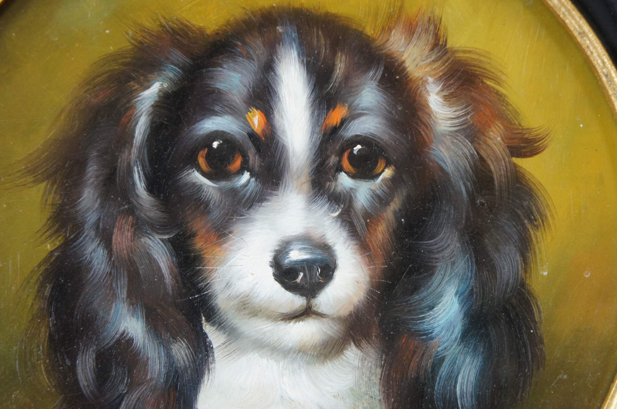 A lovely 20th century oil painting of a King Charles Spaniel with blue collar over a yellowish green background. The painting is on board and framed in a round black / gold wood frame.