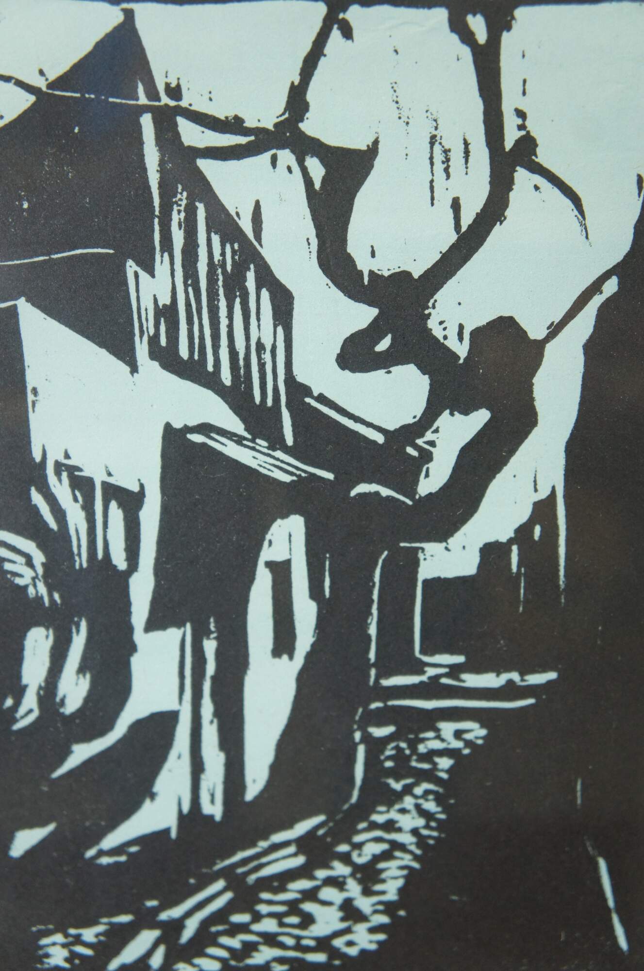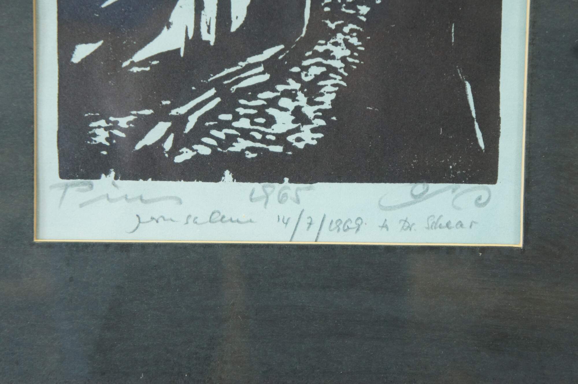Pins, Jacob (Ger./Isr., 1917-2005). Cobbled path with house and tree in Jerusalem. The print is dated 1965 with an inscription below as a gift to Dr. Schear in 1969. Framed and matted.