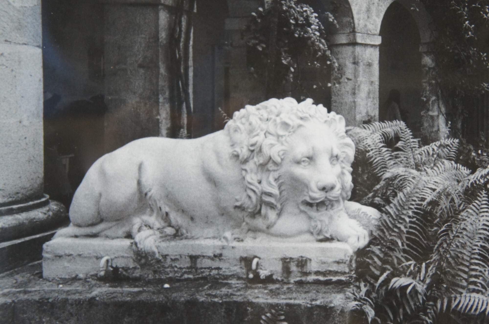 A sculpture of a lion in a garden by Patrick Litchfield
