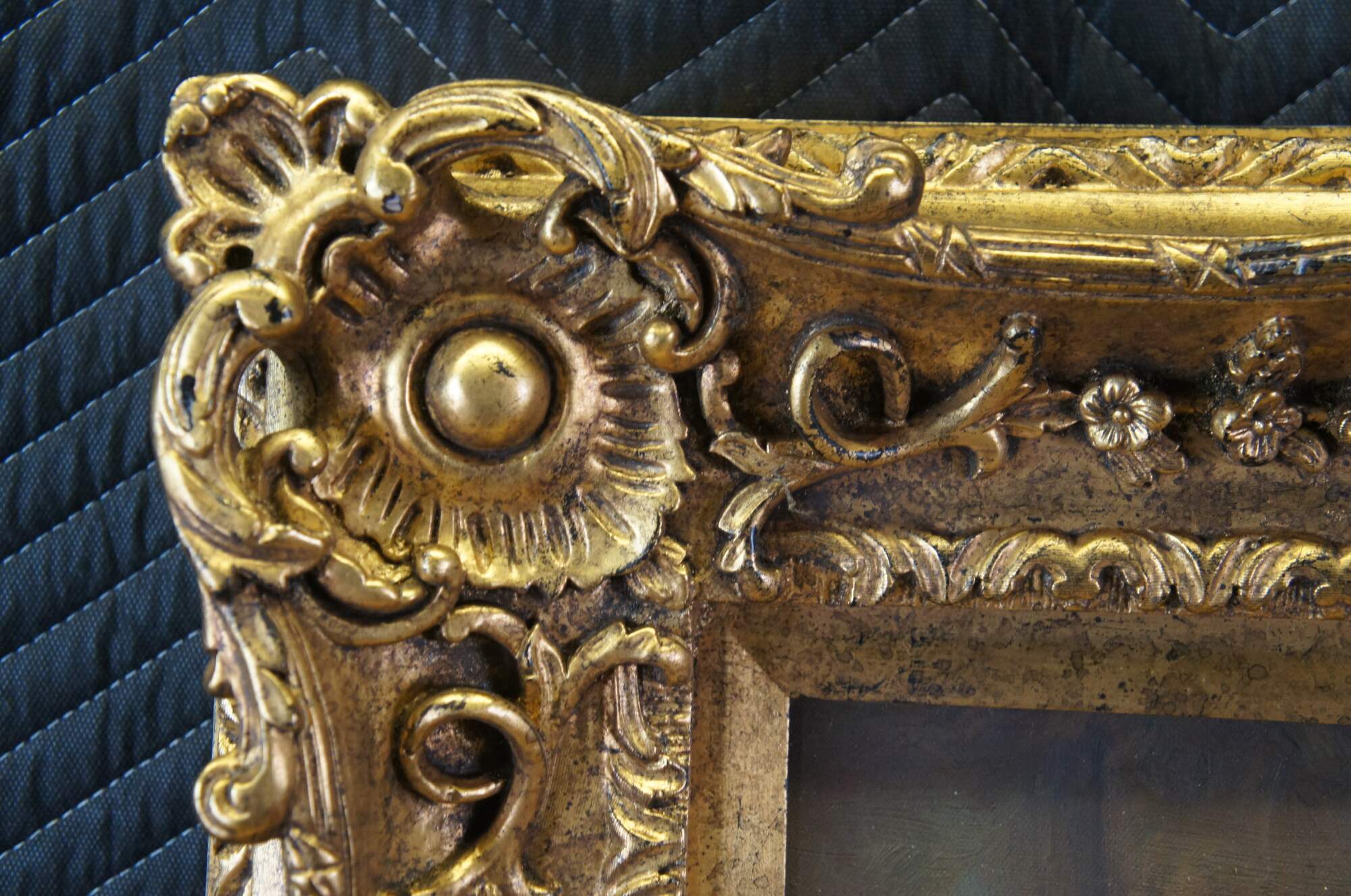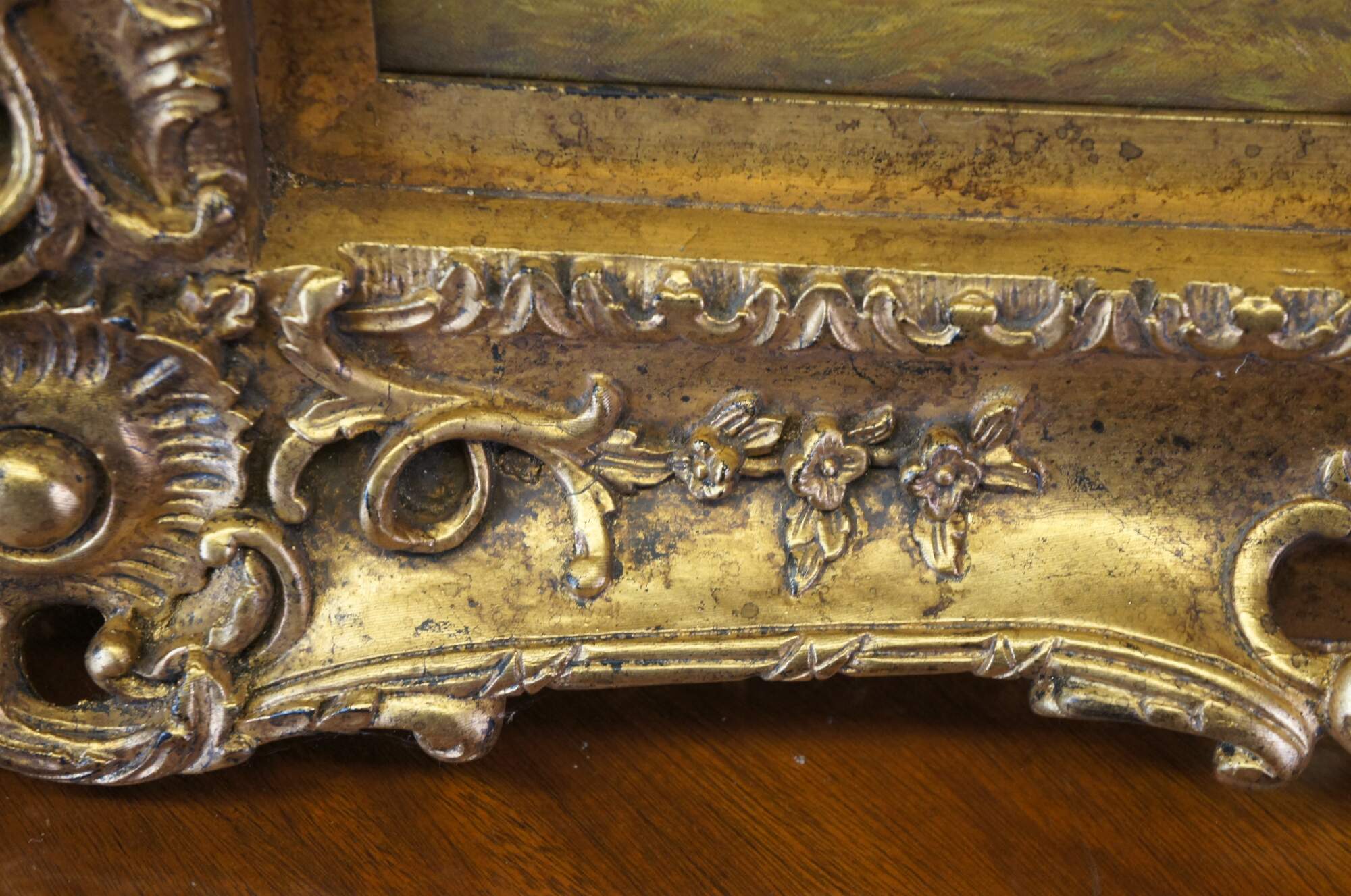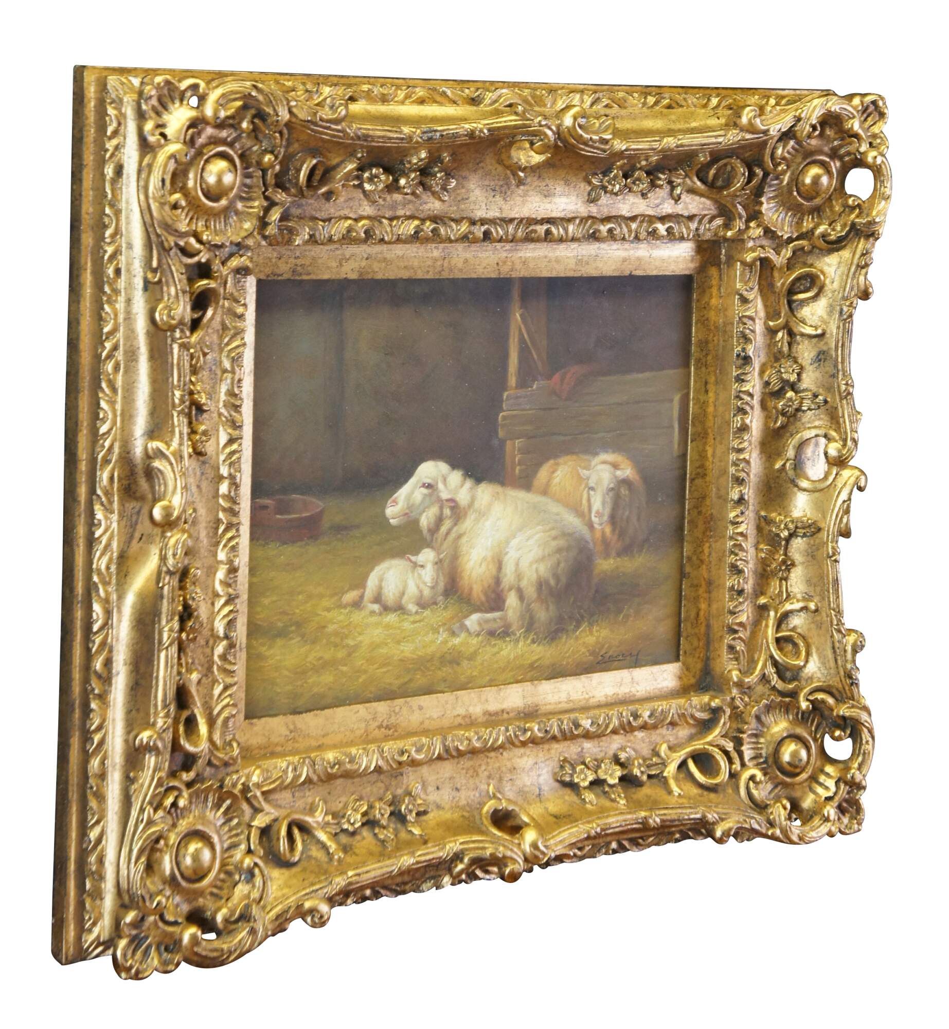 A quaint oil painting of Resting sheep in a barn, circa last quarter 20th century. The painting is after Enoch Crosland and signed lower right. The canvas is framed in pine and finished in gold with raised floral accents and rococo designs.