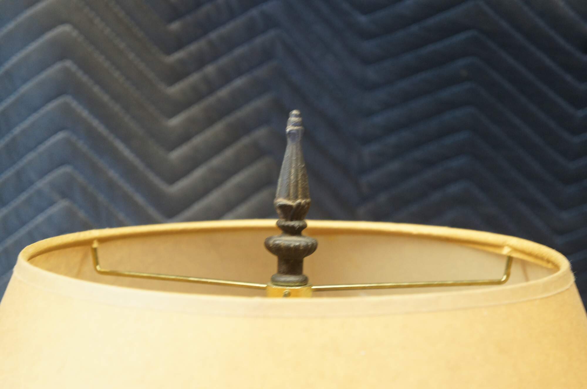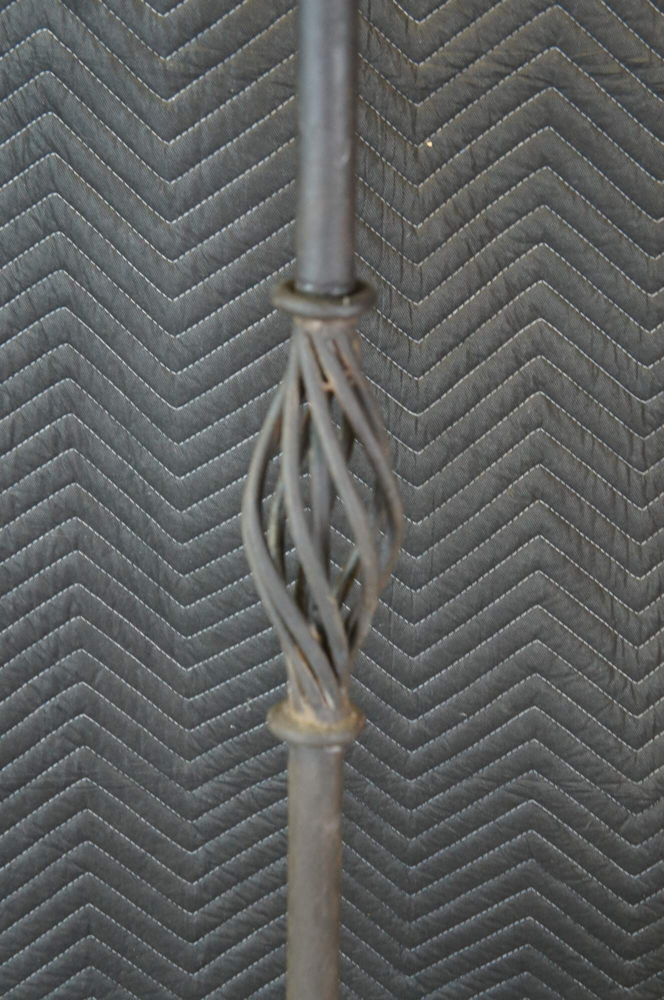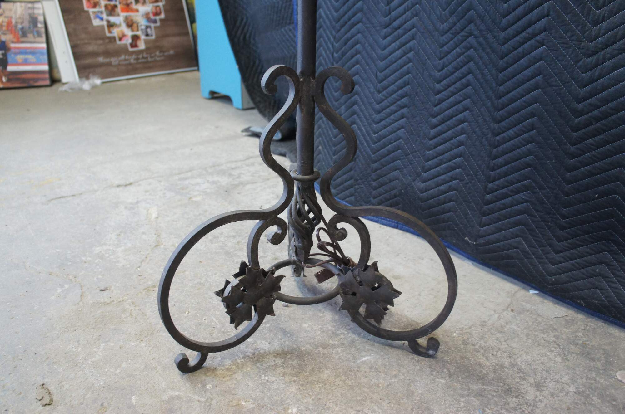 Late 20th Century Spanish Mediterranean ornate wrought iron floor lamp, will candlestick topper and drip pan. Features a tripod base with scrolled accents and open twisted column at the center. The base is accented by 5 petal florets. Includes shade and spire finial.