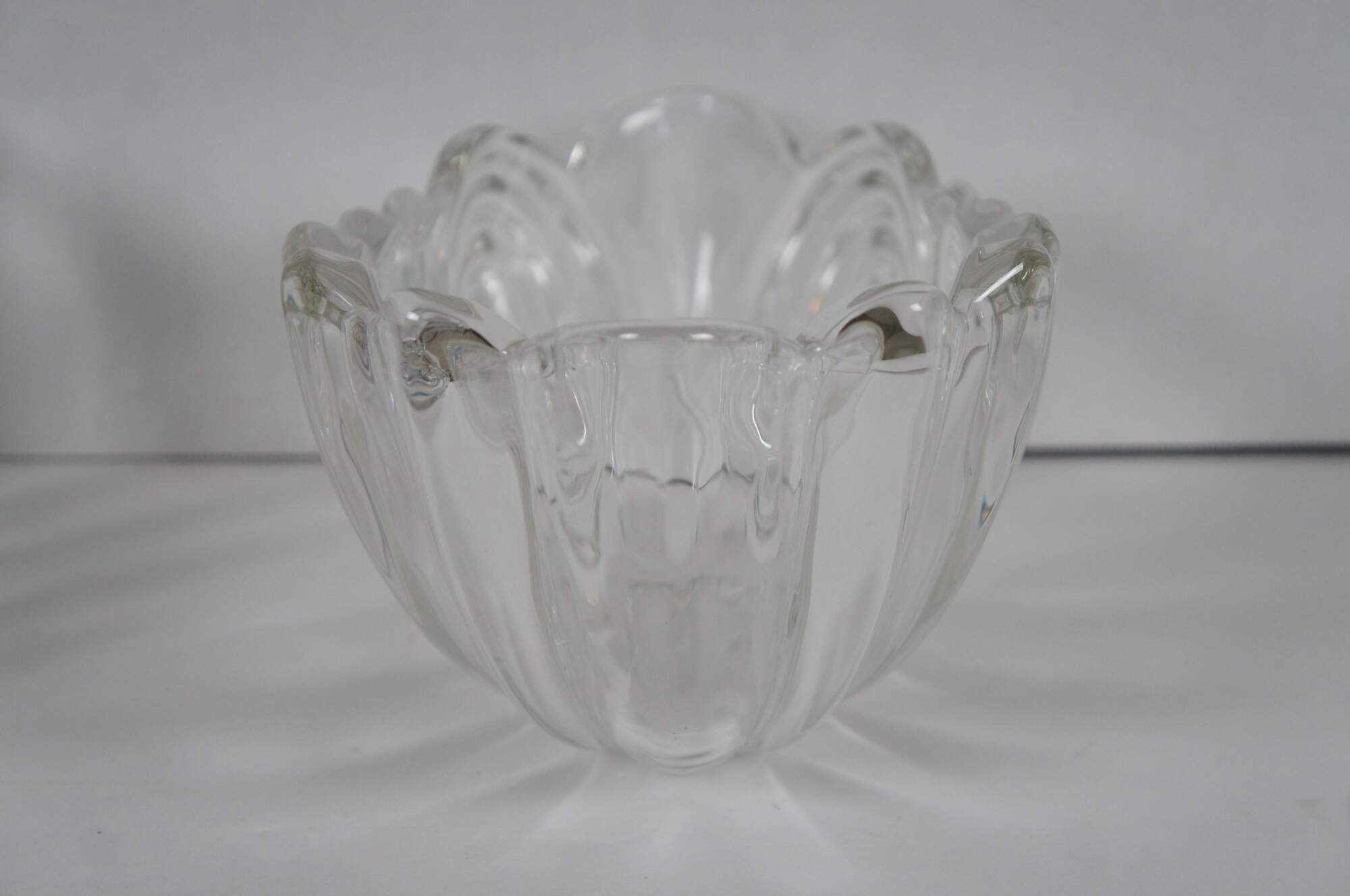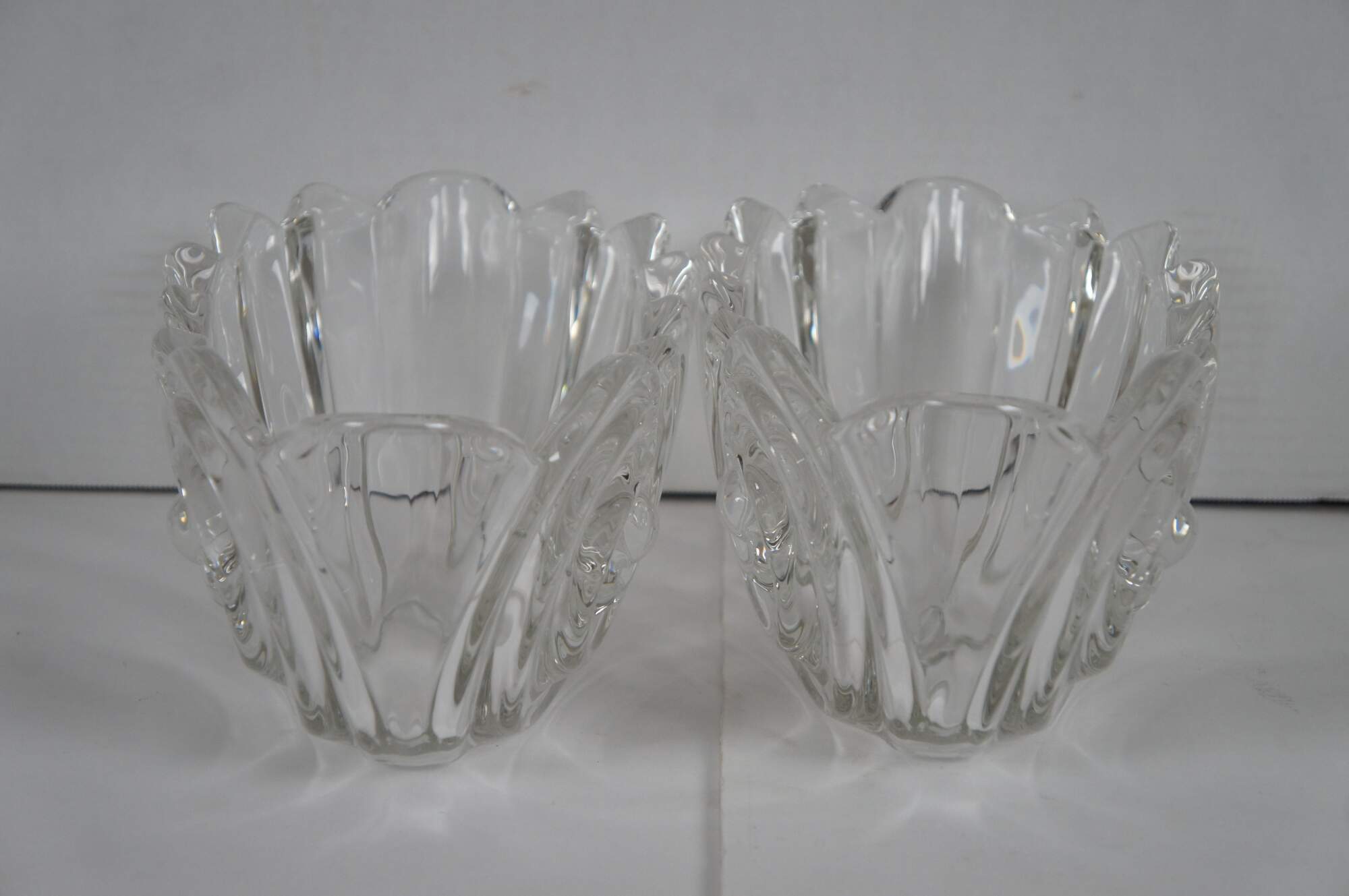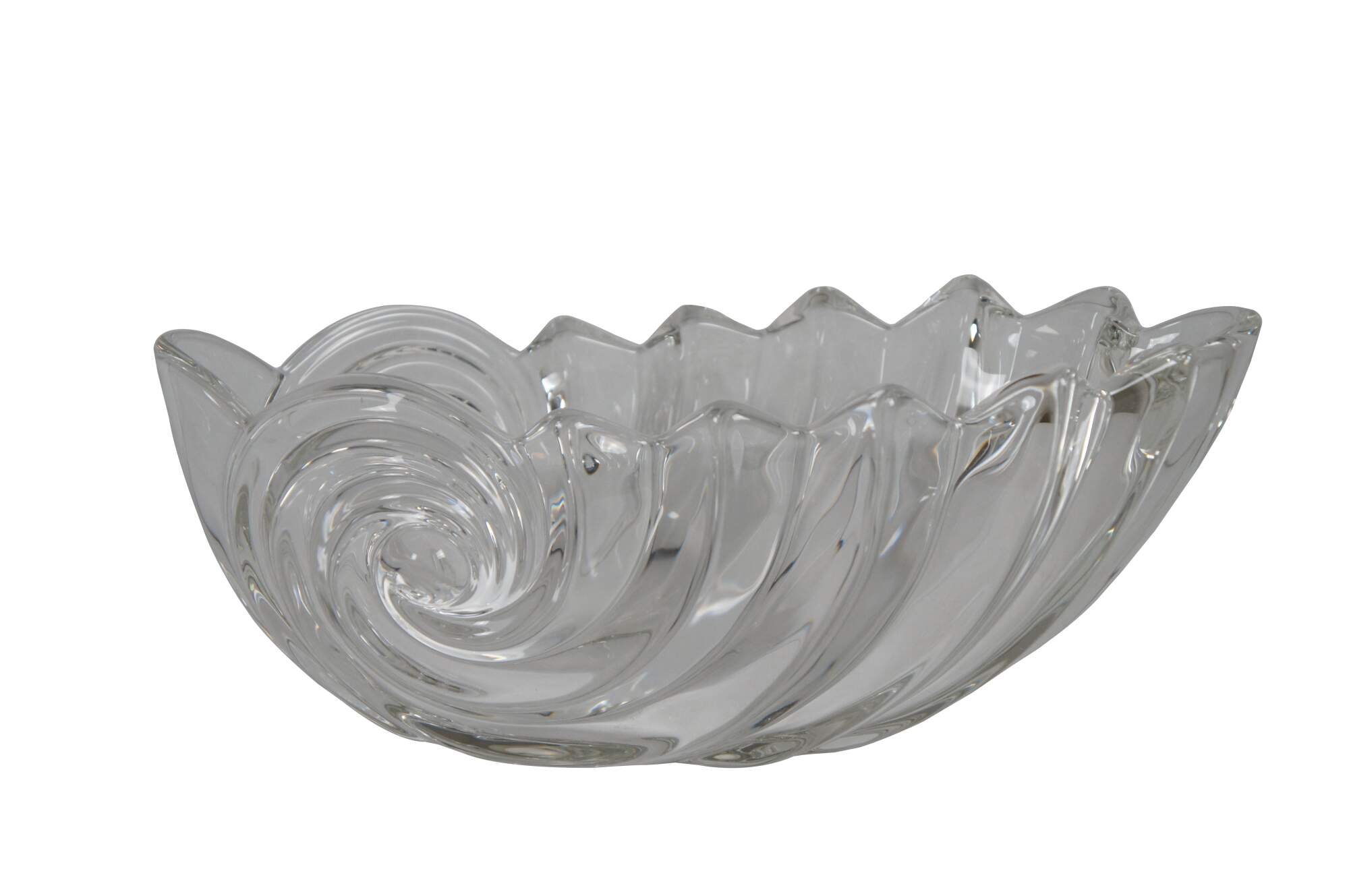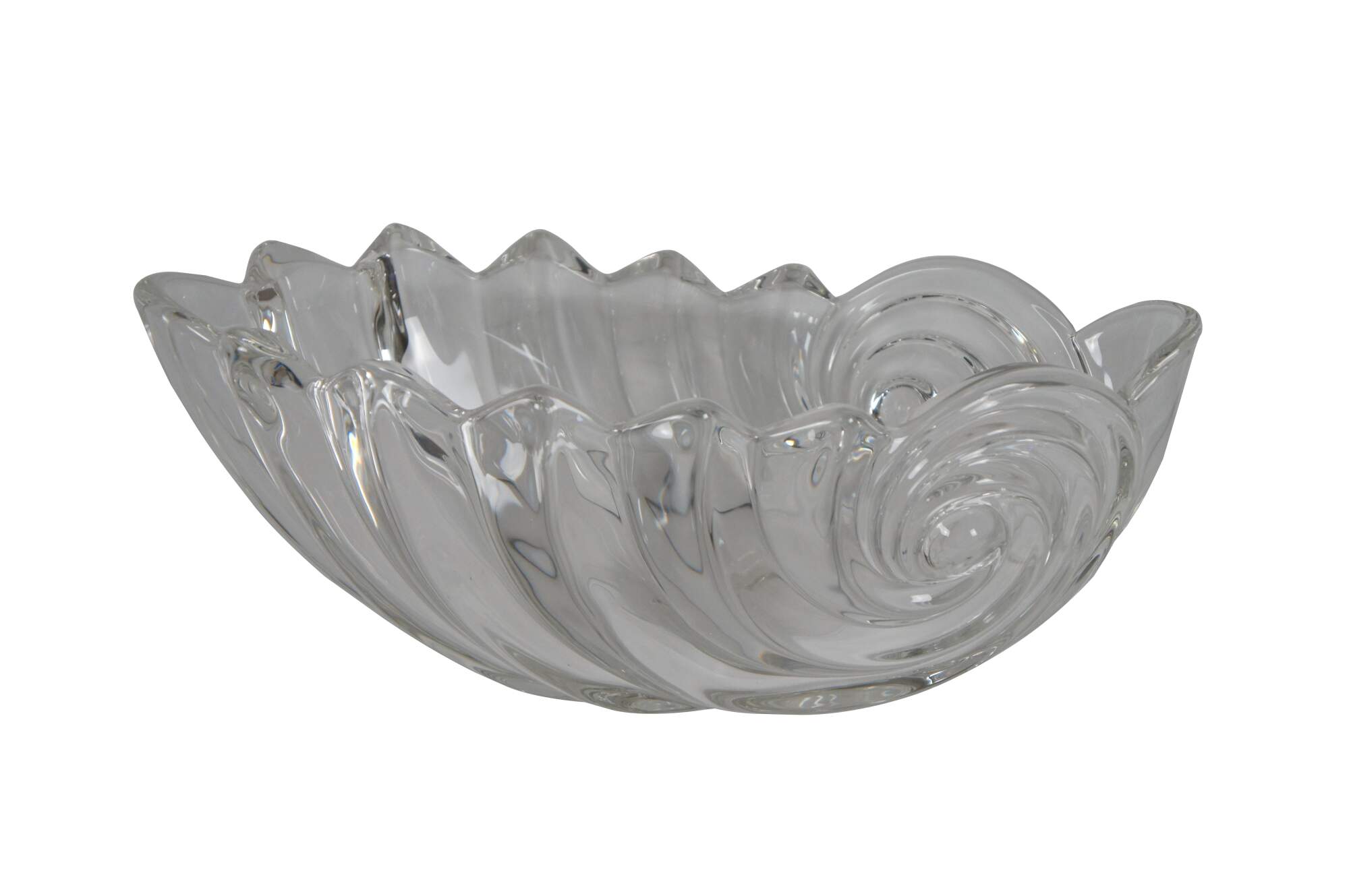 Pair of vintage circa 1990's Mikasa Clearwater crystal buffet bowls / centerpieces in the shape of a rolling wave or nautilus spiral sea shell.