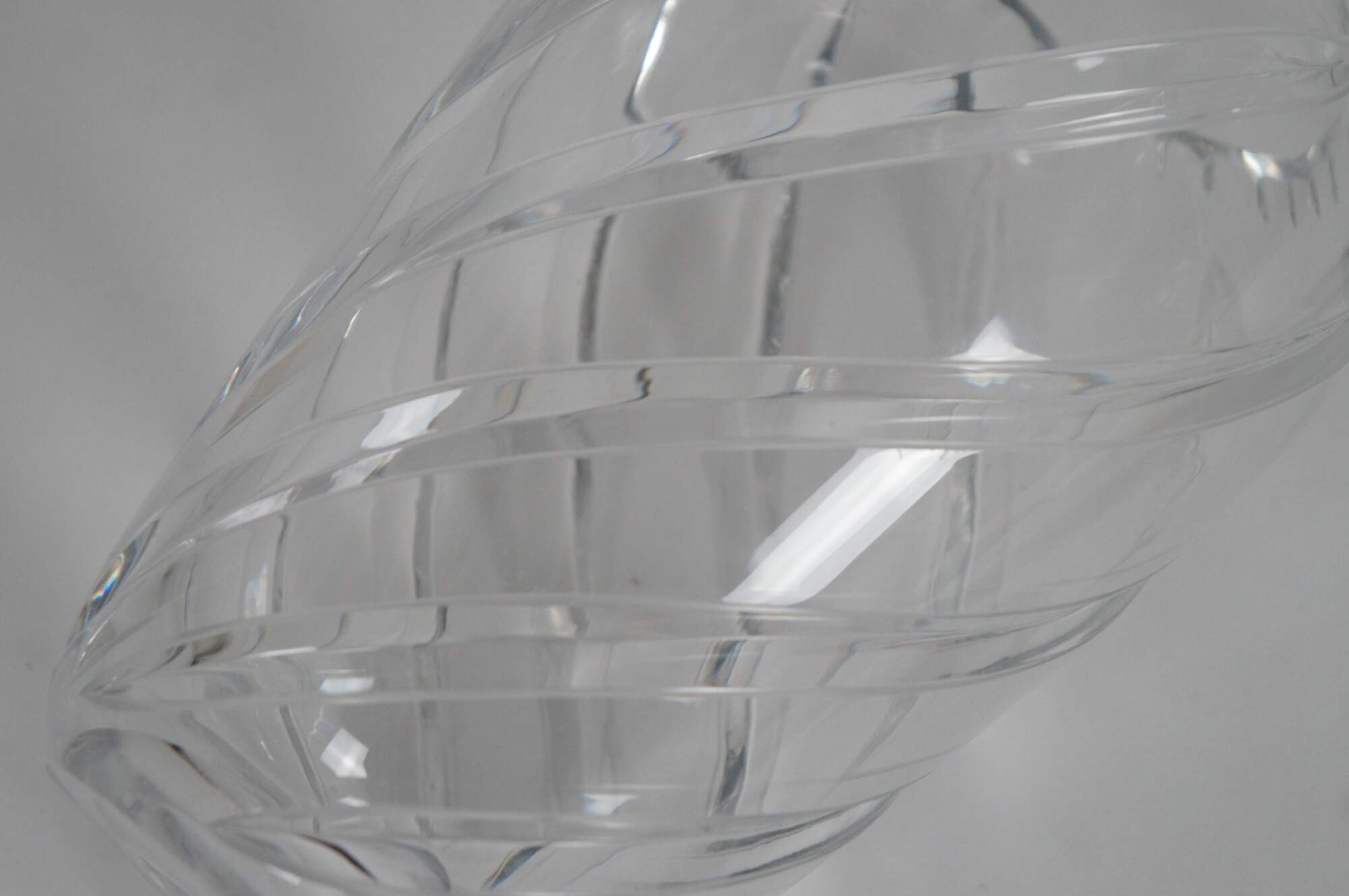 Vintage clear crystal flower vase featuring a cut pattern of parallel slashes spiraling around the body and thumb print upper rim.
