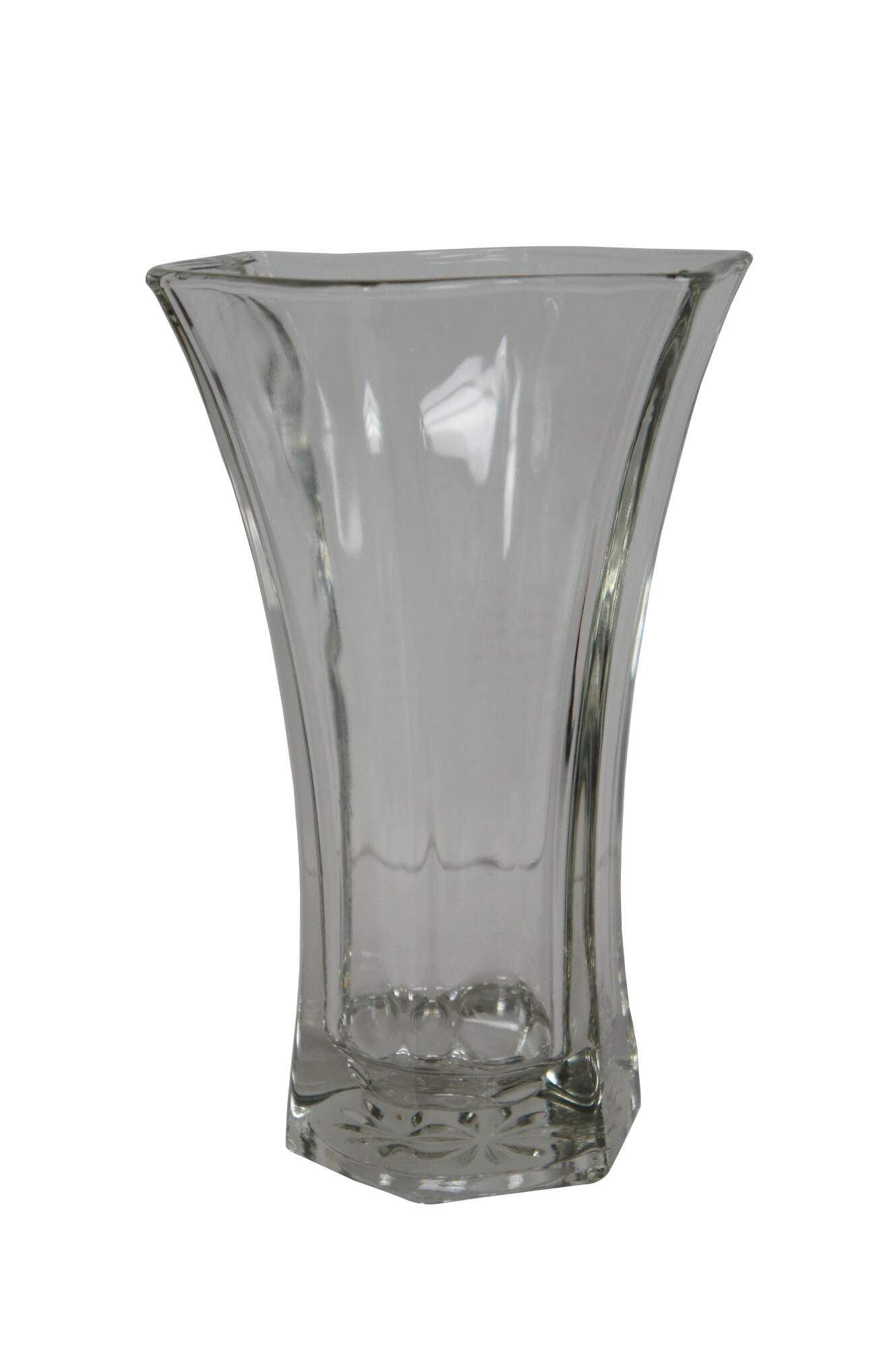 Vintage 1970s-1980s flower vase by Indiana's Hoosier Glass, item number 4041, featuring a hexagonal faceted shape and wide flared mouth..