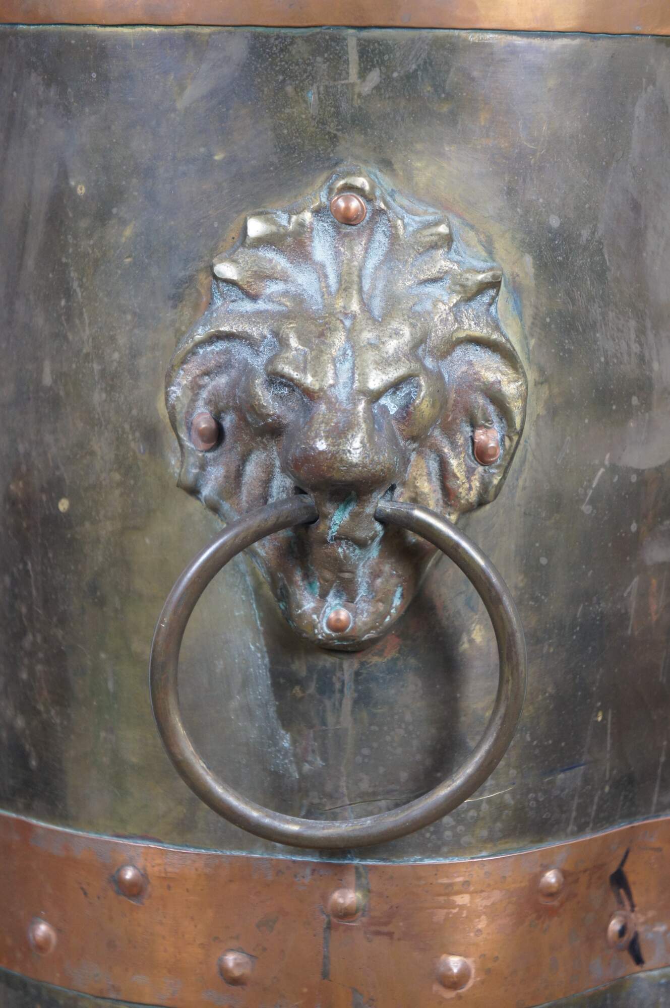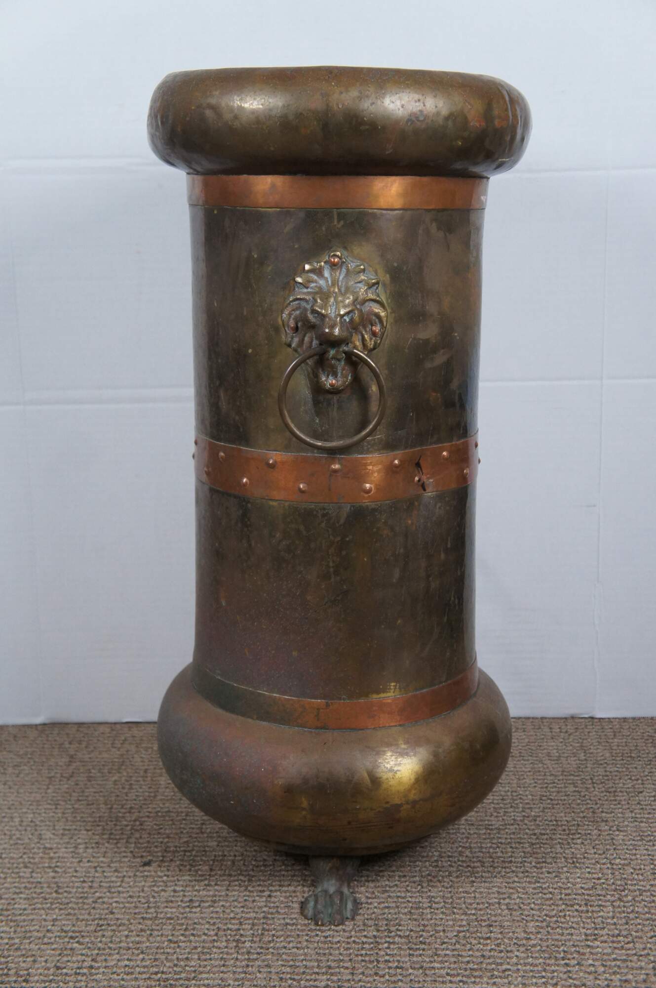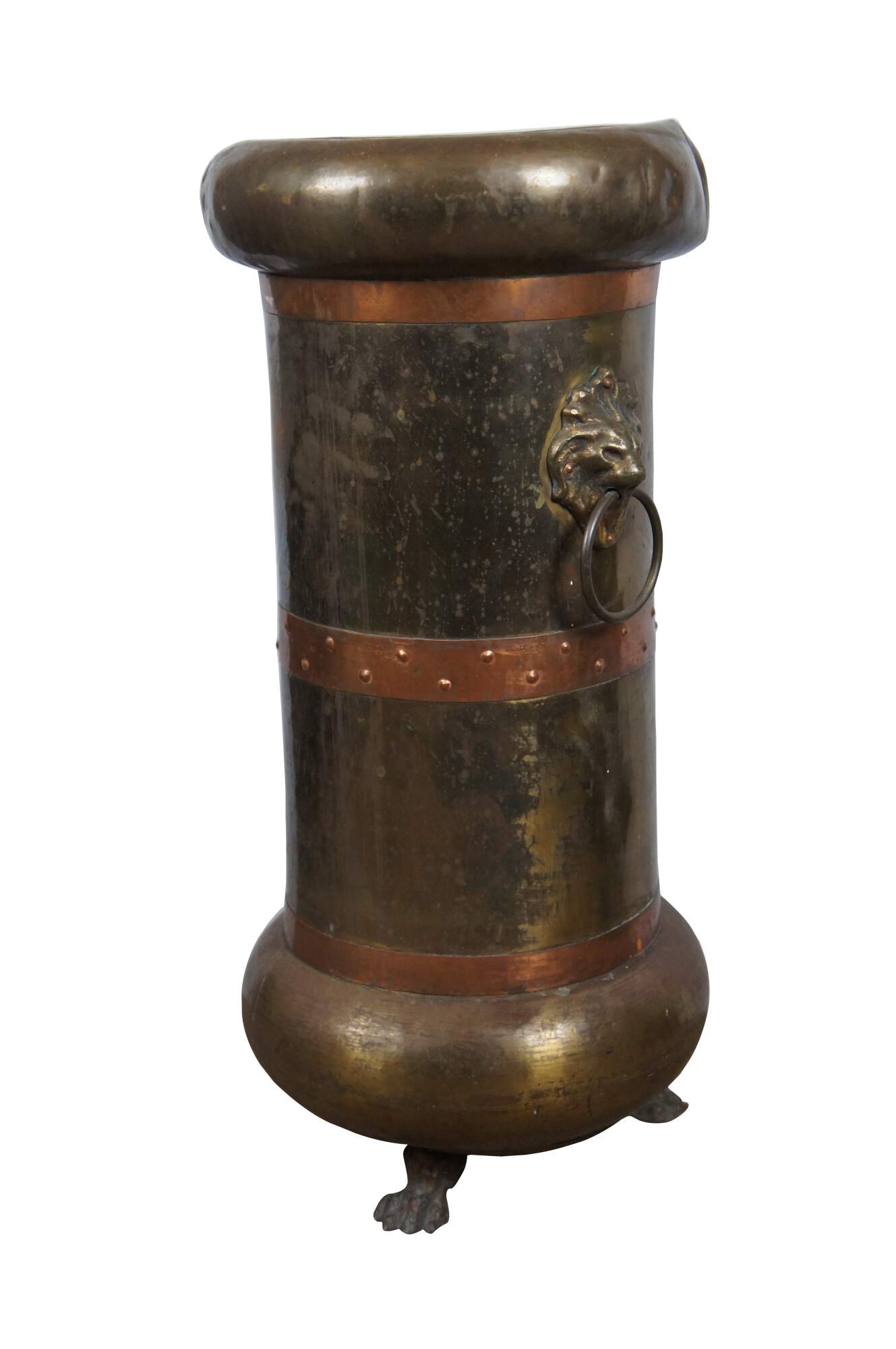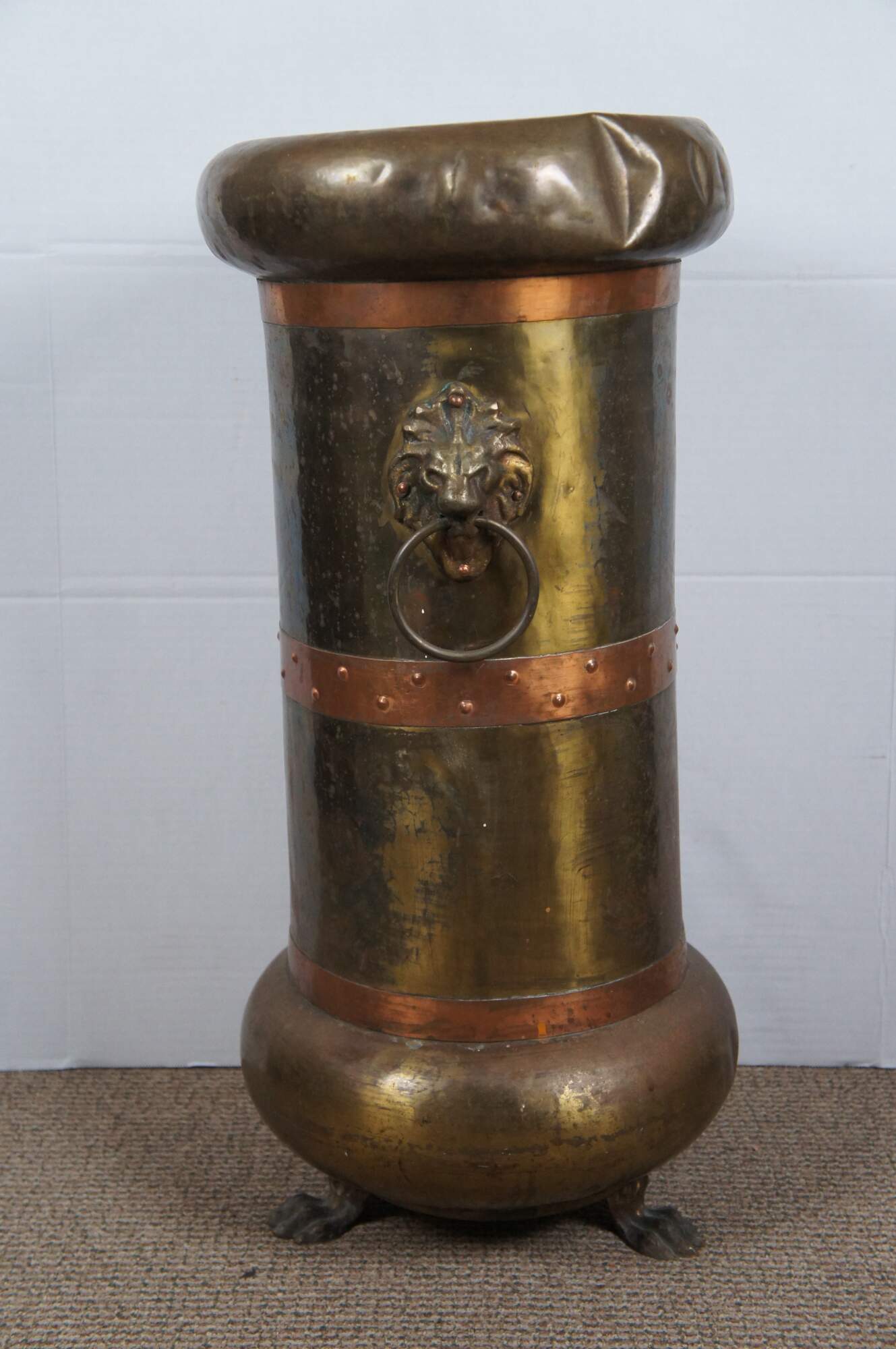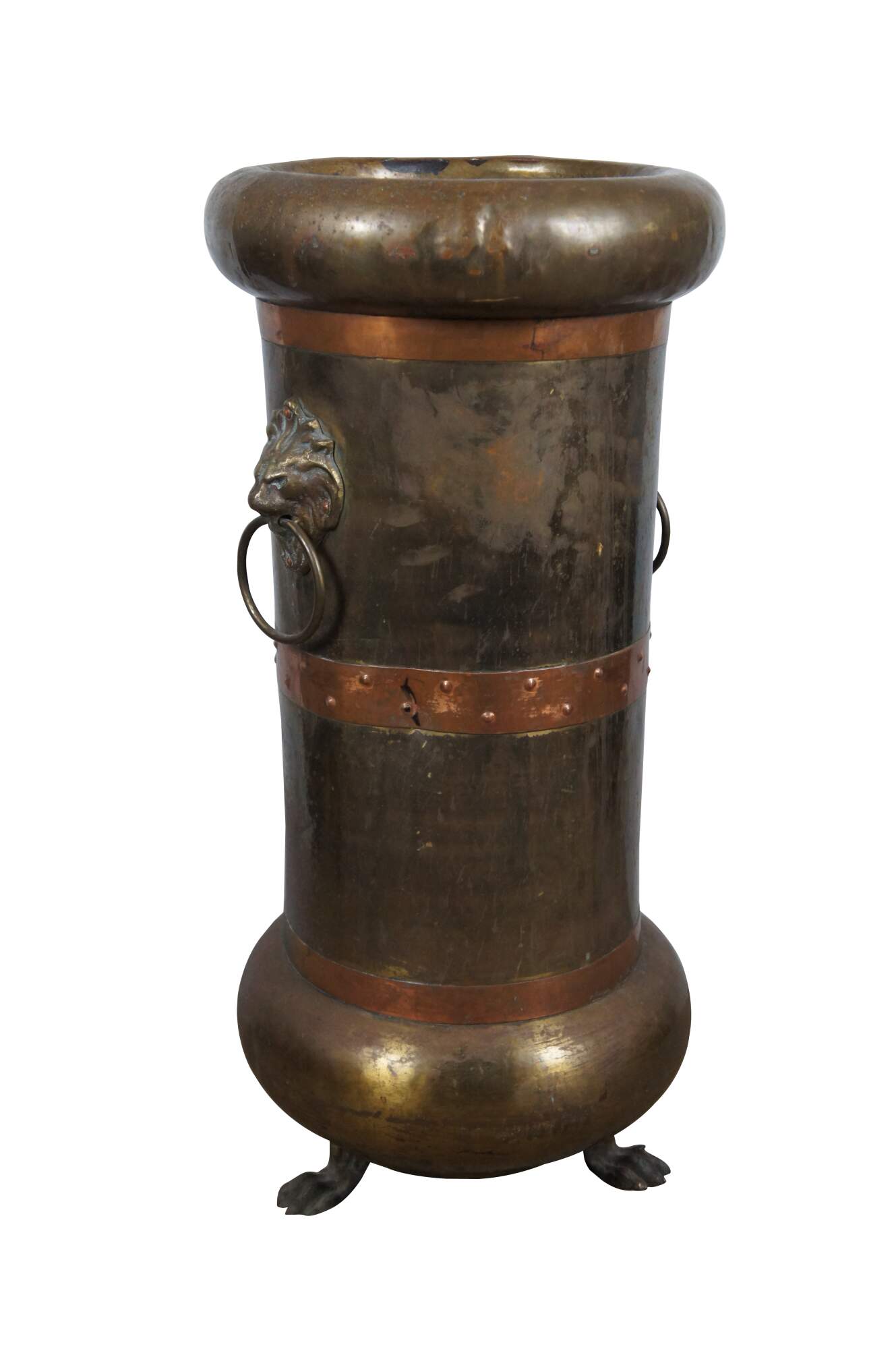 Antique arts and crafts Russian made floor vase / umbrella / cane stand, crafted of brass with a lobed base and rim, copper bands, lion's head door knocker style handles and claw / paw feet. Marked in Cyrillic on base.