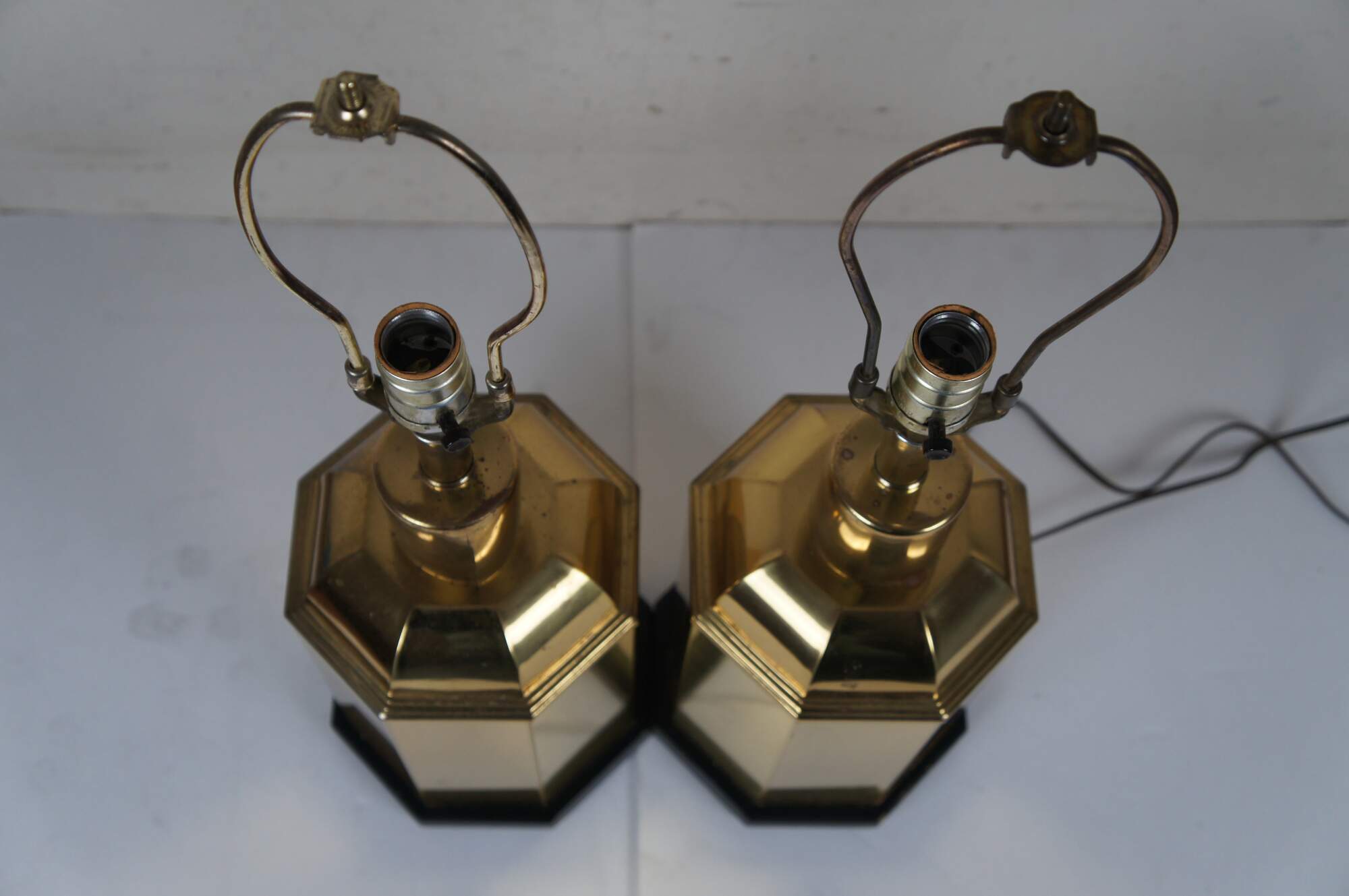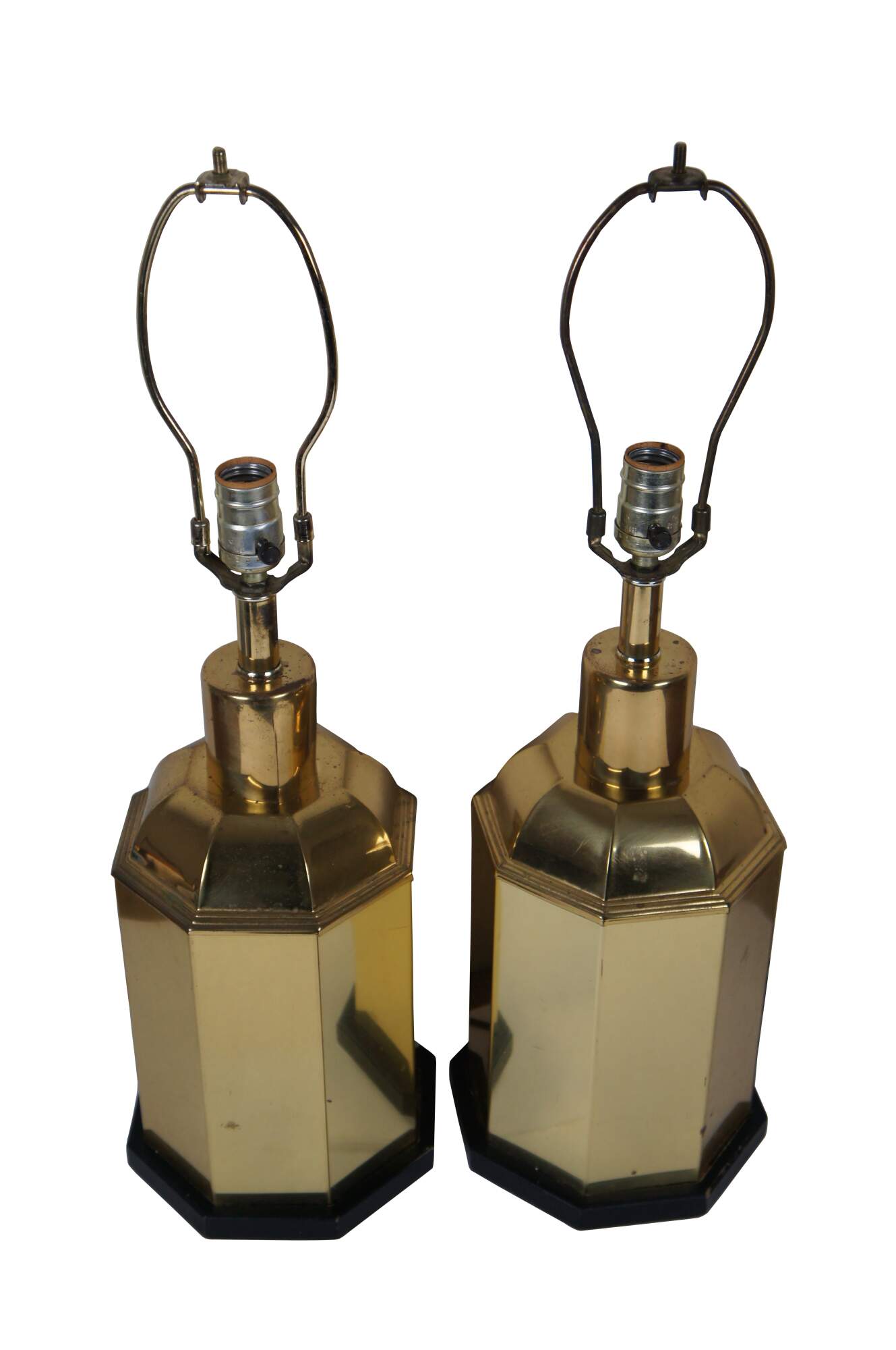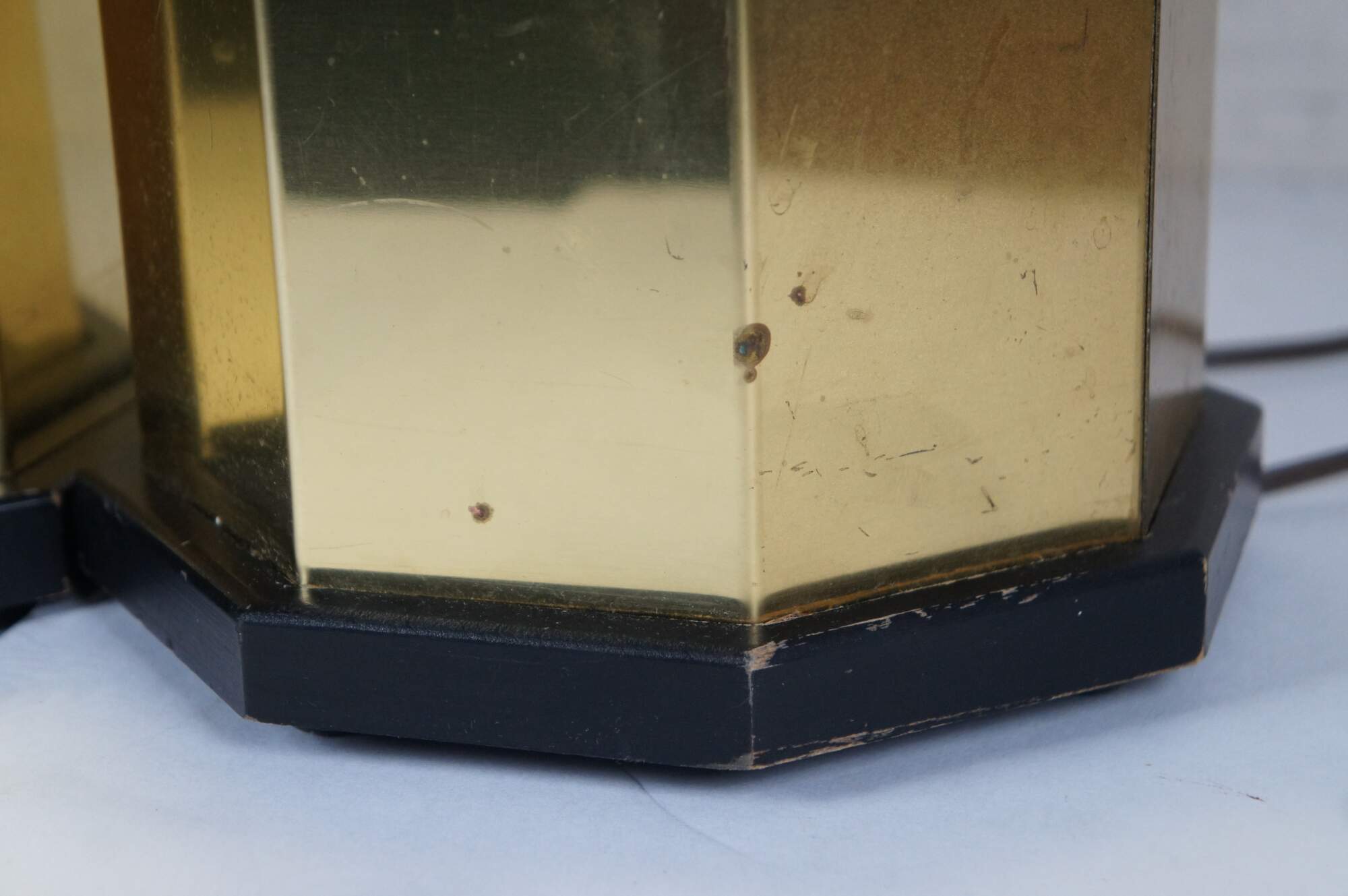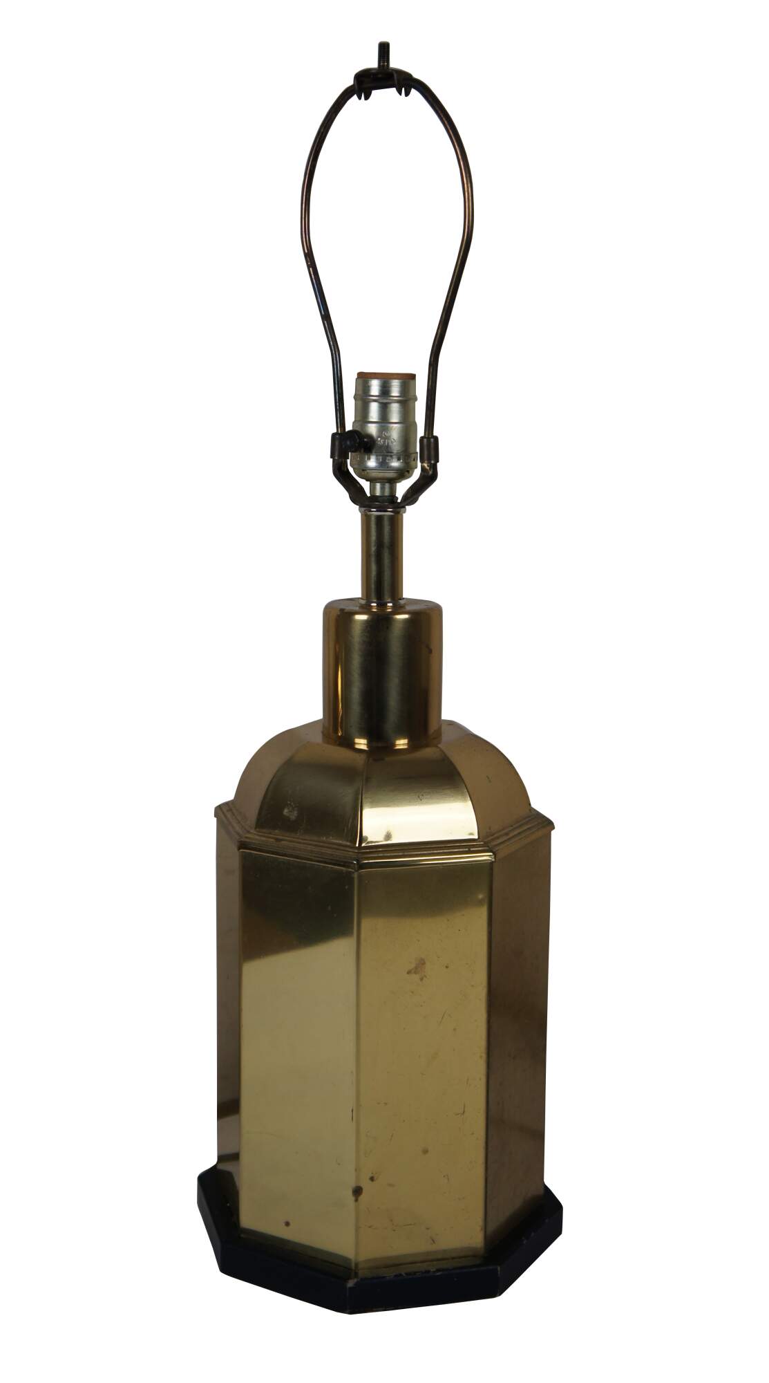 Pair of late 20th century Hollywood Regency / Chinoiserie octagonal brass tea caddy / canister shaped table lamps with black wood bases.