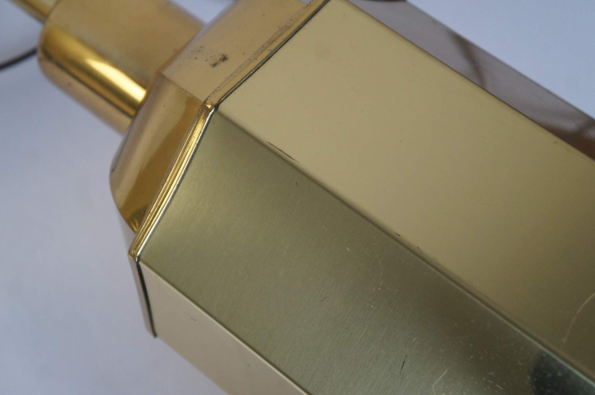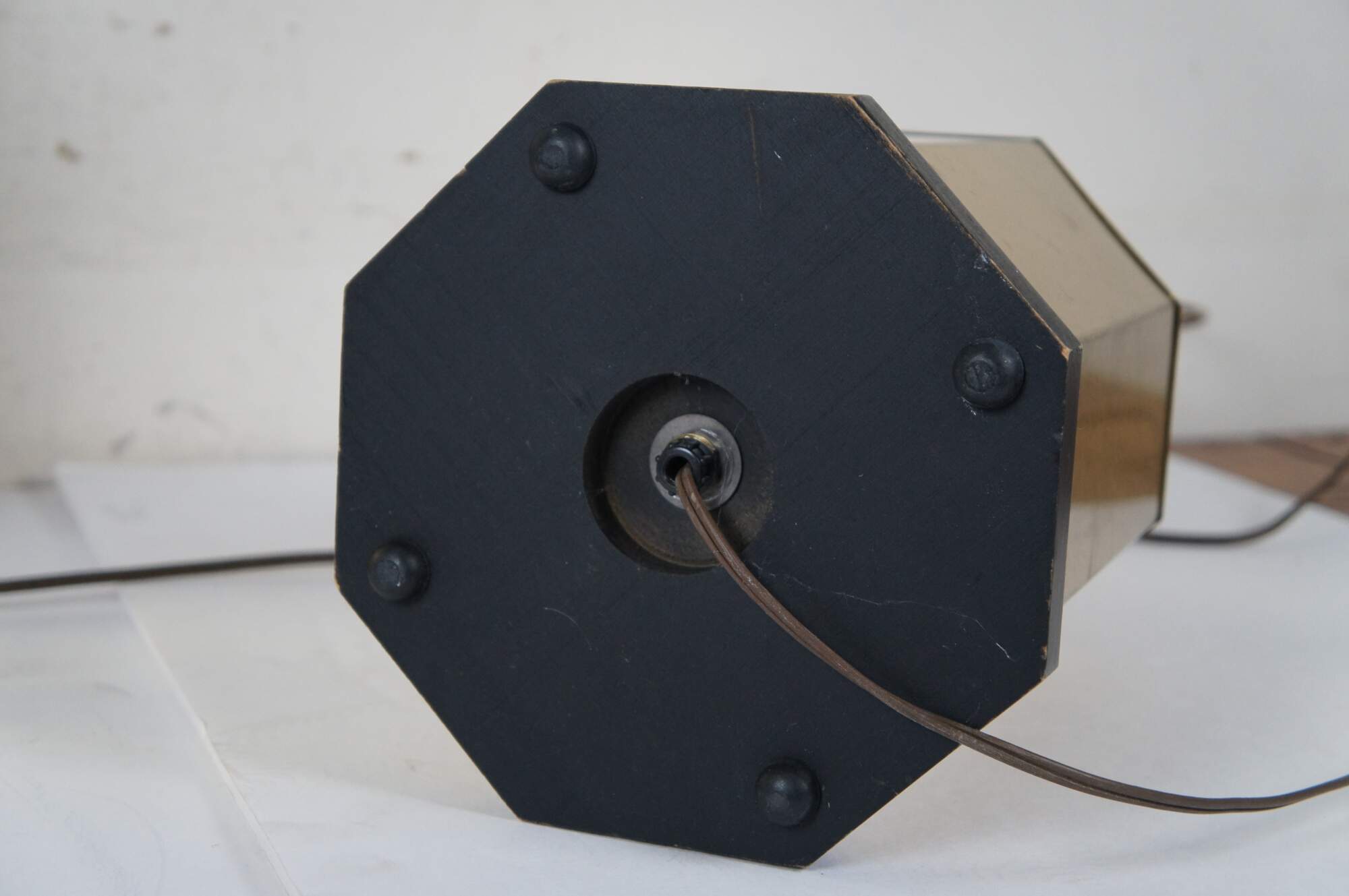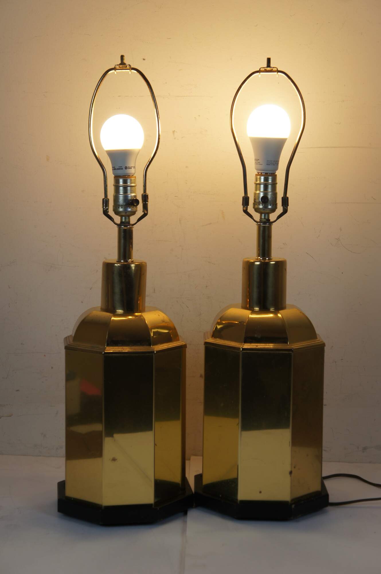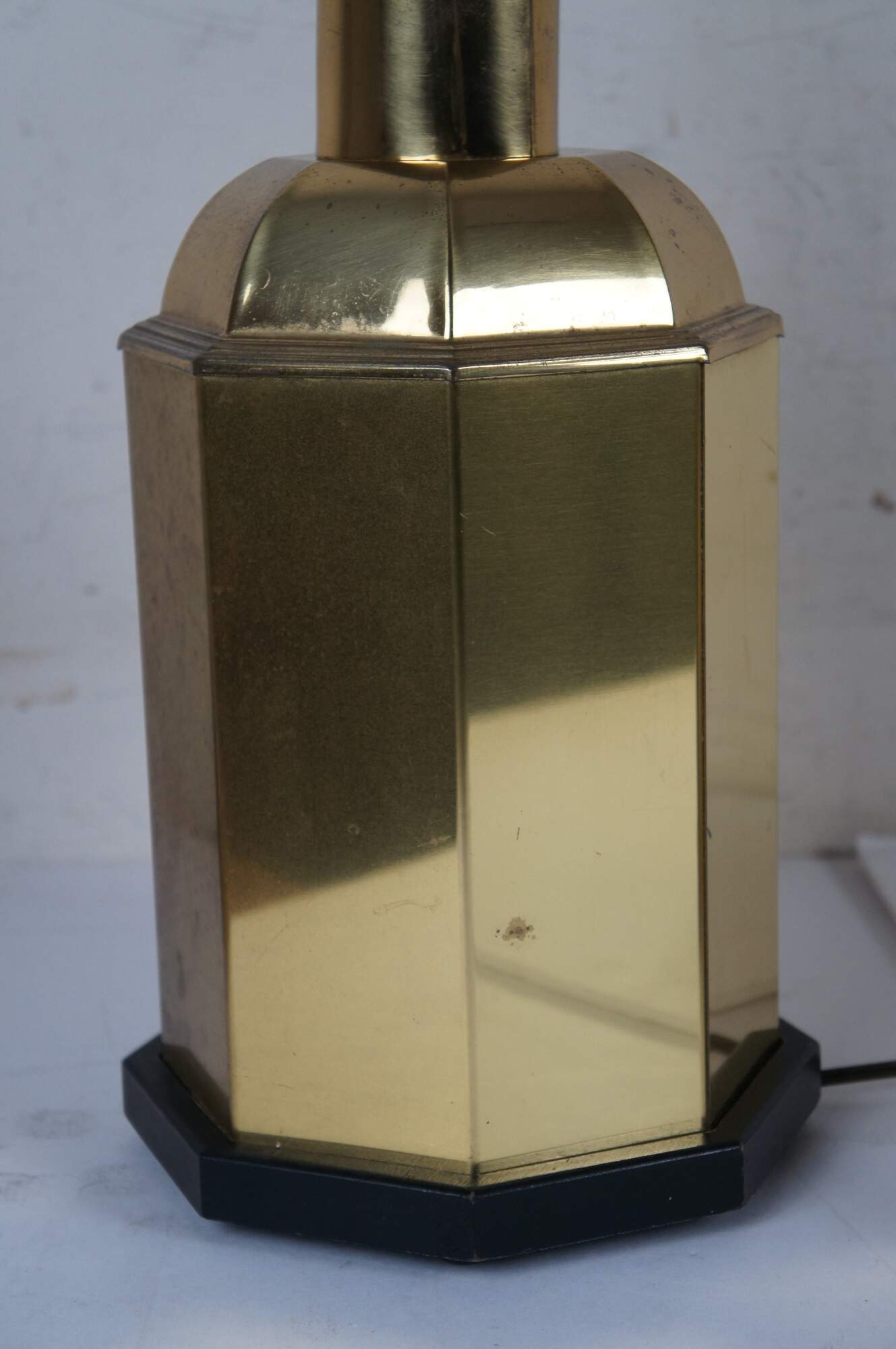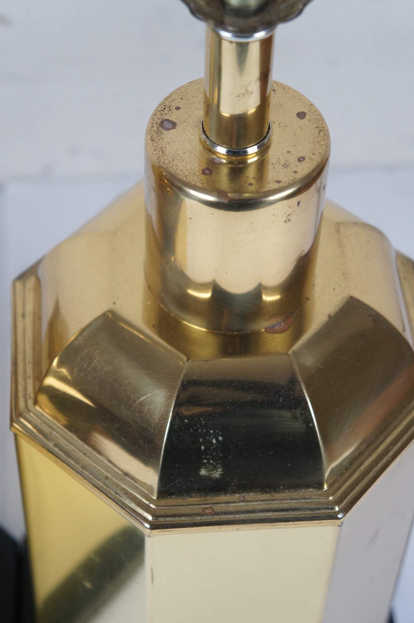 Pair of late 20th century Hollywood Regency / Chinoiserie octagonal brass tea caddy / canister shaped table lamps with black wood bases.