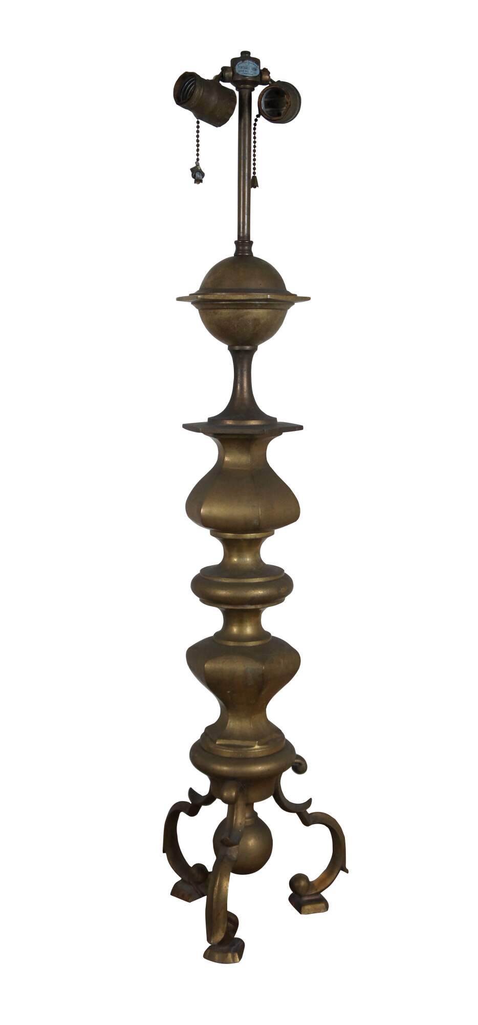 Pair of mid century Hollywood Regency Chapman brass two light table lamps, featuring a turned baluster design supported on three scrolled legs. Circa 1977.
