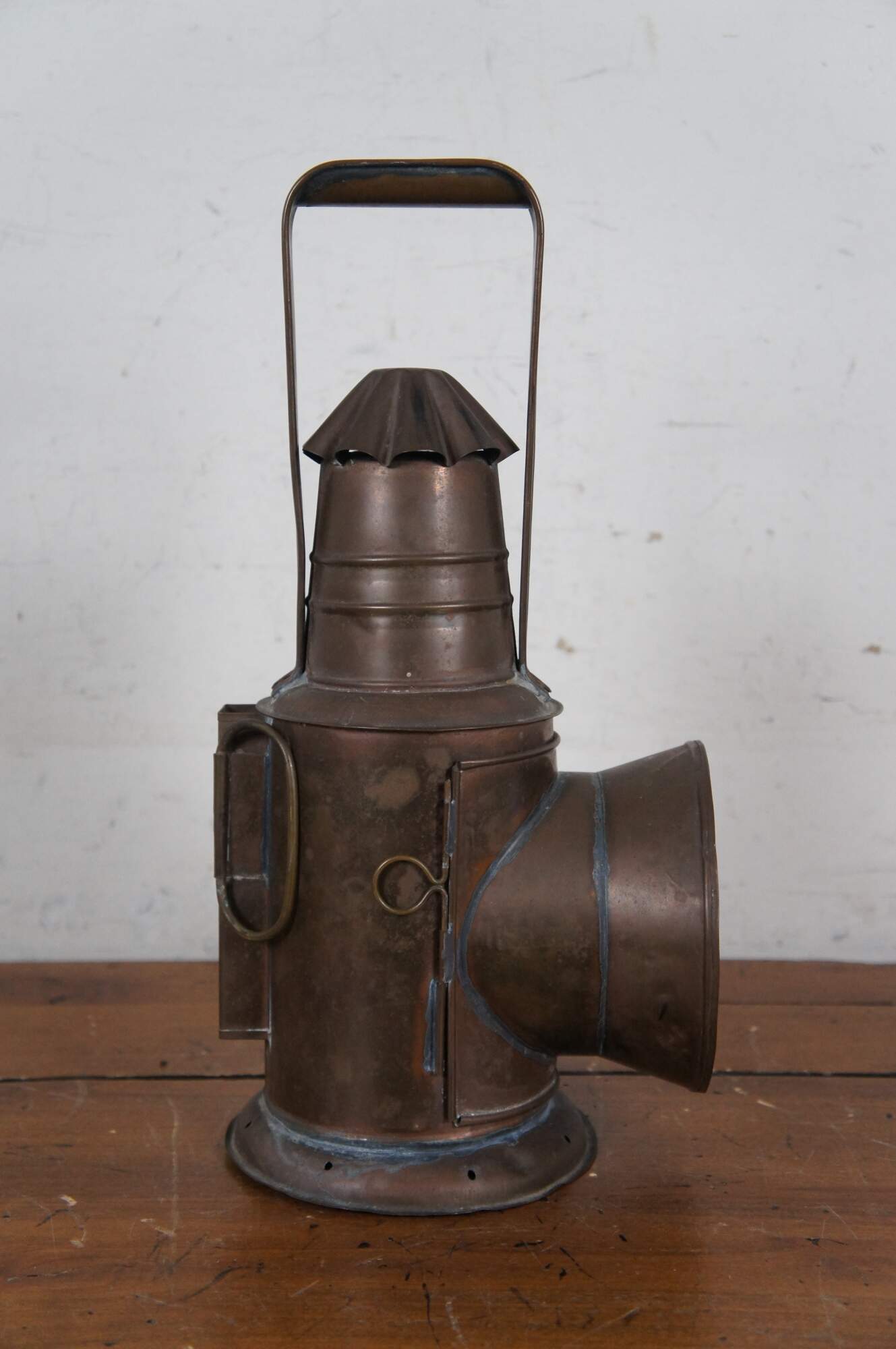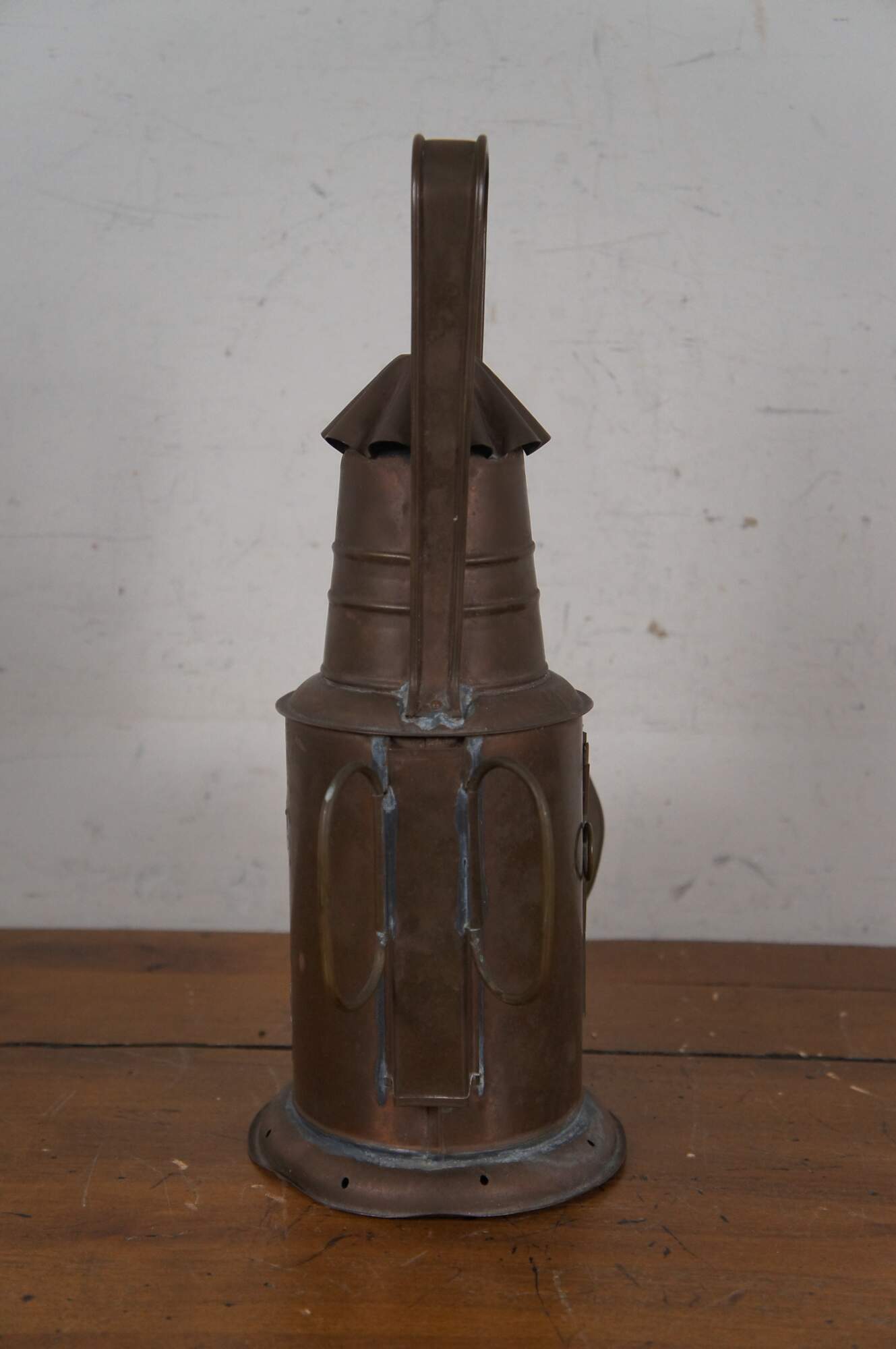 Antique copper police/ railroad / boat signal lantern / hand lamp. Features cylindrical body style, fluted cone shaped chimney top, and rear handles of a typical dark lantern but no internal shutter for hiding the light. Fixed rectangular bail handle on top. Thick ridged bulls eye glass lens. Front with lens opens via wire latch. Removable oil reservoir and wick. Attributed to Nippon Sento Co, LTD of Tokyo Japan.