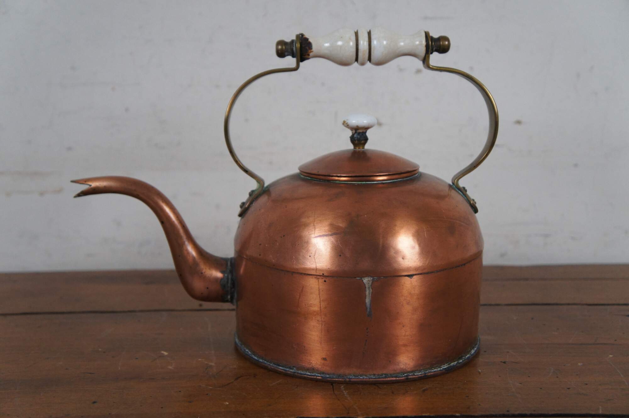 Late 18th century George III copper tea / water / coffee kettle with right angle gooseneck / bird spout, fixed brass handle with turned ceramic / porcelain grip and mushroom shaped porcelain finial on the lid.