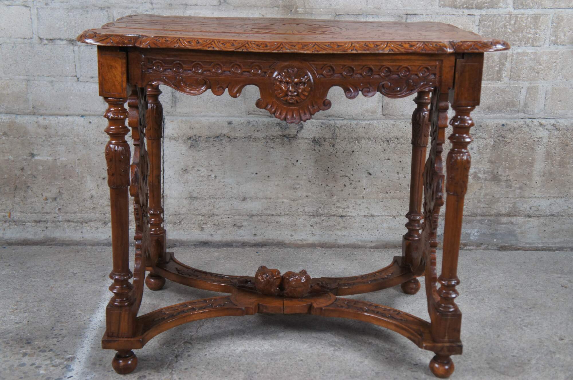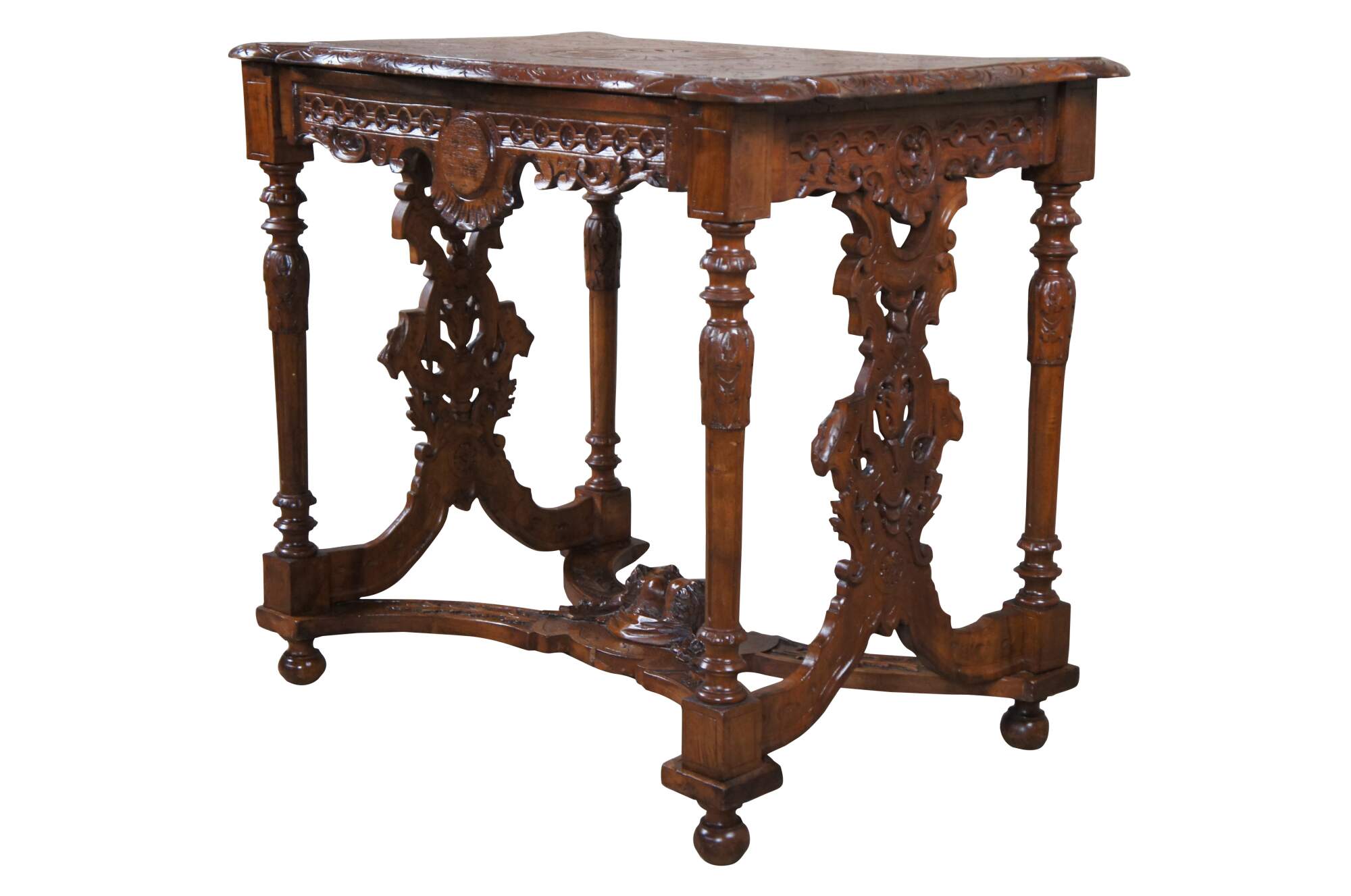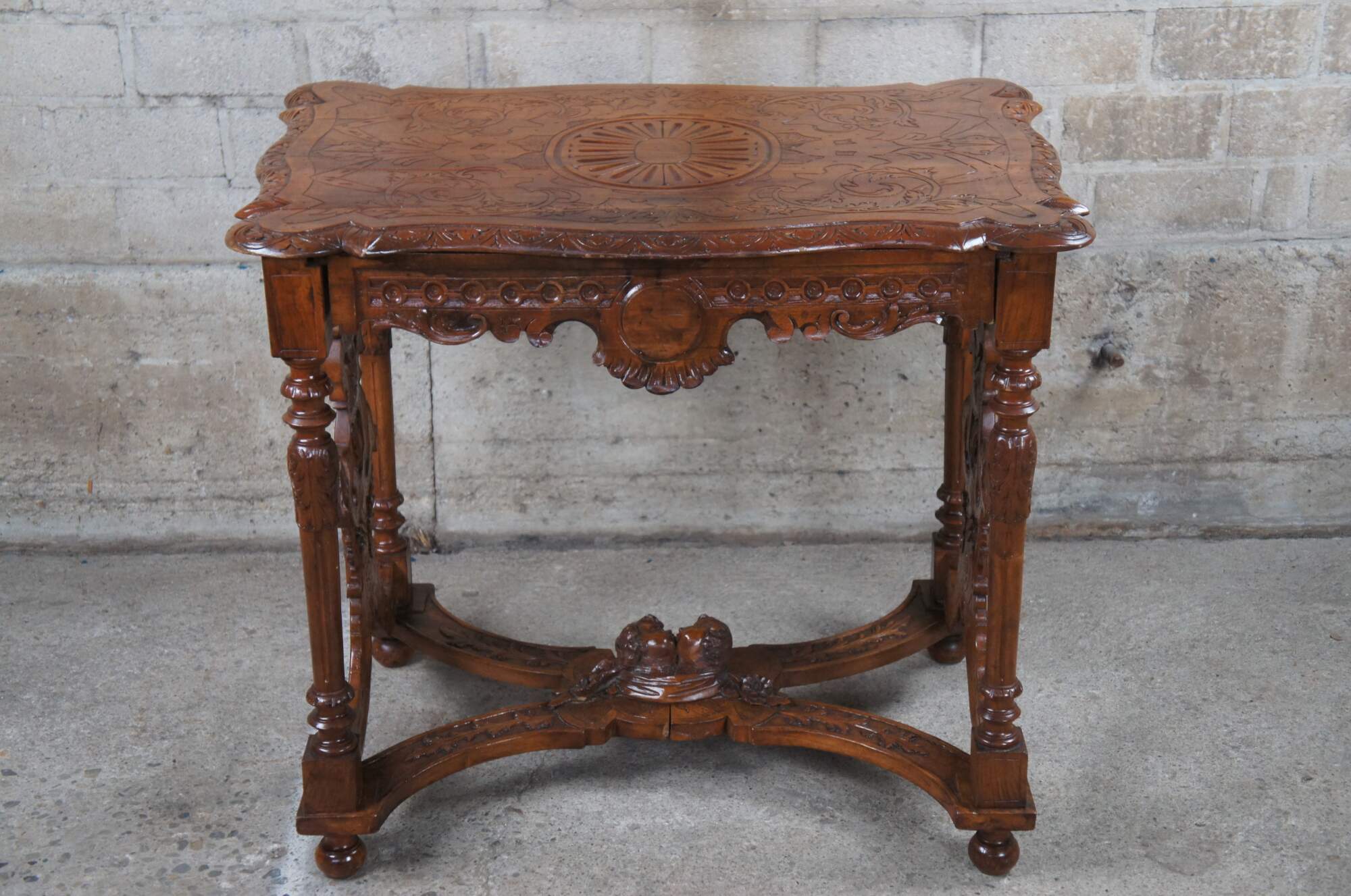 Antique Neo-Renaissance Revival parlor / library table or writing desk, circa 1870s Made of walnut featuring Neoclassical styling with high relief figural carvings of cherubs / puttis and acanthus / floral designs. The table has a carved top with one long drawer and pierced / reticulated sides, over turned legs connected by serpentine stretcher with cherub busts.