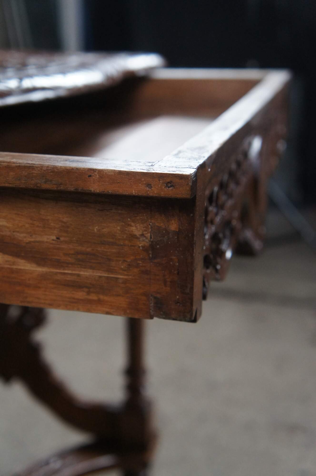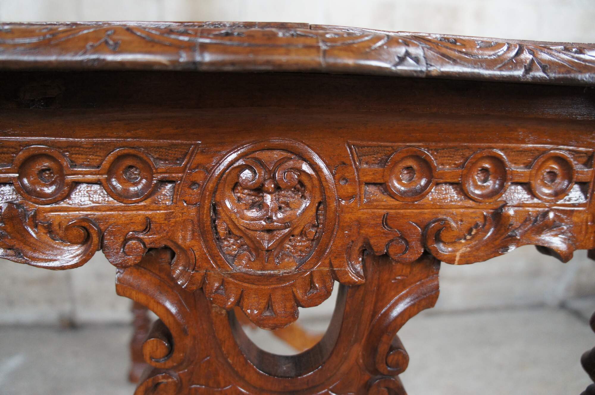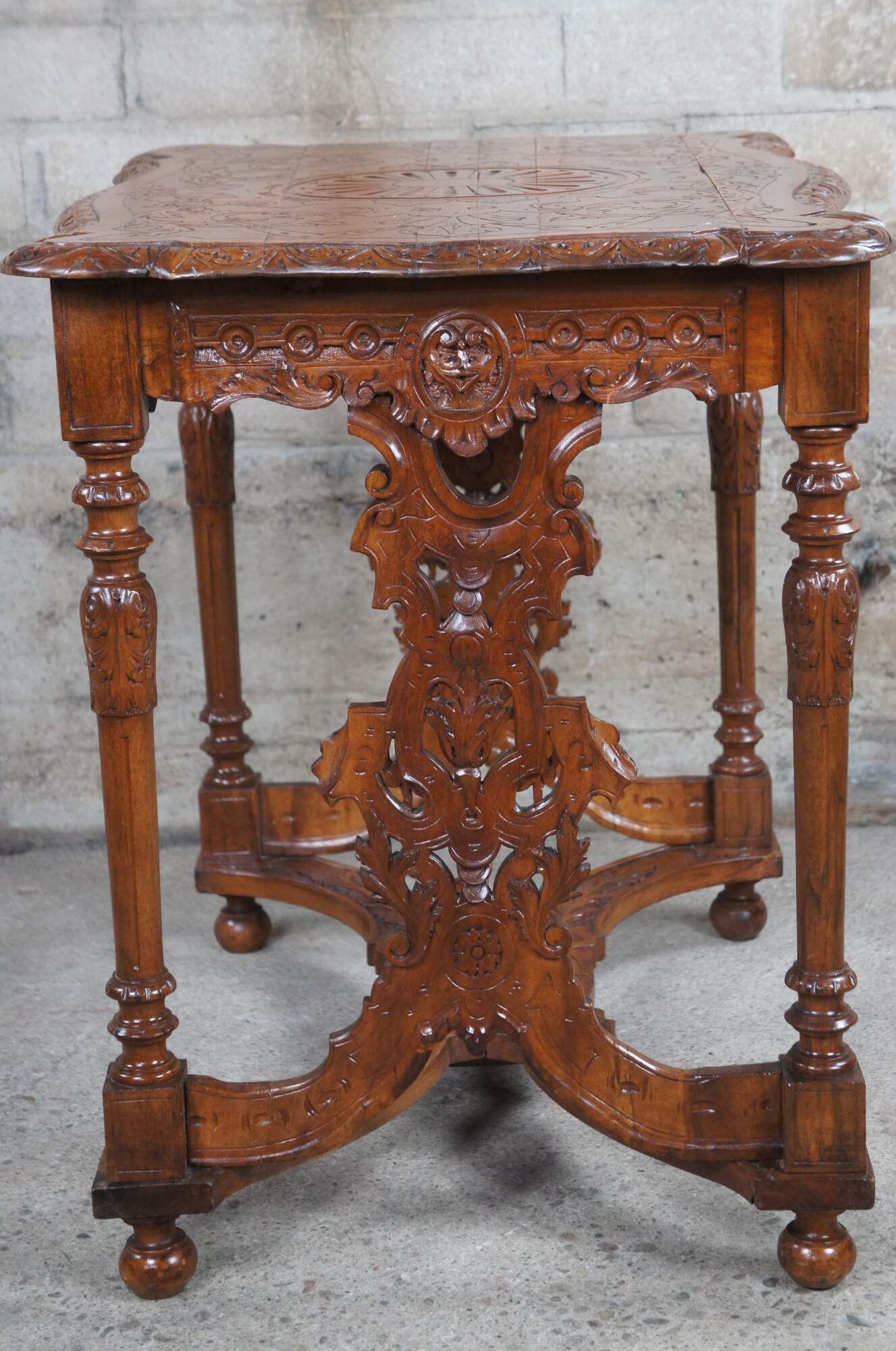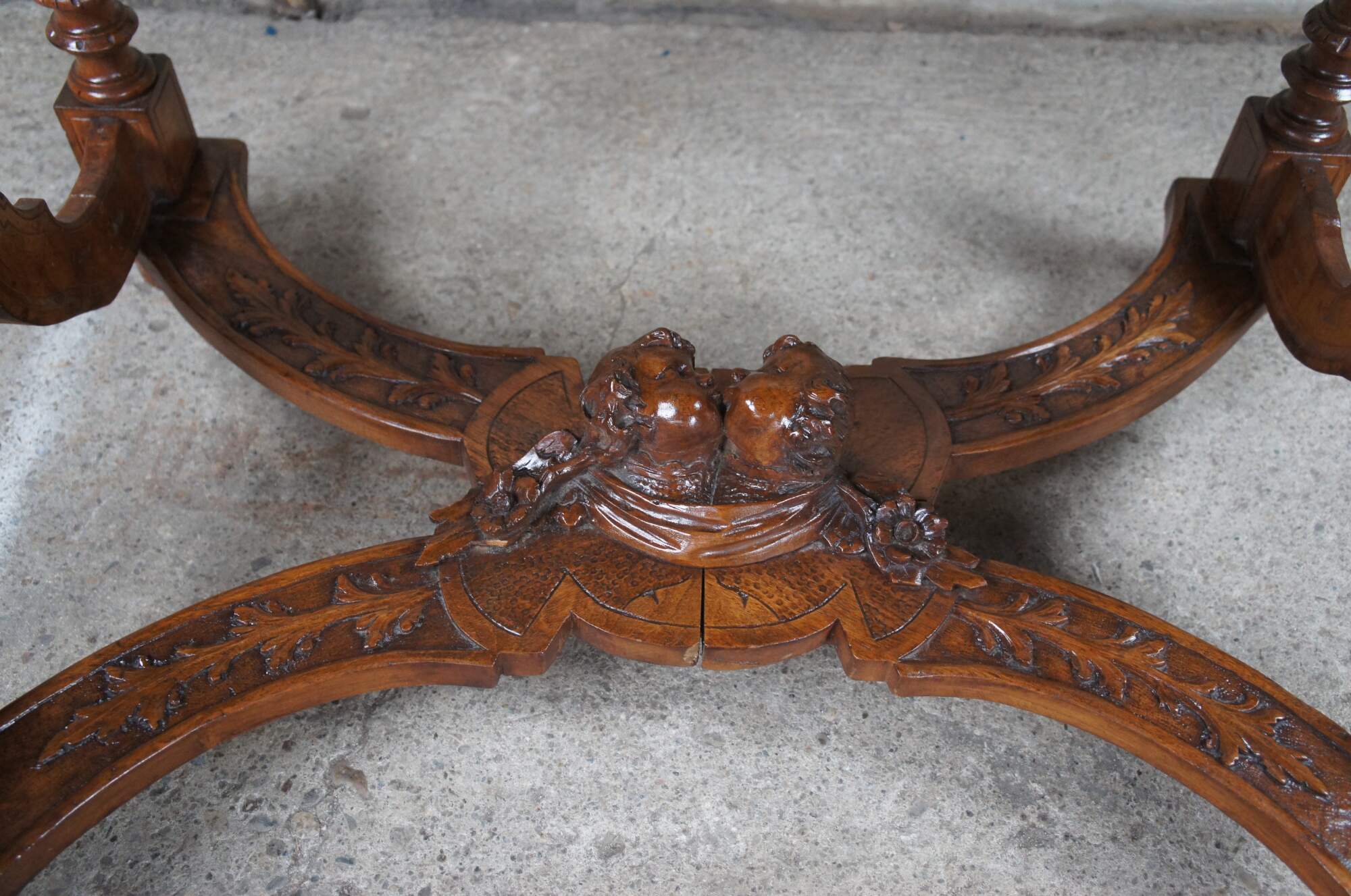 Antique Neo-Renaissance Revival parlor / library table or writing desk, circa 1870s Made of walnut featuring Neoclassical styling with high relief figural carvings of cherubs / puttis and acanthus / floral designs. The table has a carved top with one long drawer and pierced / reticulated sides, over turned legs connected by serpentine stretcher with cherub busts.