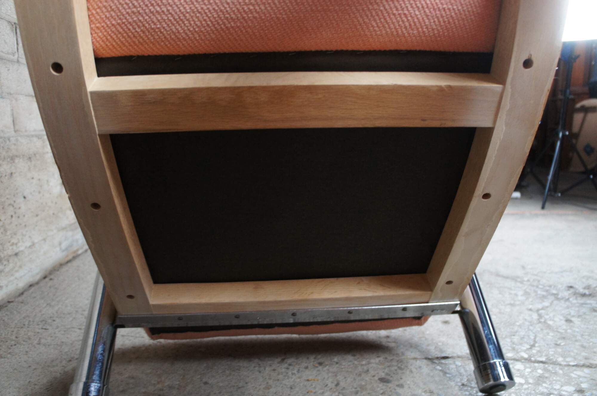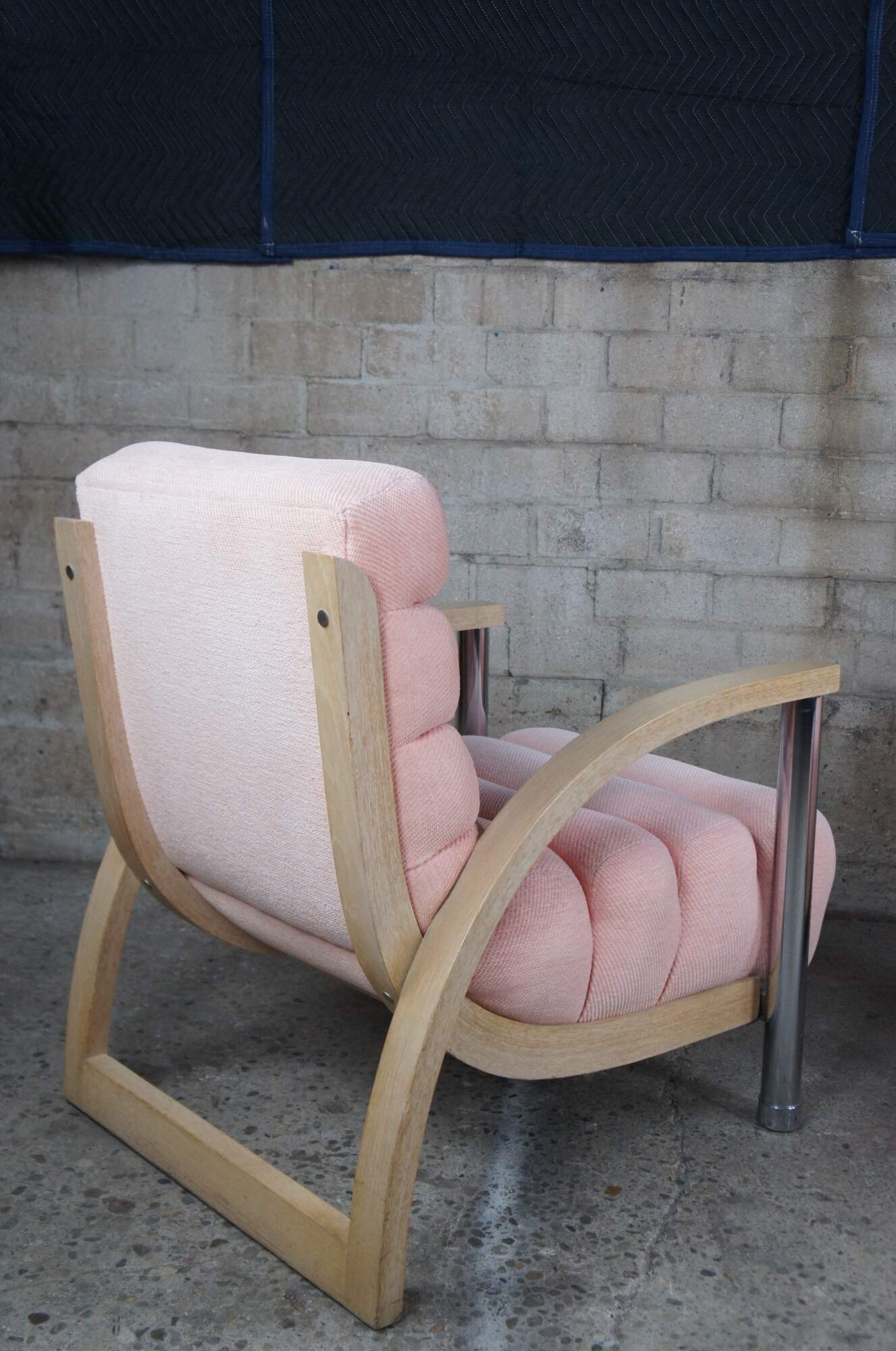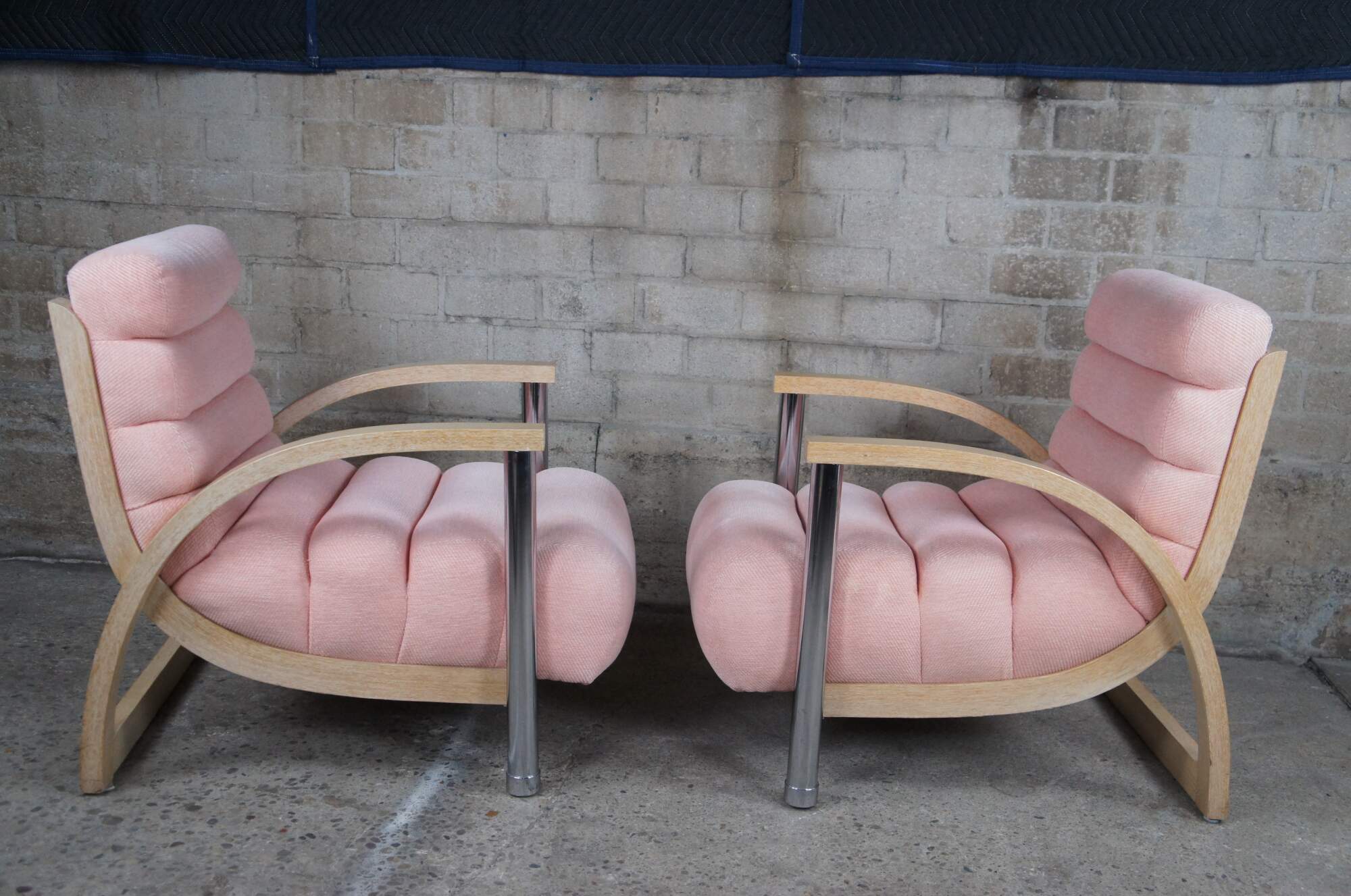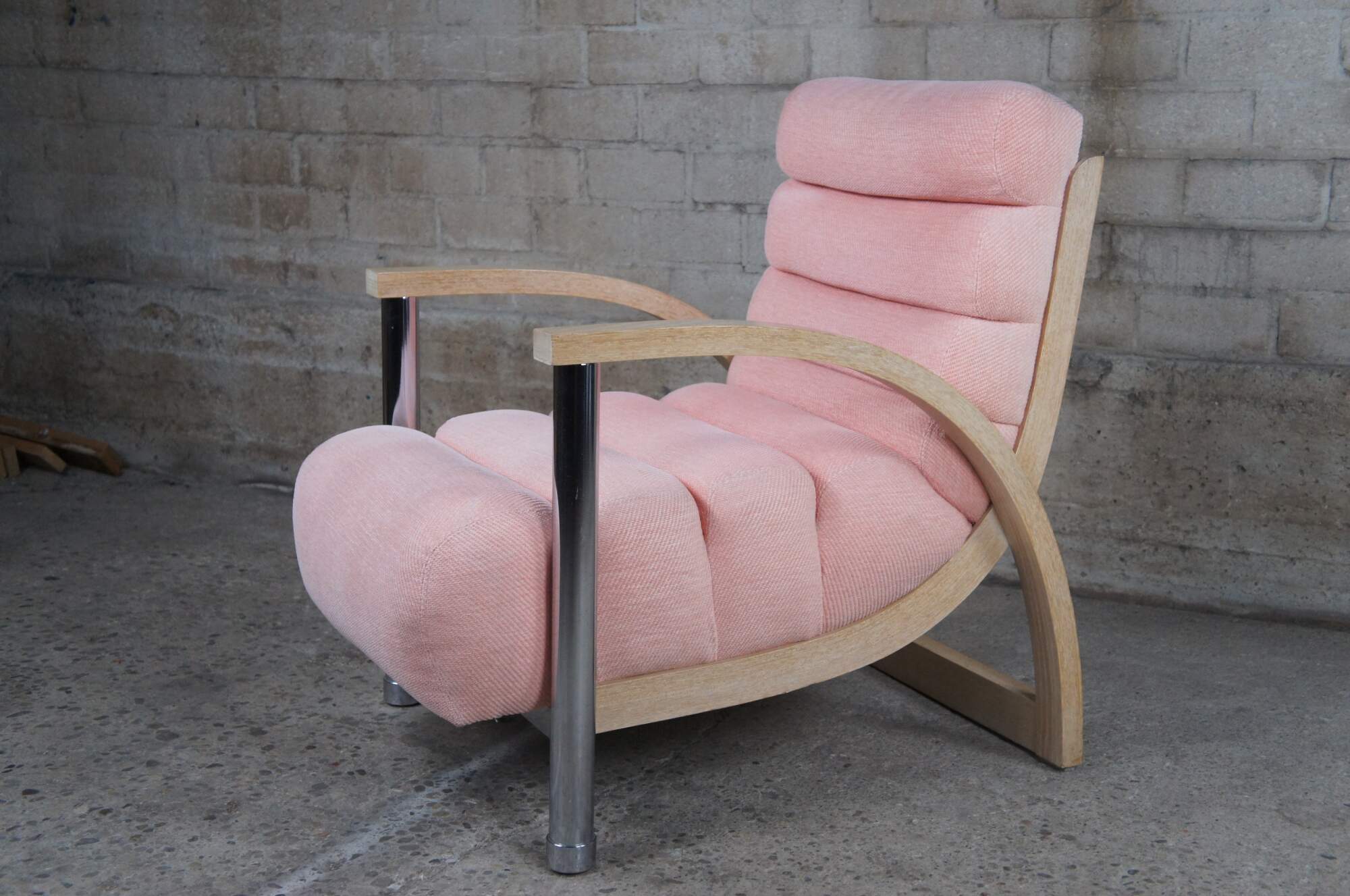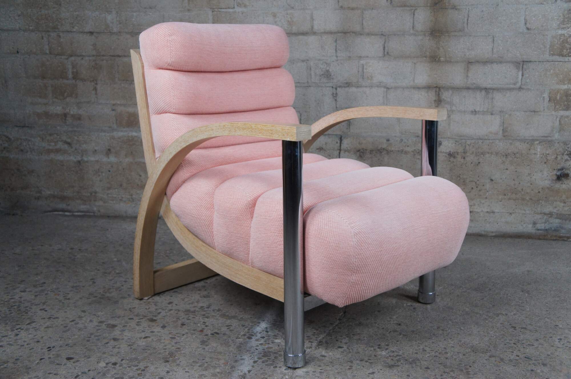A beautiful pair of two "Eclipse" club / library / lounge chairs by Jay Spectre for Century Chair Comapny of North Carolina, circa 1980s. The chairs feature sculptural form, made from Cerused Oak and tubular chrome with channeled salmon / pink upholstery.