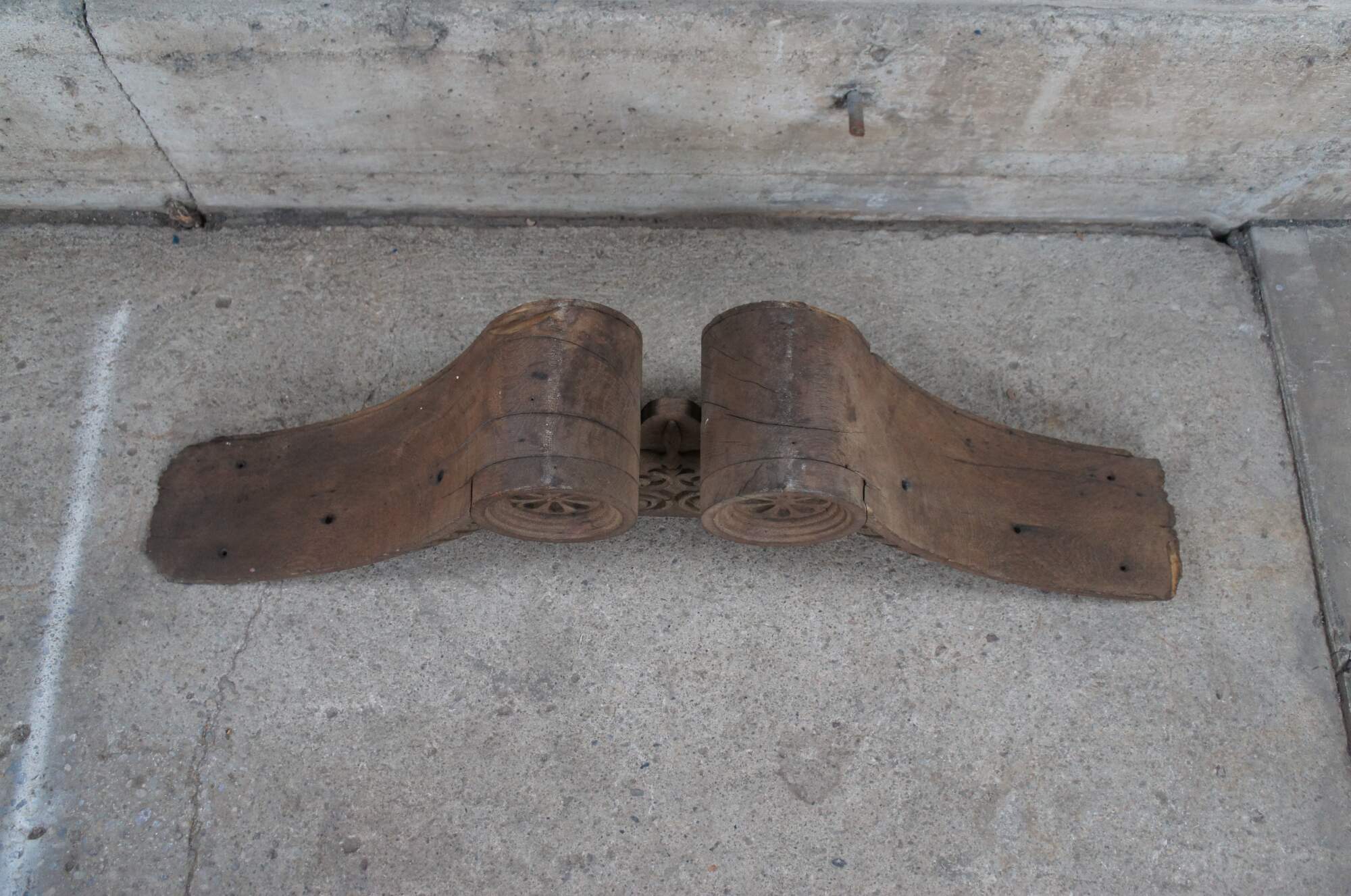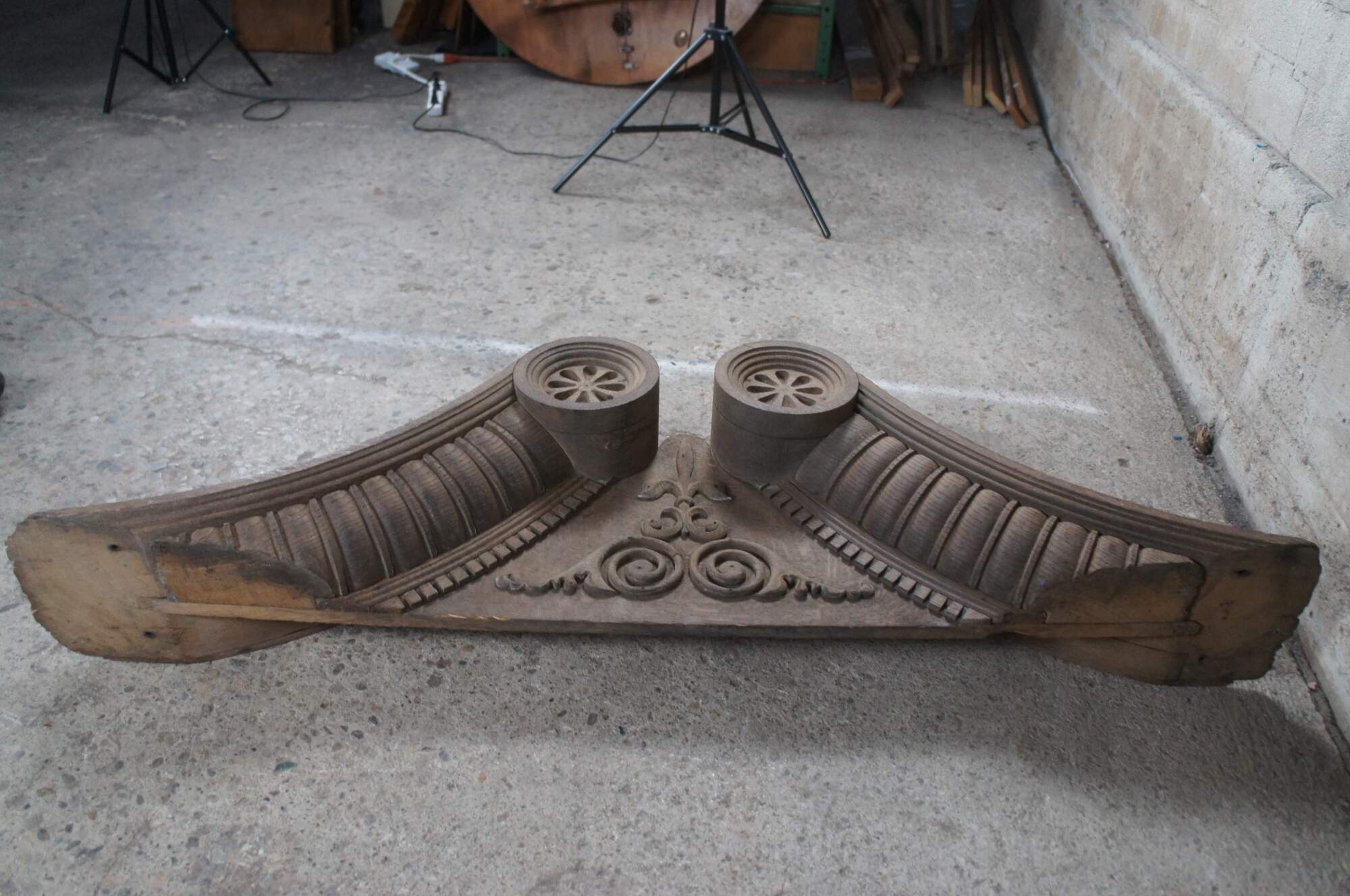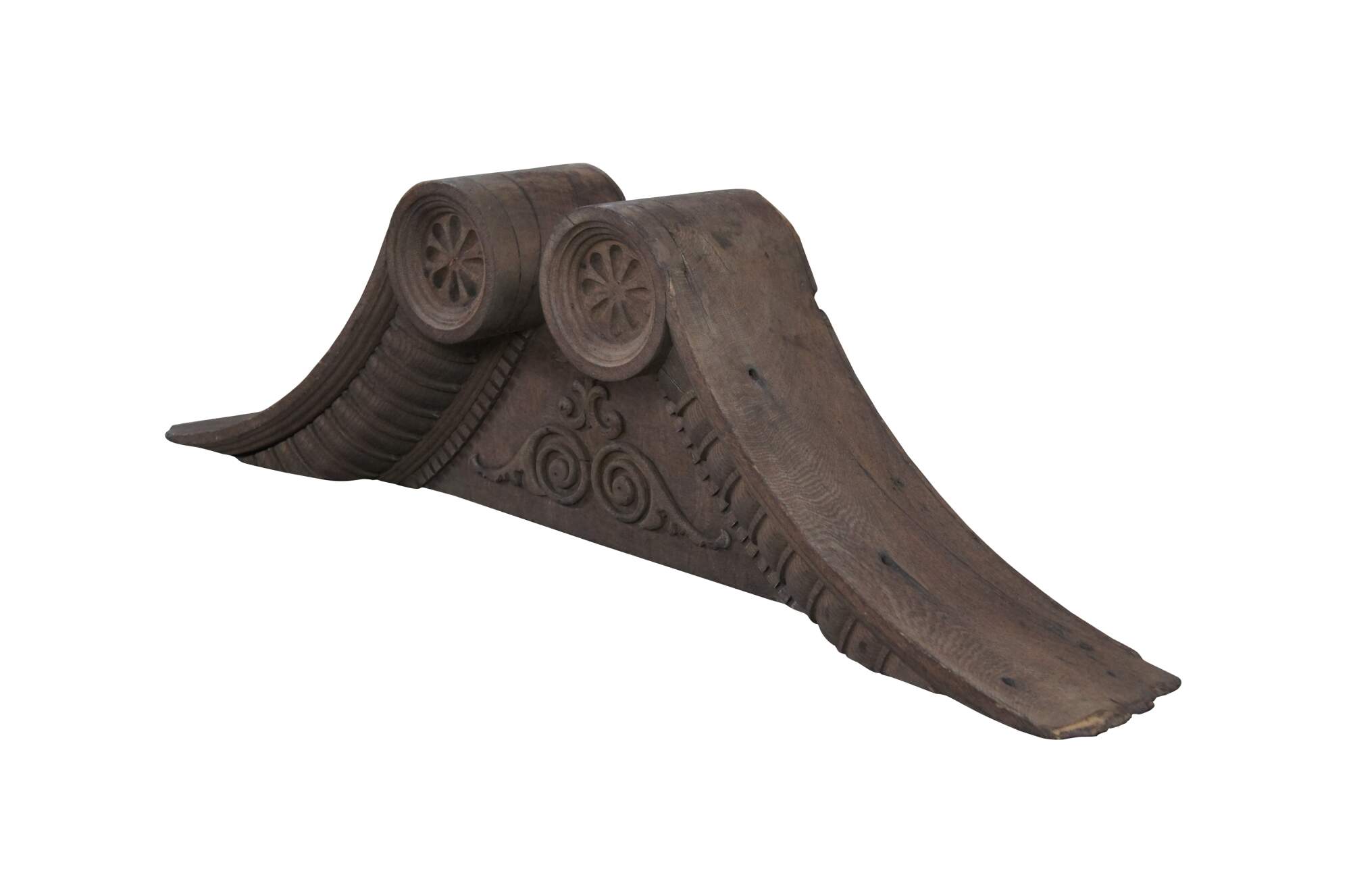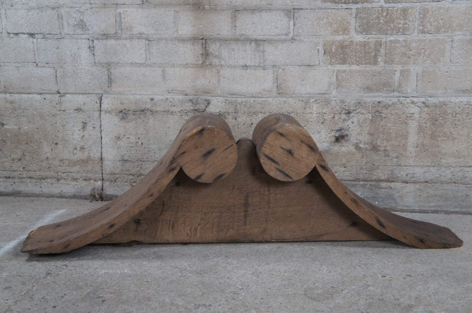 Antique Victorian fireplace mantel topper crown featuring scrolled pagoda form with carved medallions, gadrooning and dentil molding. This crown came from an estate in Orcas Island, Washington. It was meant to go on top of a 10' mantel but the ceiling did not allow the crown to fit. Its robust size and detailed carvings make for the perfect crown to a china cabinet, curio or bookcase.